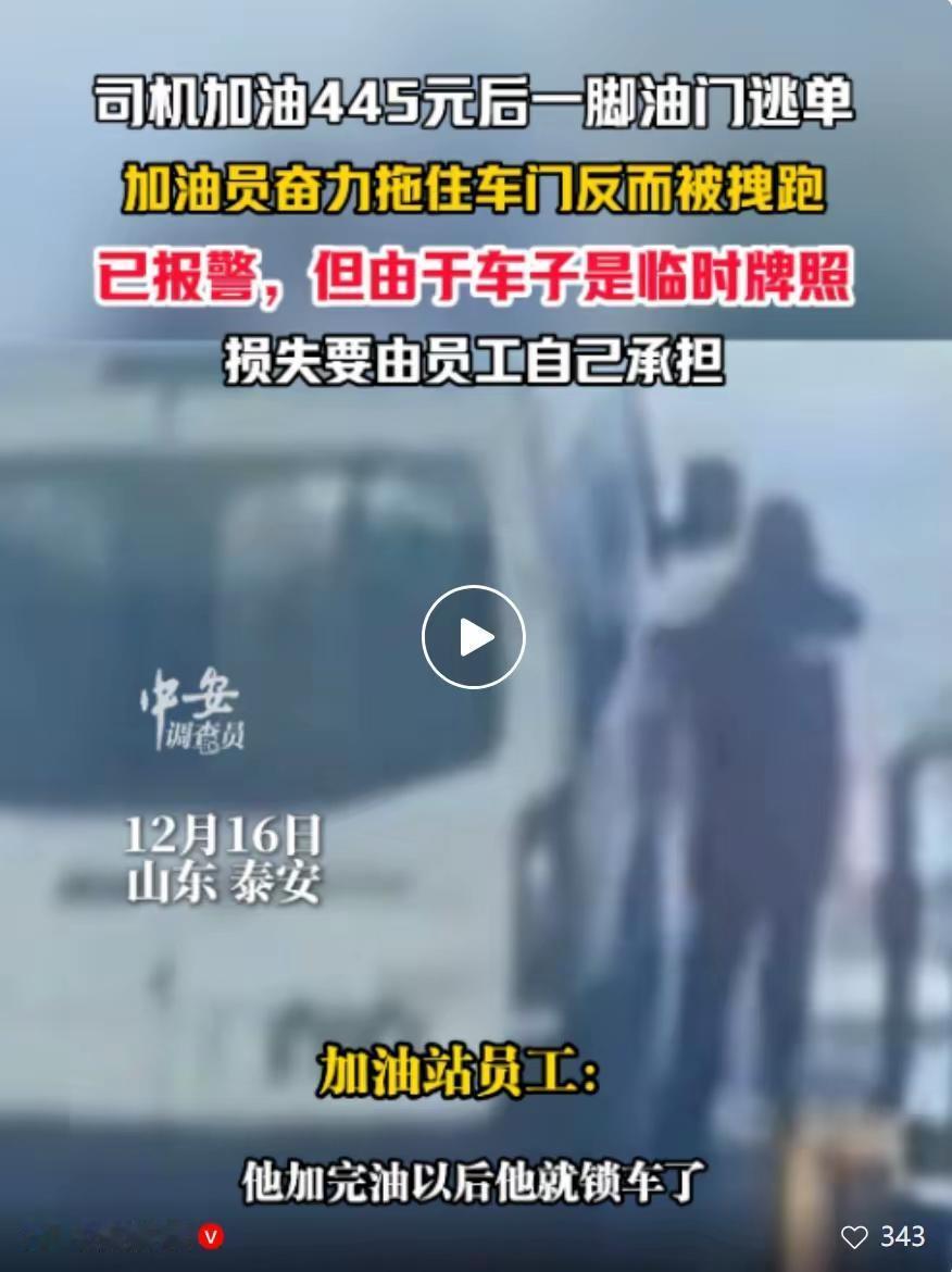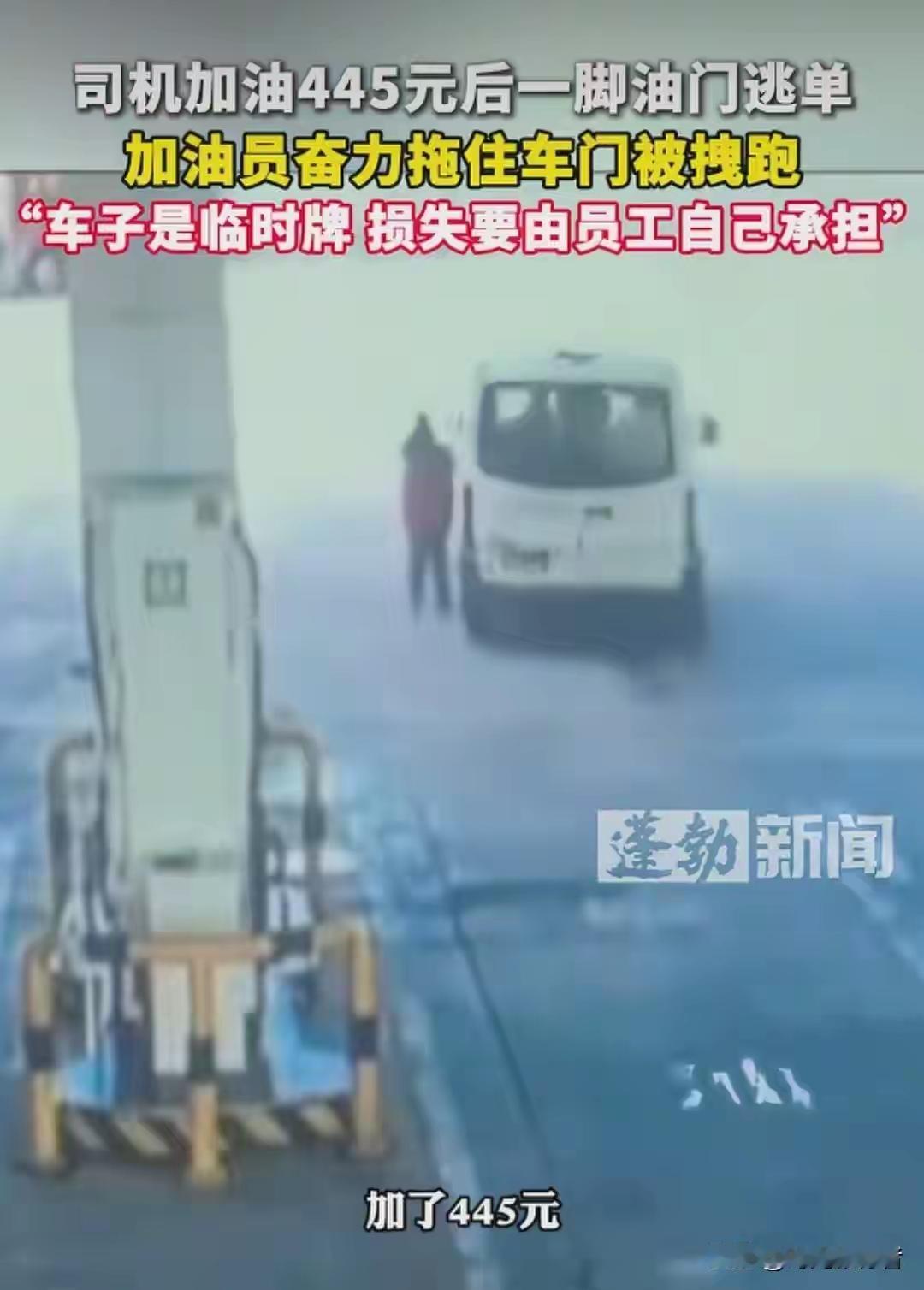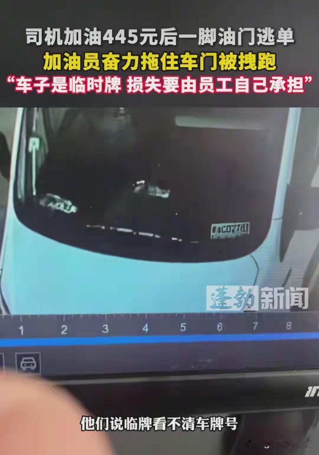 山东泰安一个加油站16号给一个车加满油总共油费445块钱,司机加满油后直接锁车开走了,加油员想拽着车门跟上结果是被甩了下来,车逃跑了,由于车是临时号牌,加油员没有记住,己经报警了,警察正在调查,但是油费由加油员承担,这个司机太缺德了,买的起车却是加不起油,必须要严惩不贷。