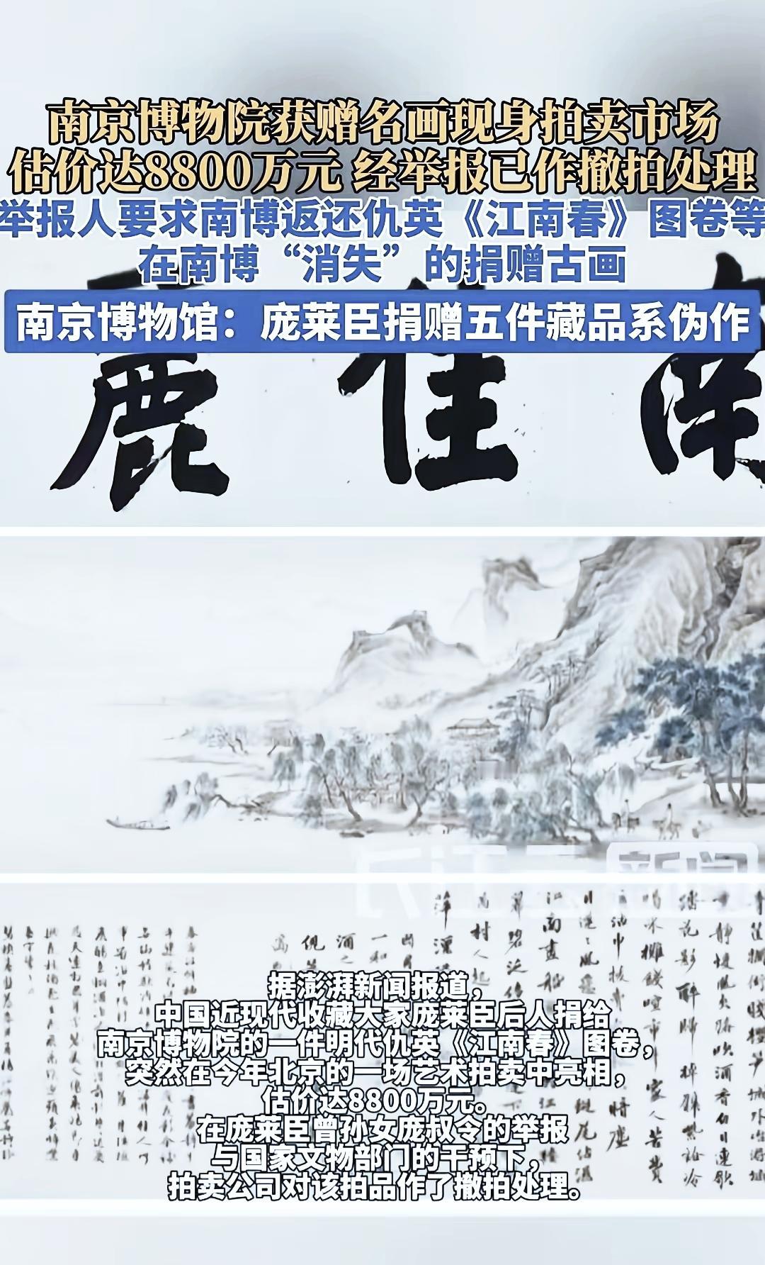 一幅捐赠给博物馆的名画现身拍卖市场,估价高达8800万,幸得捐赠者庞莱臣的曾孙女庞叔令举报,经国家文物部门干预后画作被撤拍。 庞叔令随后起诉南京博物院,要求返还这幅“消失”的古画,并申请法院强制院方提供画作详细流转材料。 但南京博物院至今未能给出画作下落的有效证据,此事亟待彻查,给捐赠者后人一个交代,否则将寒了公众向国家捐赠文物的心。