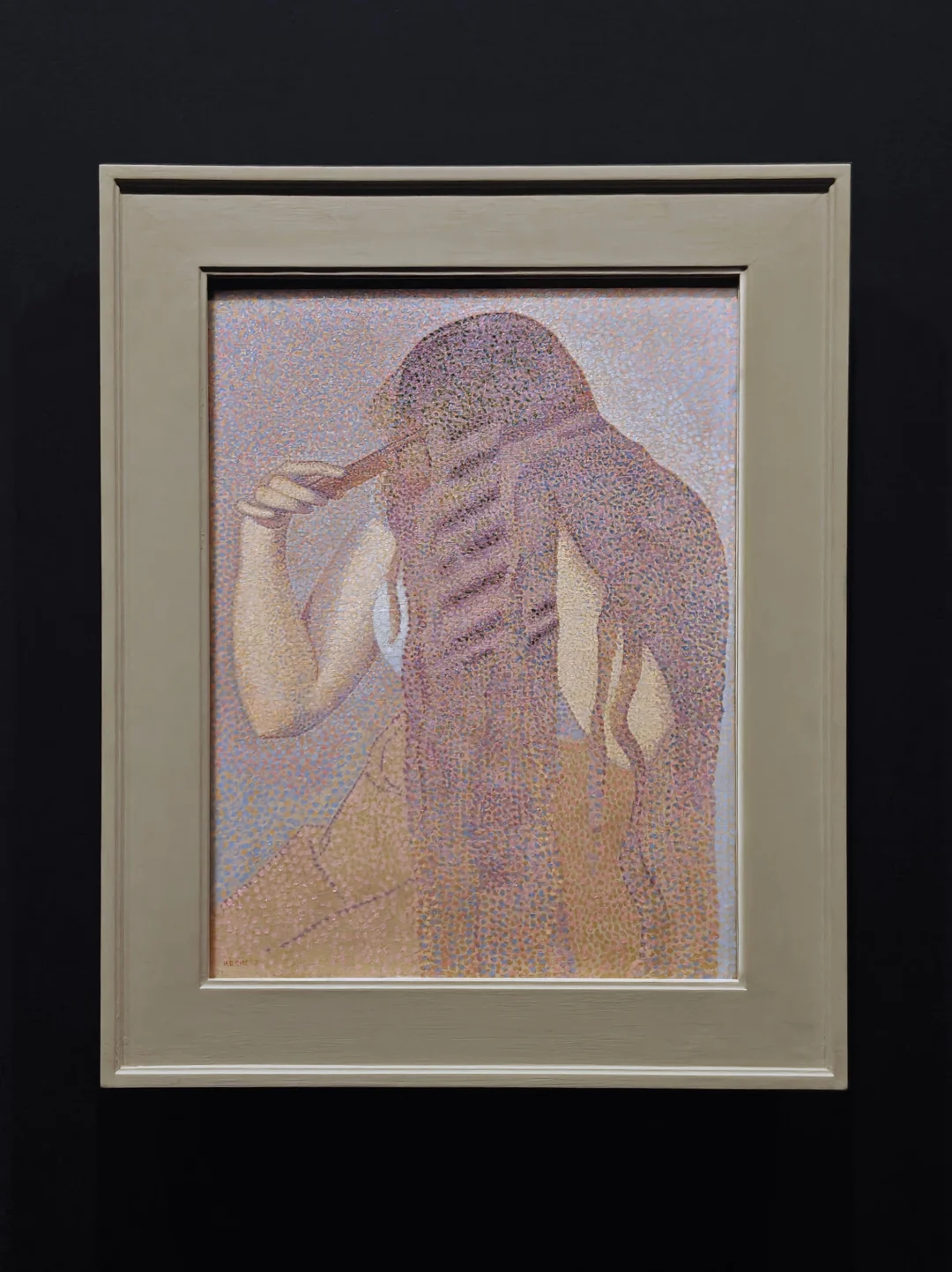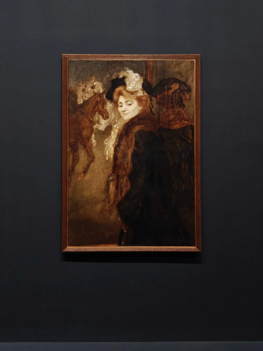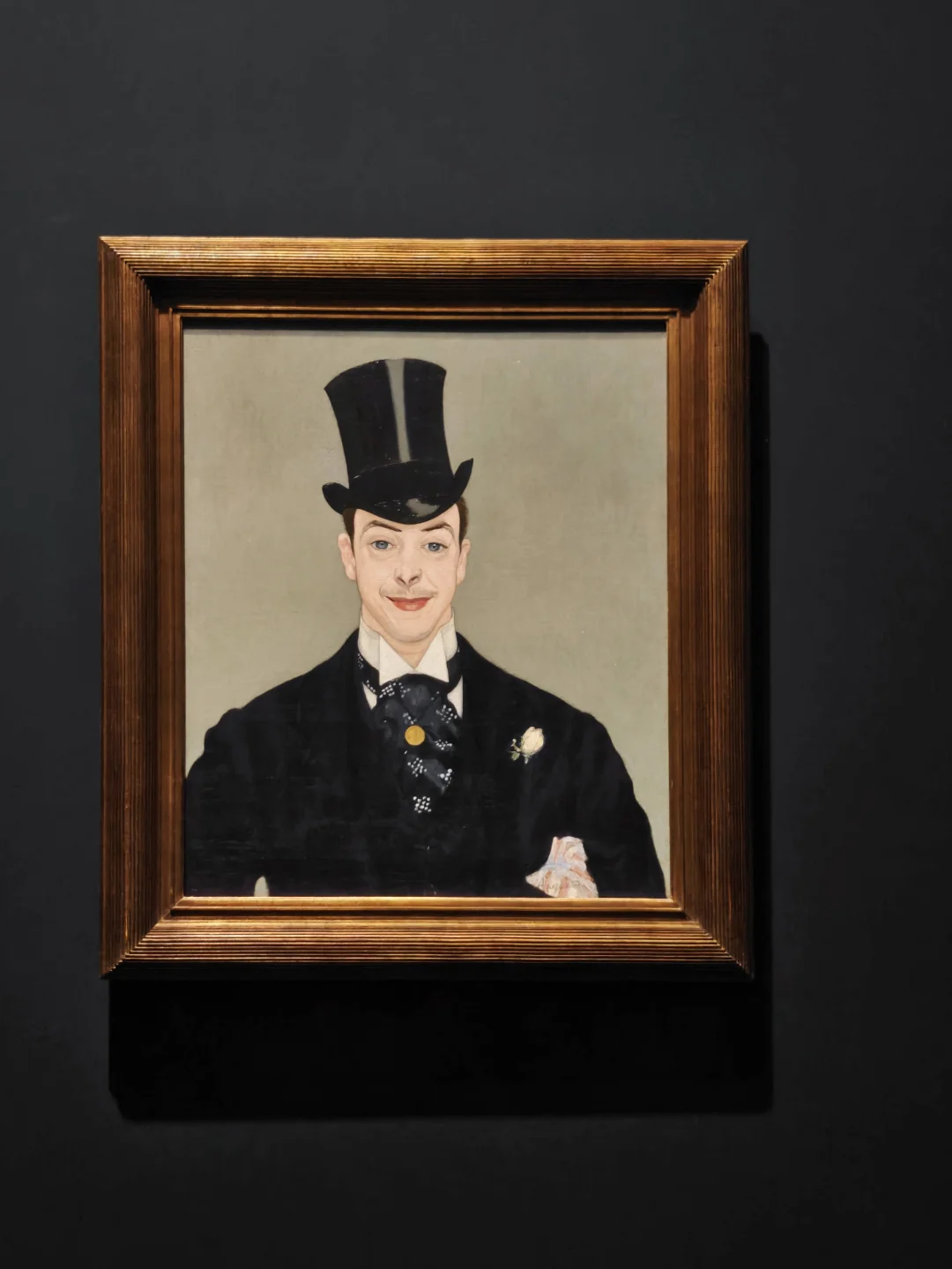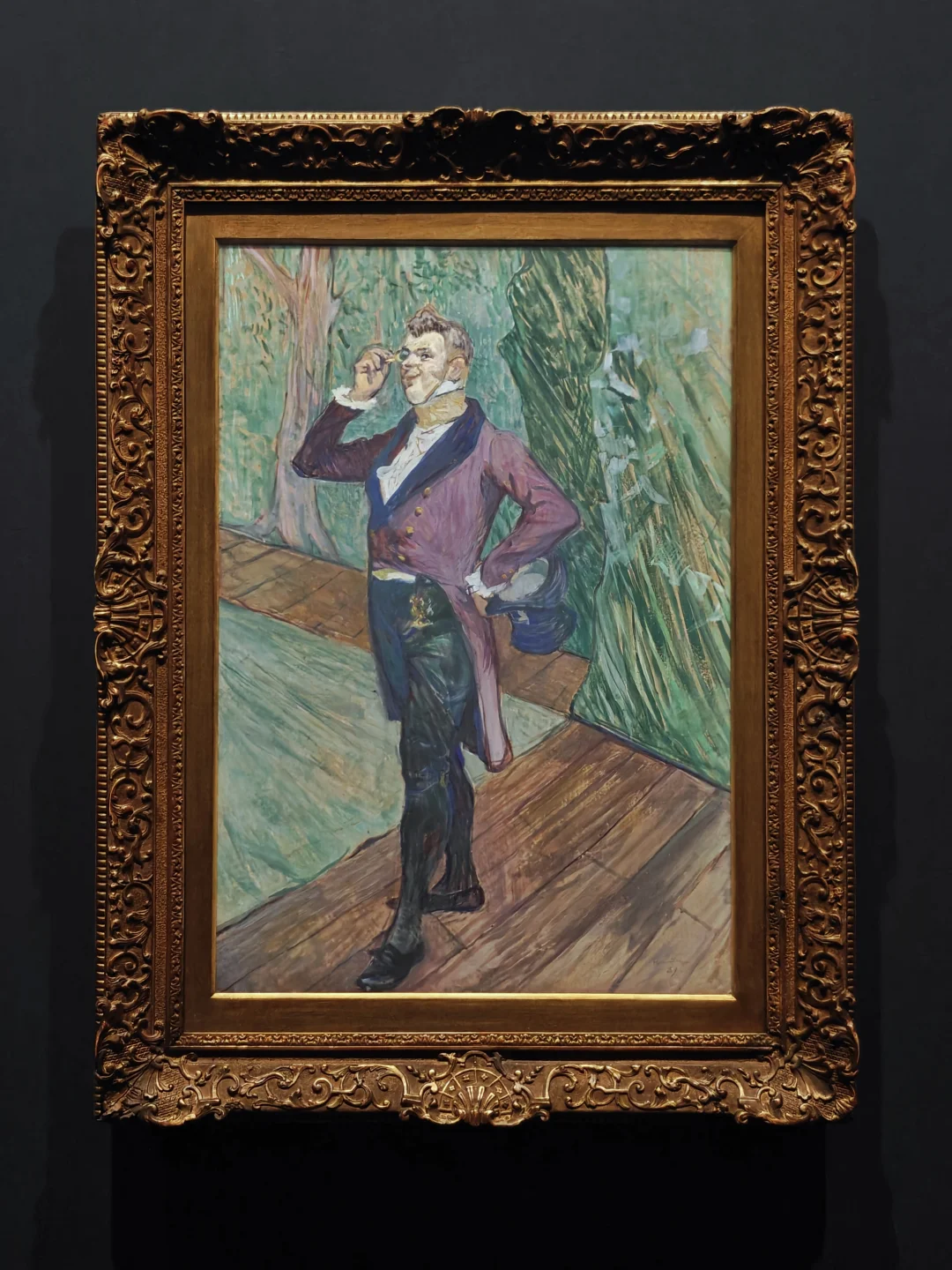 画中的自信姿态的男性是出身戏剧的世家法兰西喜剧院著名青年演员Henry Samary(学院派单元中出现过的Madeleine Brohan是他姑妈),劳特累克以大胆而富有表现力的笔触捕捉人物神韵,服饰的海军蓝与周围环境浅暖色调的色彩互动强化了演员作为视觉焦点的地位。