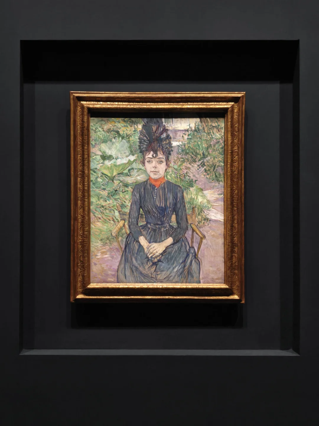 这个对公众开放的半野生半人工花园式小公园是森林神父(Père Forest)的所有物,在劳特累克工作室附近,因此他常来露天作画。颜料几乎没有调和稀释,厚涂笔触长而宽,这些都有着梵高的影子。画中女子的衣裙与帽子是画家标志性的蓝中透紫色调,佩戴的红色围巾和过分艳丽的绿色主调花园背景形成强烈对比。人物姿势稍显僵硬,目光直视观者,似乎想有所互动。虽然这幅画注明了姓名,但我们仍未知此女子的任何更多信息,正如艺术家经常描绘的无名底层演艺圈女性一般。