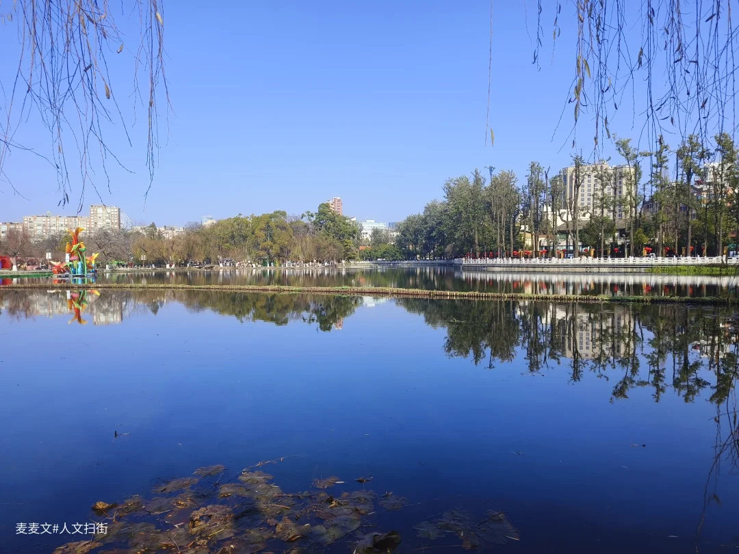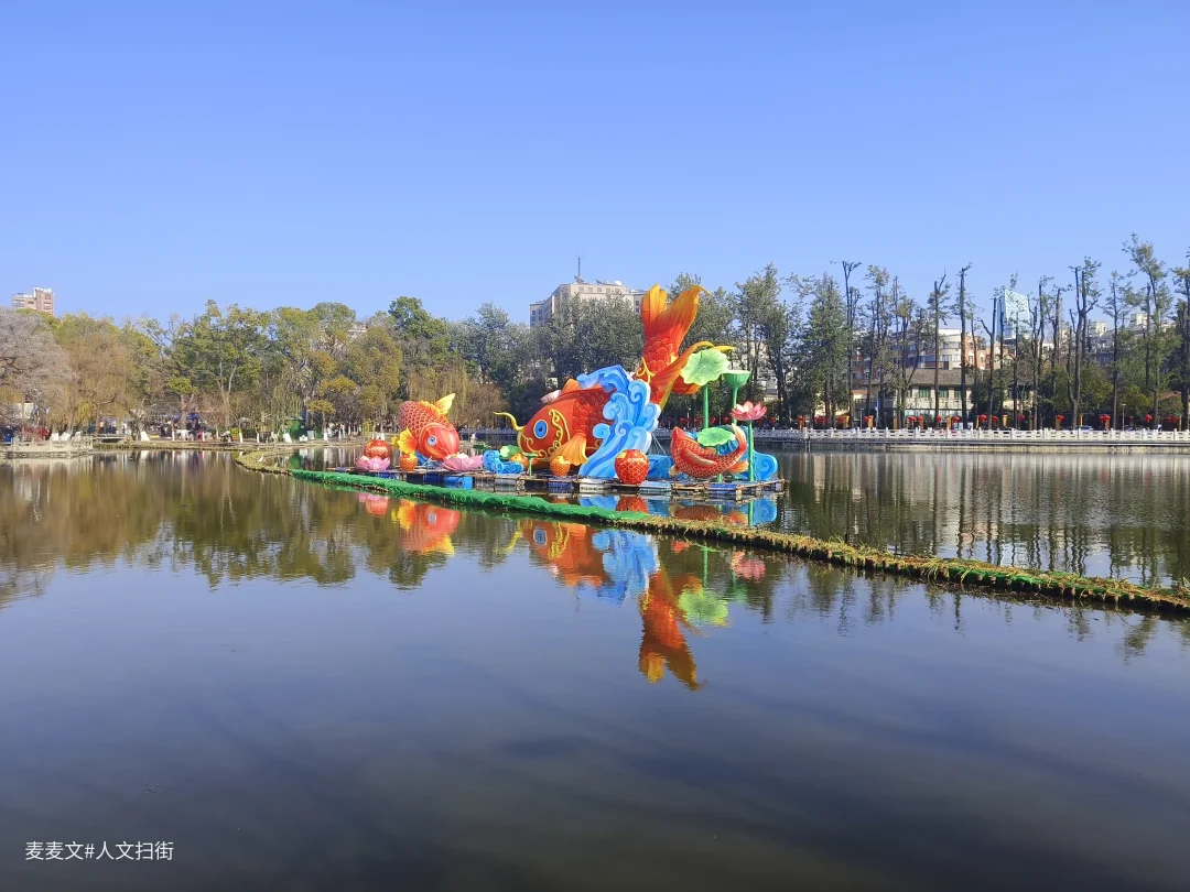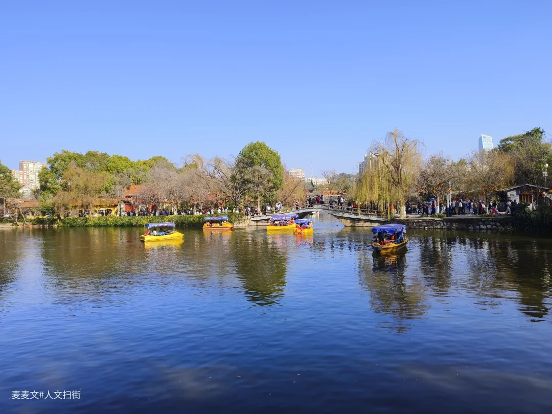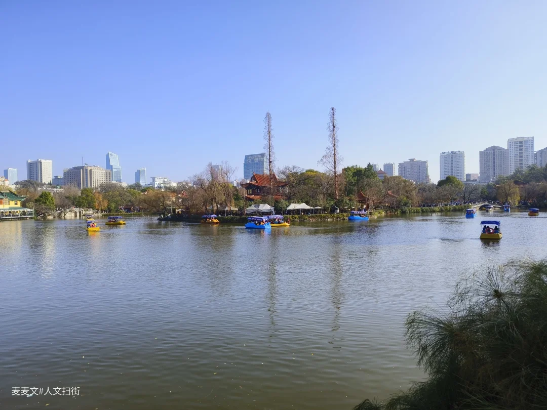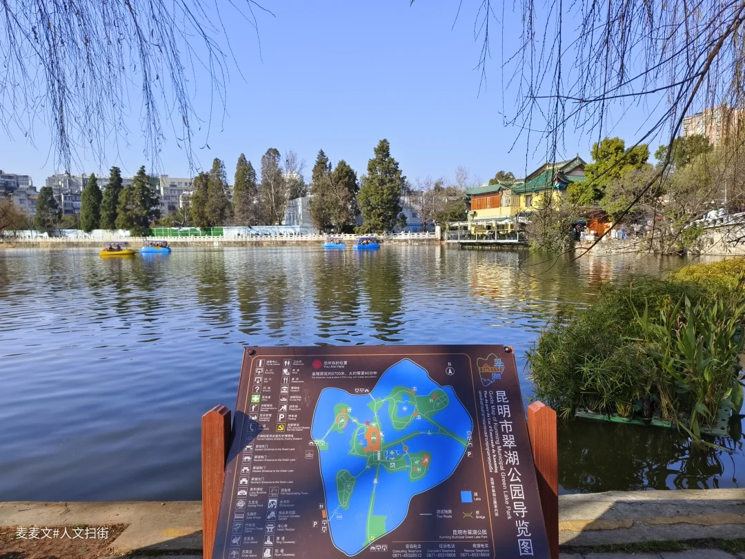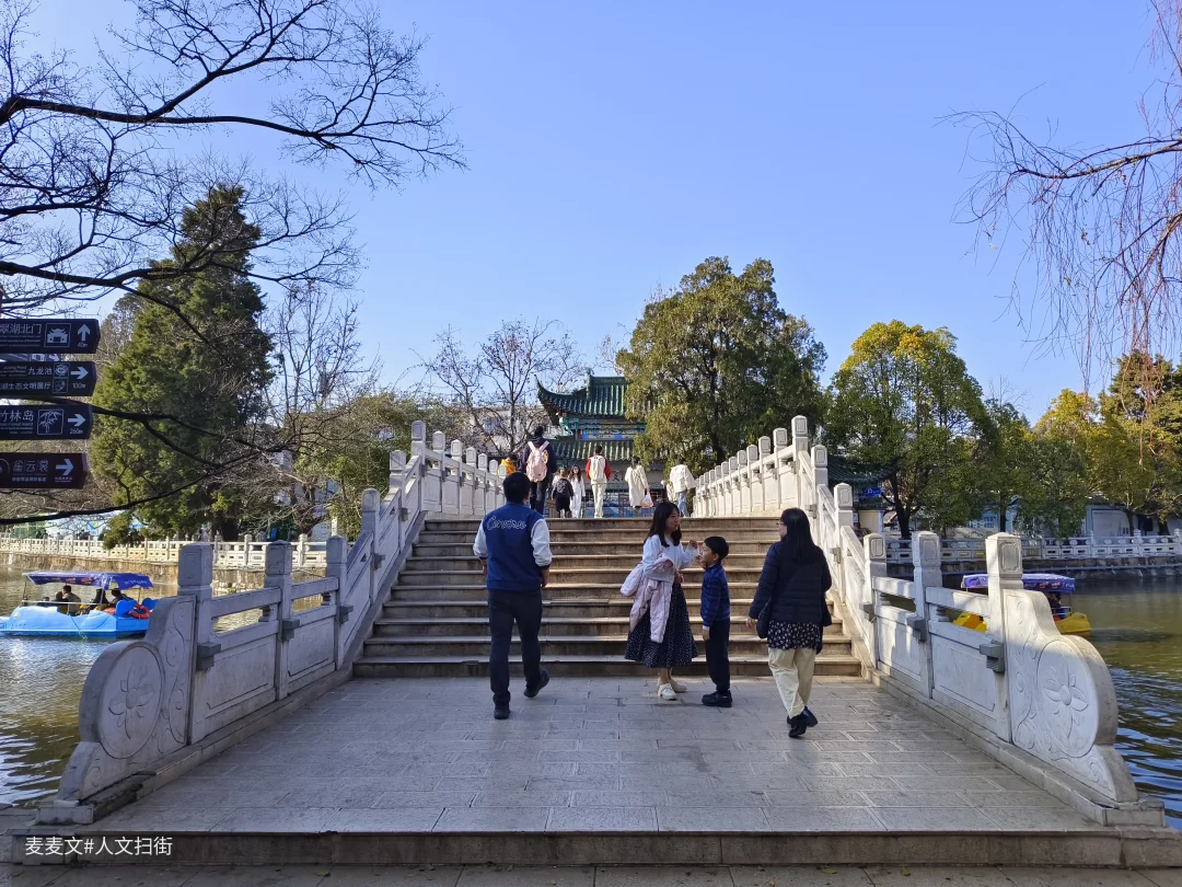 公园内水系环绕,亭台楼阁错落,融合了江南园林的精致与滇地特色。湖面开阔,水质清澈,环湖步道约3公里,可漫步、泛舟(夏季开放游船)。