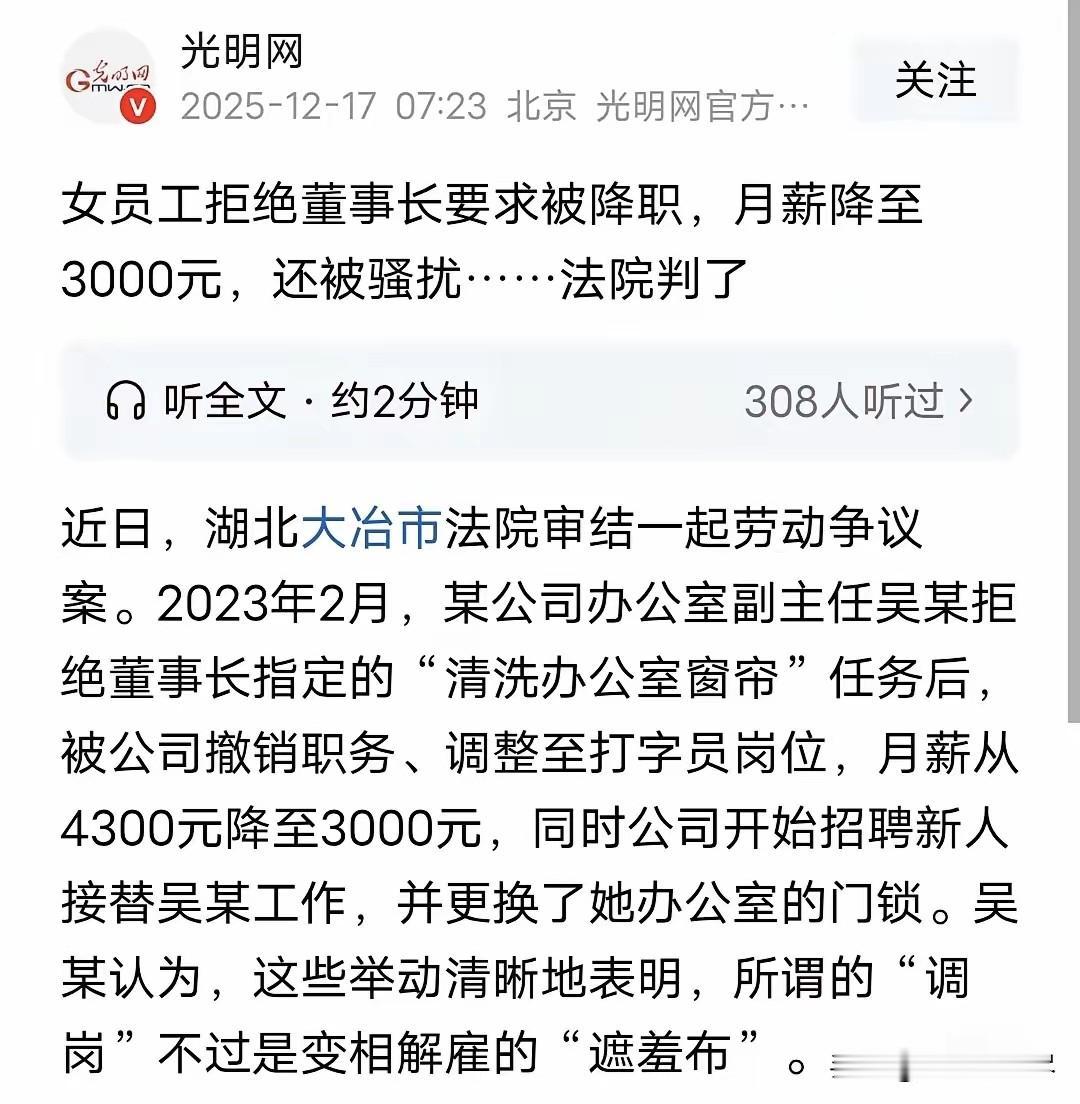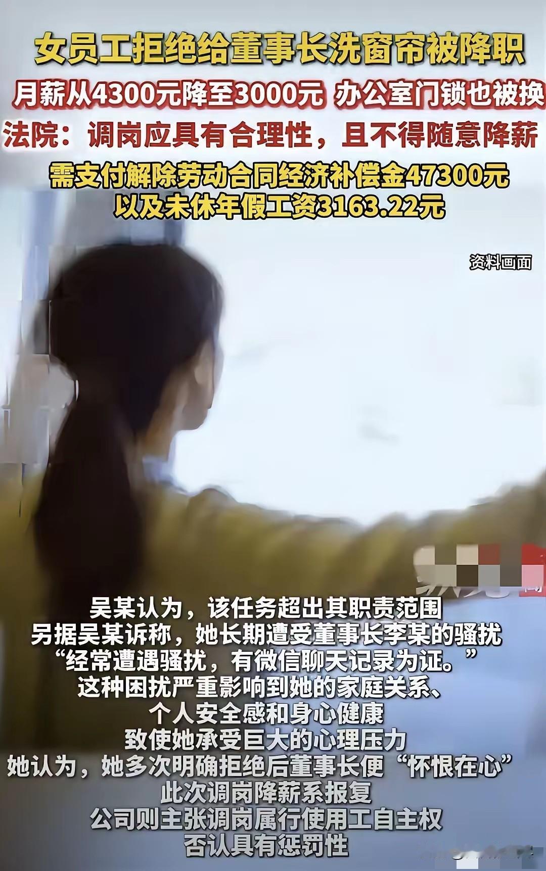 “色欲熏心?”湖北大冶,女子本是办公室副主任,董事长指定让她“清洗办公室窗帘”,女子果断拒绝,被降职到打字员,4300元月薪也降到3000元,还招新人替代女子工作,甚至换了女子办公室的门锁,这一切都是因为董事长经常给她发骚 扰信息,她多次明确拒绝,却遭董事长调岗降薪报复,女子一气之下告上法院,法院作出公正判决。 一份突如其来的“清洗办公室窗帘”指令,让湖北大冶某建设公司的办公室副主任吴某陷入了职业生涯的漩涡。 谁也没想到,这个看似普通的工作安排,背后竟隐藏着职场权力的滥用与恶意报复的暗流。 2012年入职的吴某,凭借十年多的勤恳付出,从普通文员稳步晋升为办公室副主任,月薪4300元的待遇是对她工作能力的认可。 然而这份稳定的职场生活,却被董事长频繁发来的骚扰信息打破。那些逾越边界的文字让她倍感不适,每次她都明确表达拒绝态度,坚守职业底线与个人尊严,却没料到这会为自己招来无端打压。 2023年2月,董事长突然电话通知吴某负责清洗办公室窗帘,这项本由专人负责的工作,显然超出了她作为办公室副主任的职责范围。 吴某基于岗位职责划分作出拒绝,没曾想这一合理举动竟成为导火索。次日起,公司连续召开专题会议,火速作出撤销吴某副主任职务的决定,将她调至打字员岗位,月薪直接锐减至3000元。 更令人无法接受的是,公司在作出调岗降薪决定的同时,已悄然启动招聘程序,寻找新人接替吴某原来的工作,甚至不等她办理岗位交接,就直接更换了她办公室的门锁,断绝了她正常开展工作的可能。 一系列密集操作下来,明眼人都能看出这并非正常的岗位调整,而是针对性的报复行为,目的就是逼迫吴某主动离职。 无故被降职减薪、劳动条件被恶意剥夺,十年工龄换来如此对待,吴某内心的委屈与愤怒可想而知。 她没有选择隐忍退让,而是收集好董事长发送骚扰信息的微信记录、公司调岗降薪的相关文件等证据,果断向法院提起诉讼,维护自己的合法权益。 法院在审理过程中查明,吴某与公司自2012年6月至2023年2月期间存在合法劳动关系,公司以吴某拒绝职责范围外的洗窗帘任务为由,单方作出调岗降薪决定,既未与劳动者协商一致,也缺乏合理依据,已构成“未按劳动合同约定提供劳动条件”。 根据劳动合同法相关规定,用人单位享有用工自主权,但必须以合法合理为前提,不得随意变更劳动合同内容或降低劳动者待遇。 最终,法院作出公正判决,确认双方劳动关系于2023年2月解除,公司需向吴某支付解除劳动合同经济补偿金47300元及未休年假工资3163.22元,合计50463.22元。 这笔赔偿金不仅是对吴某合法权益的弥补,更彰显了法律对职场不公行为的约束。 职场中,利用职权实施性骚扰已触碰法律红线,而将员工的正当拒绝作为报复理由,通过调岗降薪、剥夺劳动条件等方式打压员工,更是对劳动法律法规的漠视。 《民法典》第一千零一十条明确规定,违背他人意愿实施性骚扰的,受害人有权请求民事责任,企业也负有防止和制止职场性骚扰的法定义务。 吴某的胜诉案例,为遭遇类似职场不公的劳动者提供了维权范本,也警示企业管理者必须在法律框架内行使职权,尊重劳动者的人格尊严与合法权益。 对此,你们有什么看法,欢迎评论留言~