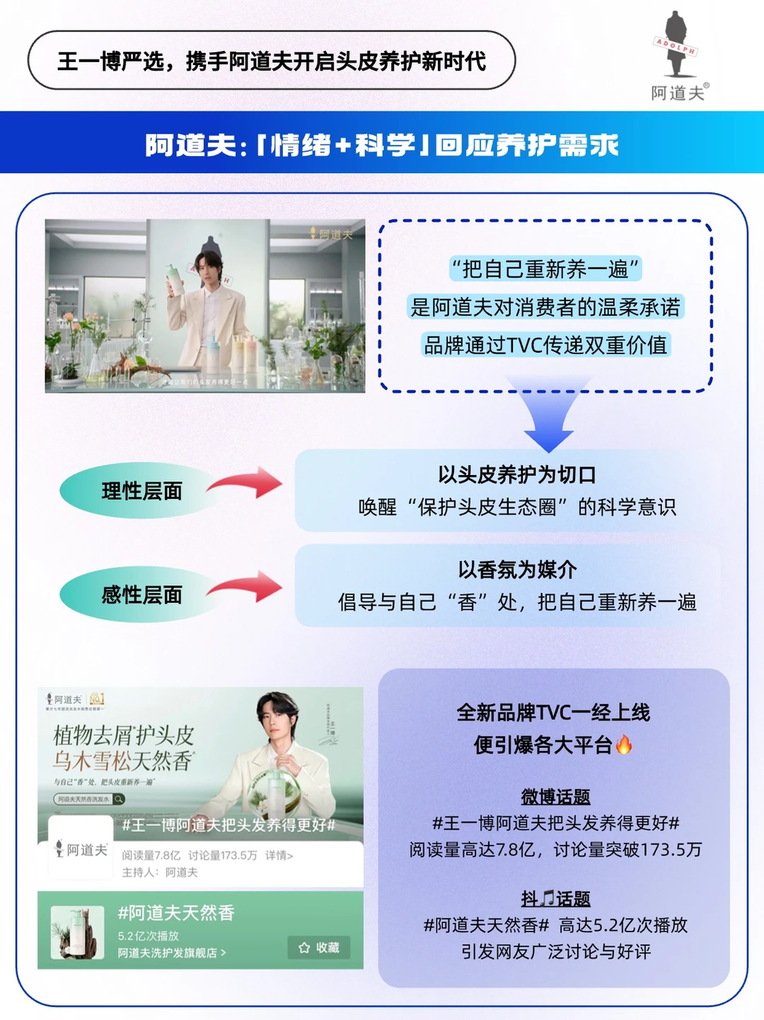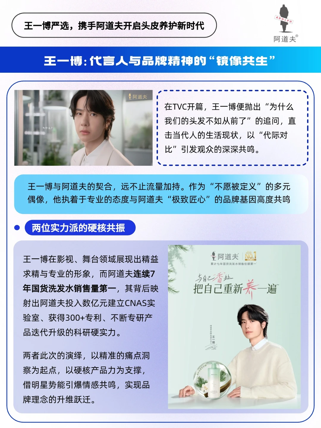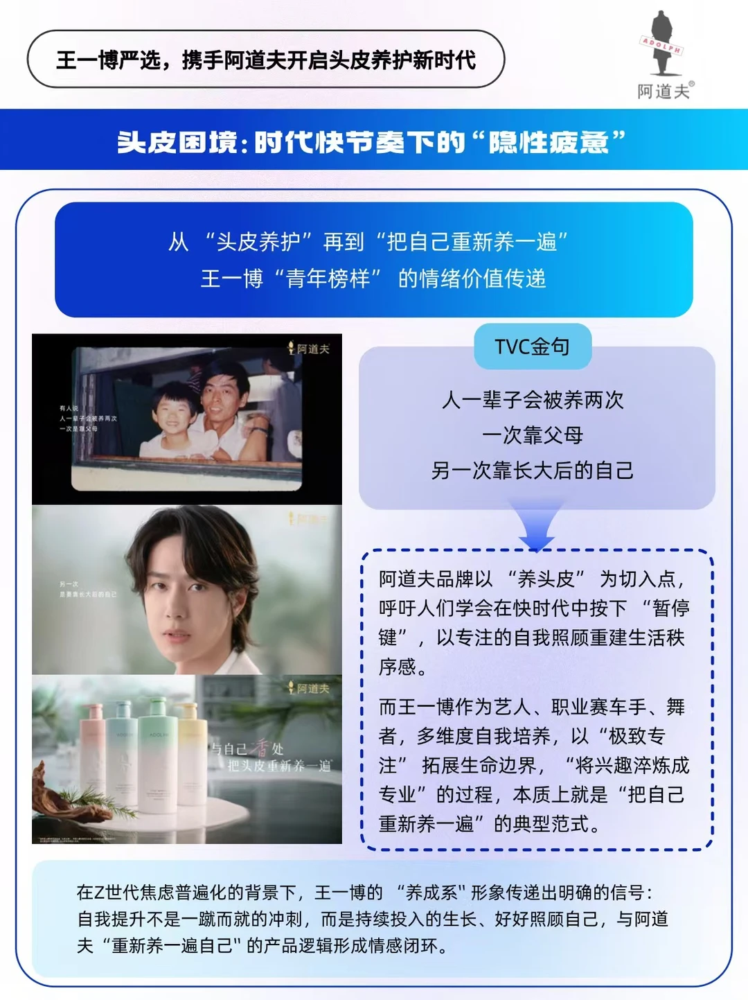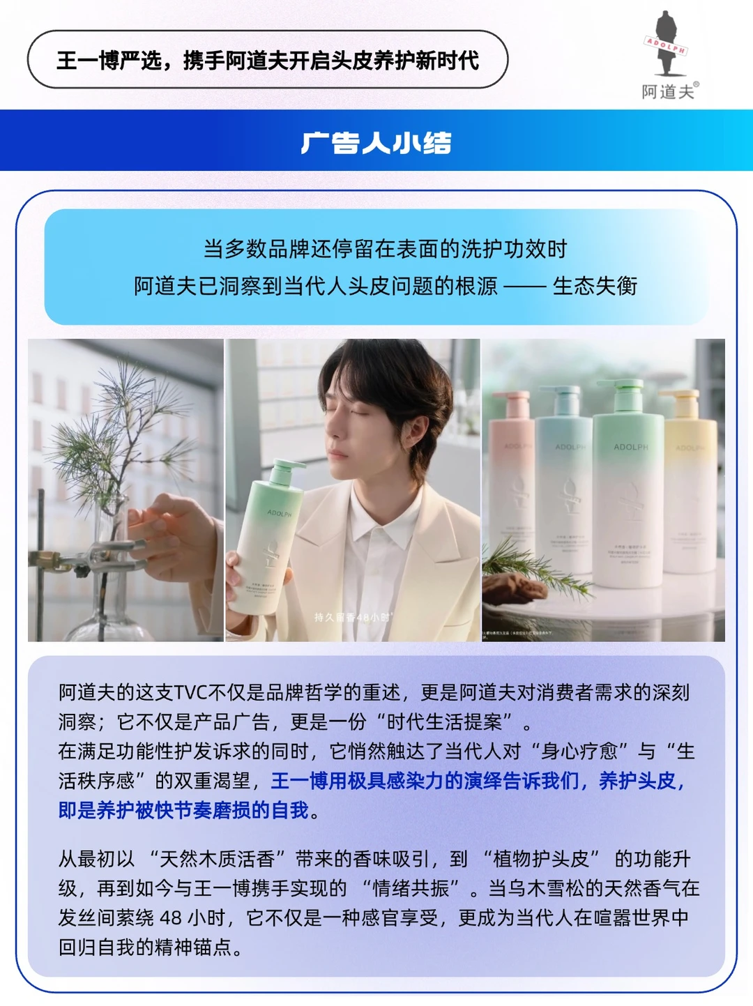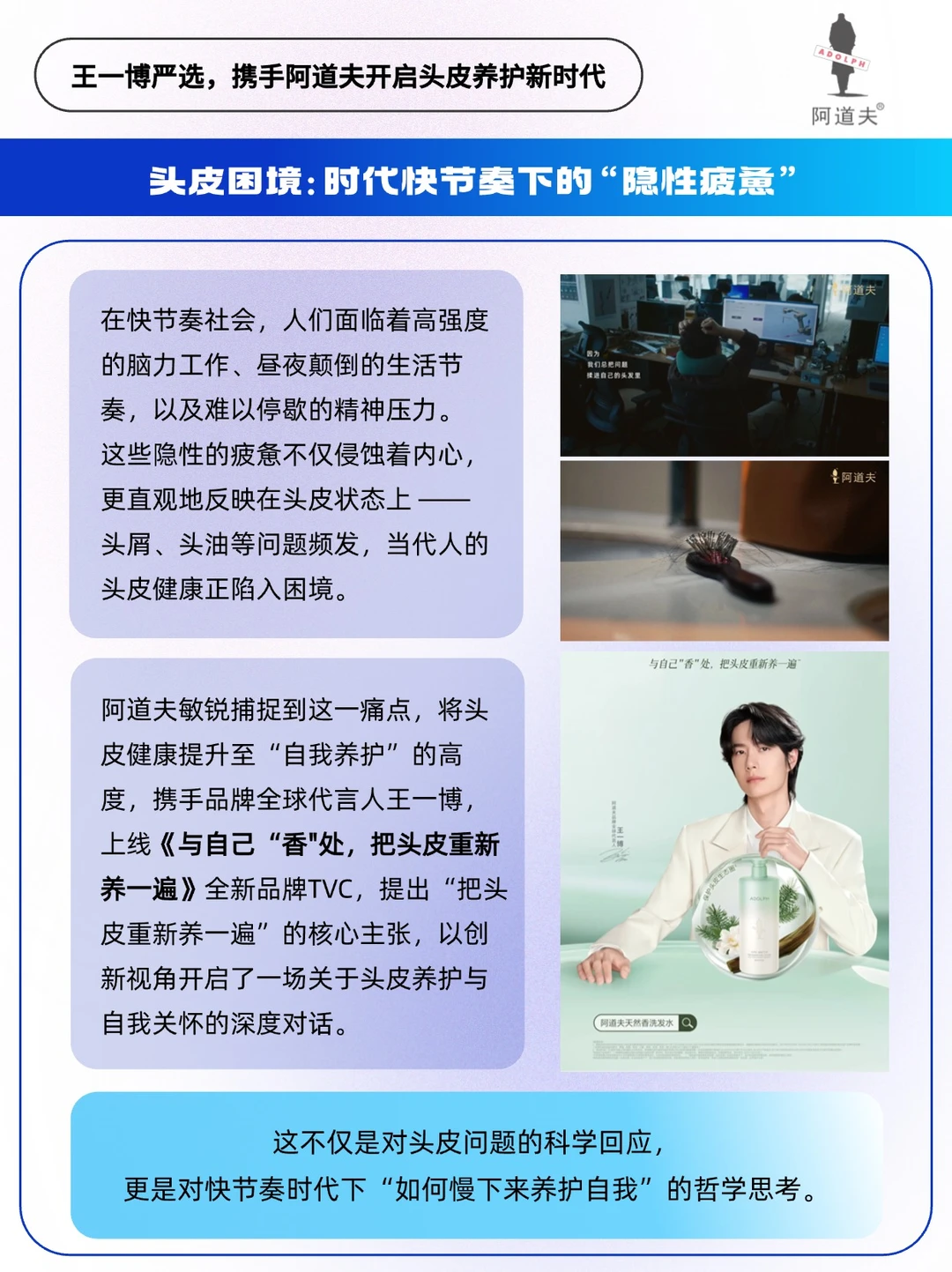 🔵作为国货洗护领军品牌,阿道夫携手王一博以「逆生长」姿态破局:「把头皮重新养一遍,也把自己重新养一遍」。在这里「清洁」不再是粗暴去油去屑,而是「自我情绪共振」❤️