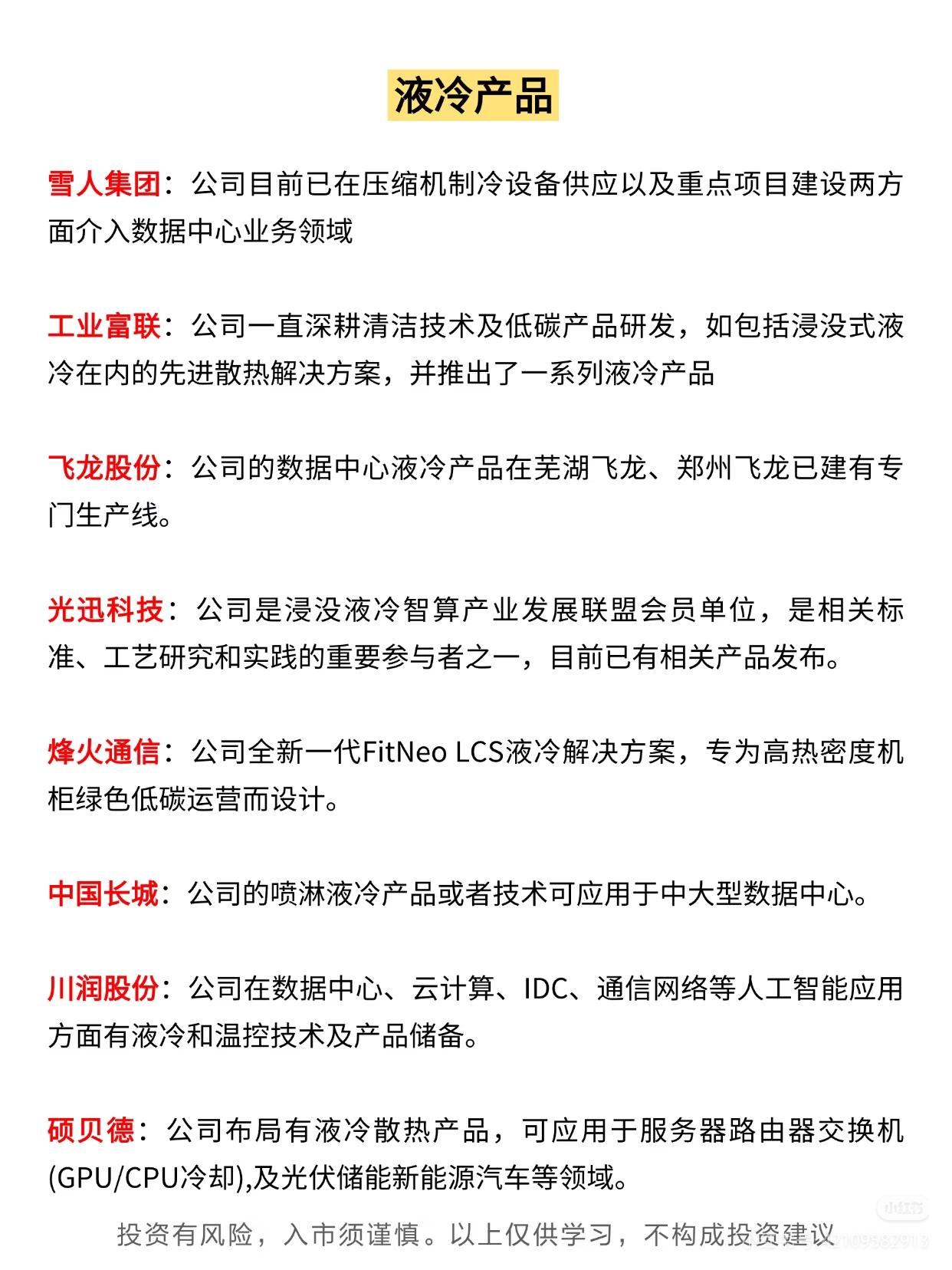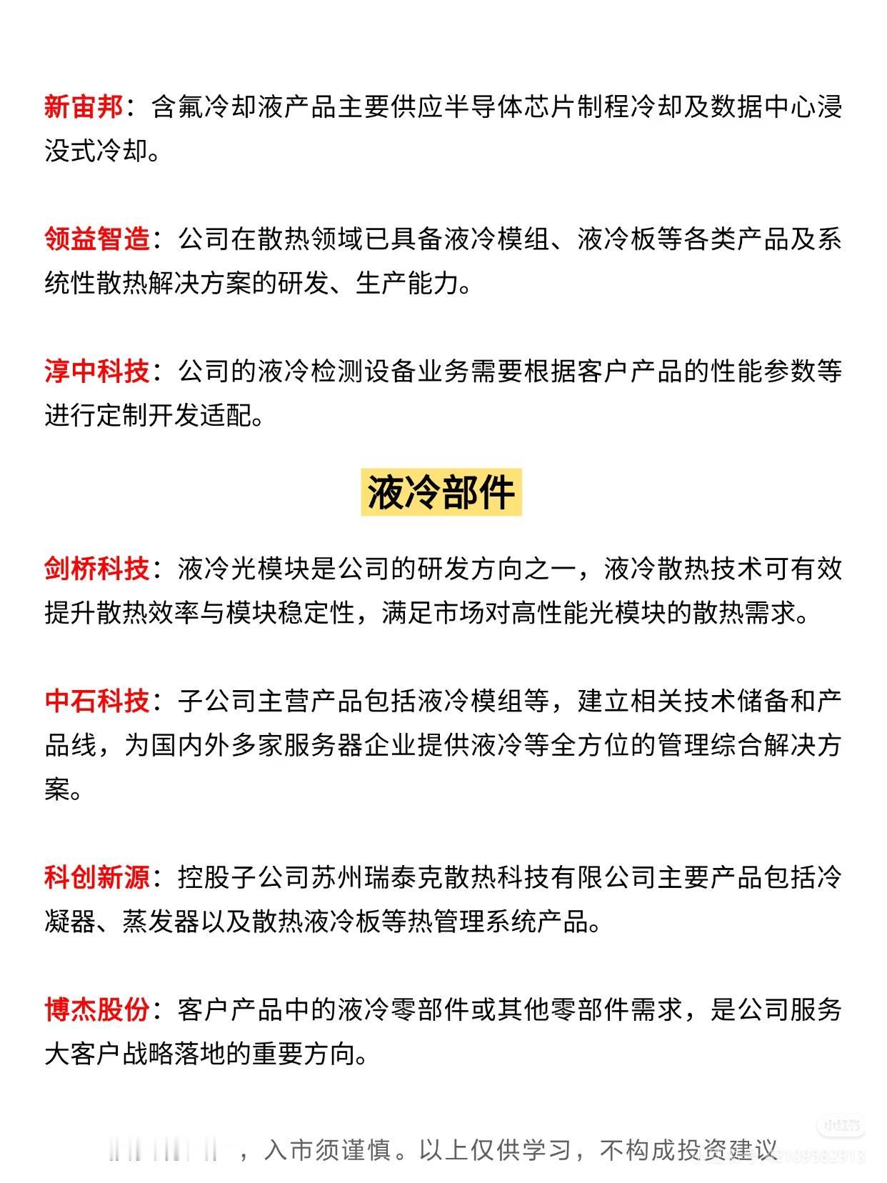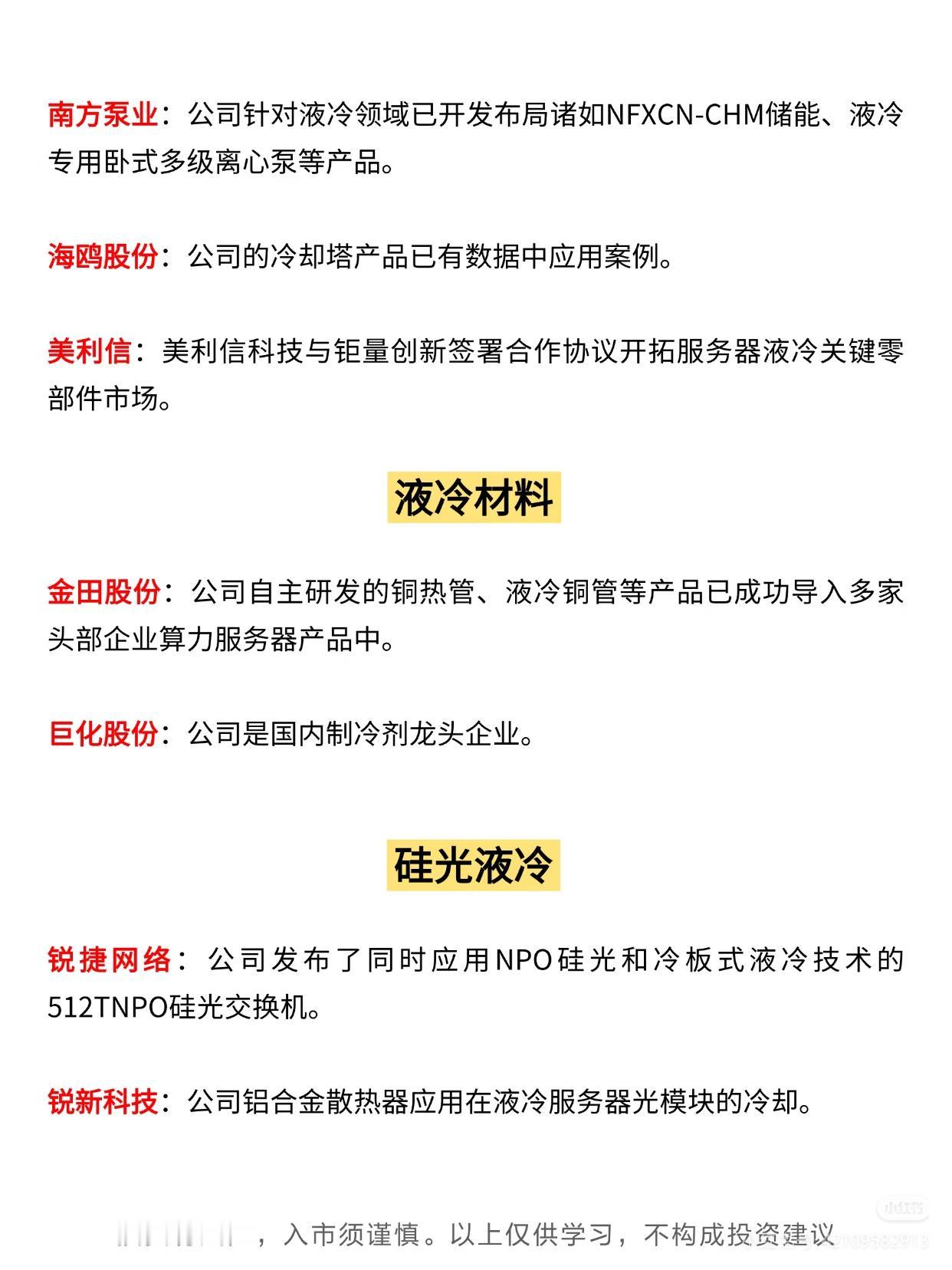 液冷服务器及相关领域概念股,梳理了不同方向的企业布局与业务情况,具体内容如下: 首先聚焦液冷服务器核心方向,介绍了英维克、中兴通讯、中科曙光、浪潮信息、立讯精密、紫光股份等企业。英维克推出Coolinside液冷机柜及全链条液冷解决方案;中兴通讯拥有全系列服务器及存储产品,涵盖液冷服务器;中科曙光依托ParaStor液冷存储与液冷服务器形成“存算一栈式”方案;浪潮信息将“All in液冷”纳入战略,全栈布局四大系列液冷产品;立讯精密深度参与液冷服务器等定制化产品的研发设计与落地;紫光股份发布H3CUniServerR4900LCG5液冷服务器。 其次围绕液冷产品,涵盖雪人集团、工业富联、飞龙股份等多家企业。雪人集团从压缩机制冷设备及重点项目切入数据中心业务;工业富联深耕浸没式液冷等先进散热解决方案并推出系列产品;飞龙股份在芜湖、郑州建有数据中心液冷产品专门生产线;光迅科技作为浸没液冷智算联盟成员,参与标准研究并发布相关产品;烽火通信推出FitNeo LCS液冷解决方案;中国长城的喷淋液冷技术可用于中大型数据中心;川润股份储备数据中心等领域的液冷与温控技术;硕贝德的液冷散热产品应用于服务器、新能源等多领域。 再聚焦液冷部件,涉及新宙邦、领益智造、淳中科技等企业及剑桥科技、中石科技等部件厂商。新宙邦的含氟冷却液用于半导体芯片及数据中心浸没式冷却;领益智造具备液冷模组、液冷板等研发生产能力;淳中科技的液冷检测设备需定制开发;剑桥科技研发液冷光模块以提升散热效率;中石科技子公司提供液冷模组及综合散热解决方案;科创新源控股子公司生产冷凝器、散热液冷板等热管理产品;博杰股份服务大客户时关注液冷零部件需求。 最后补充液冷相关延伸领域,包括南方泵业、海鸥股份、美利信等企业的液冷配套布局,以及液冷材料、硅光液冷方向。南方泵业开发液冷专用卧式多级离心泵等产品;海鸥股份的冷却塔应用于数据中心;美利信与矩量创新合作开拓服务器液冷关键零部件市场。液冷材料方面,金田股份的铜热管、液冷铜管导入头部企业算力服务器;巨化股份是国内制冷剂龙头。硅光液冷领域,锐捷网络发布融合NPO硅光与冷板式液冷的512T交换机;锐新科技的铝合金散热器用于液冷服务器光模块冷却。 所有内容均提示“投资有风险,入市须谨慎,以上仅供学习,不构成投资建议”。