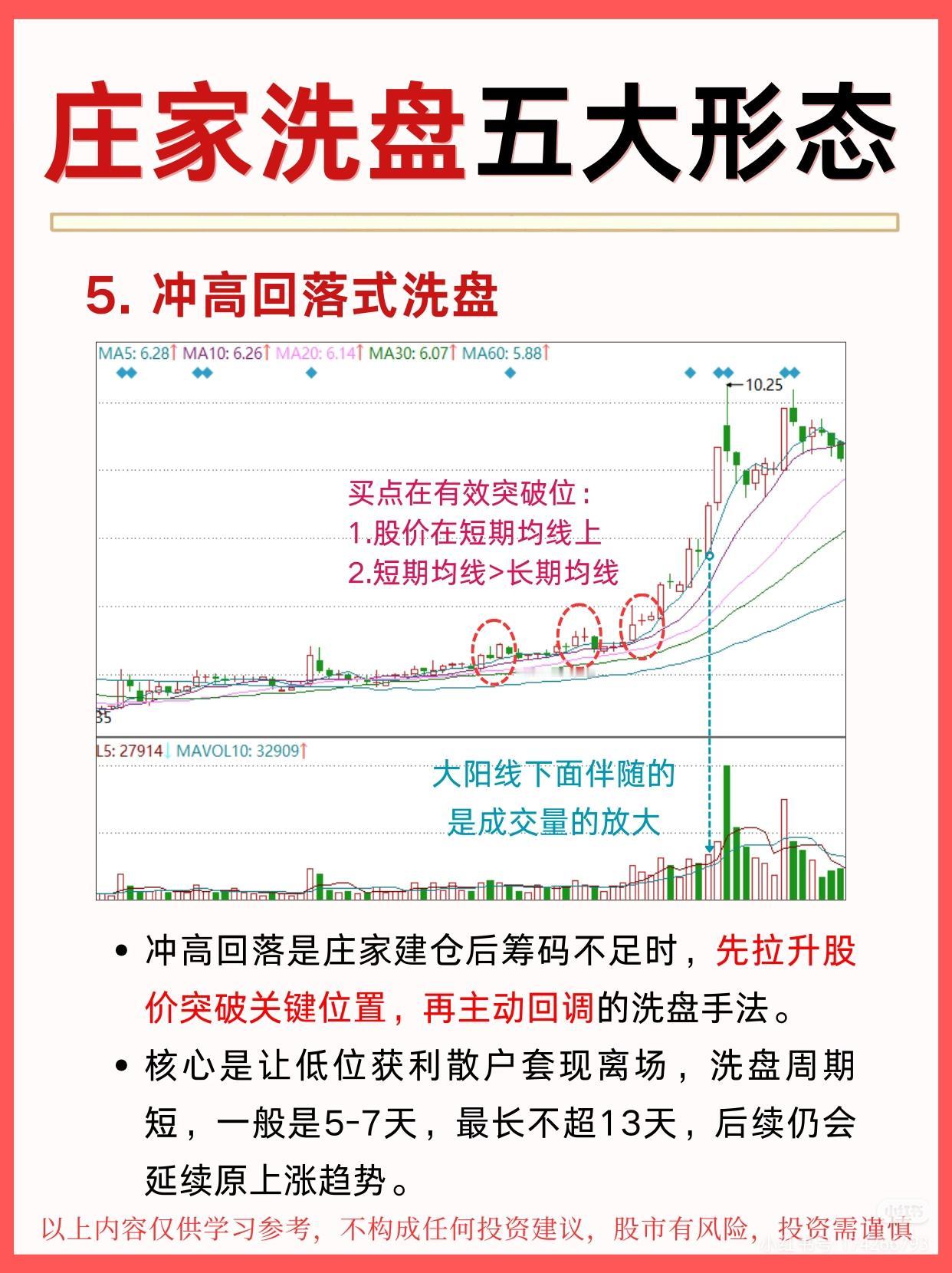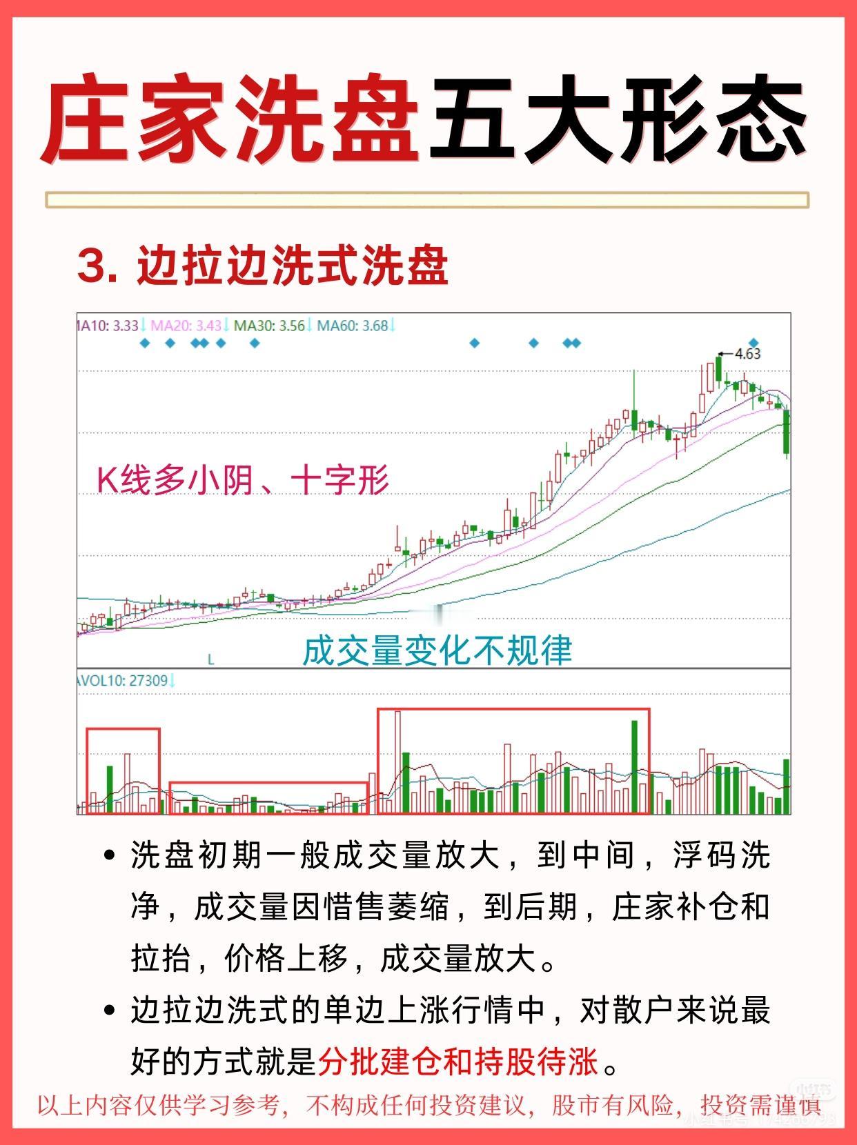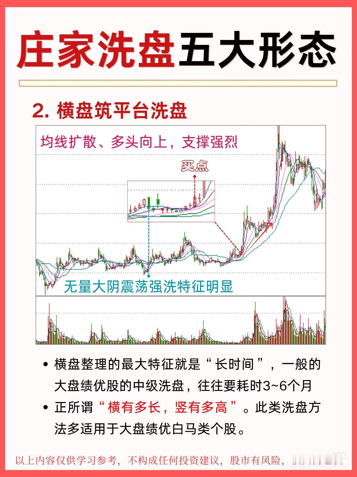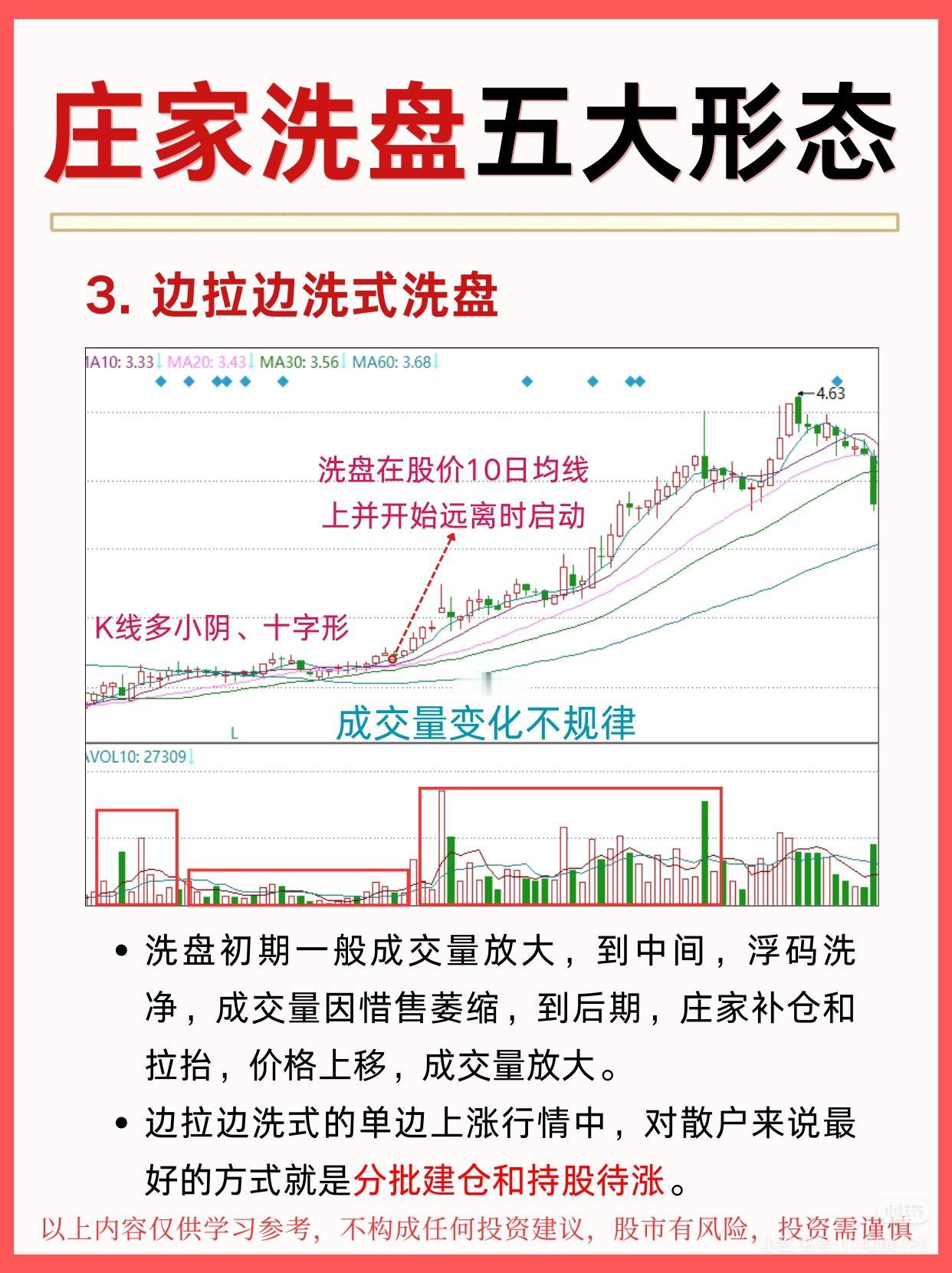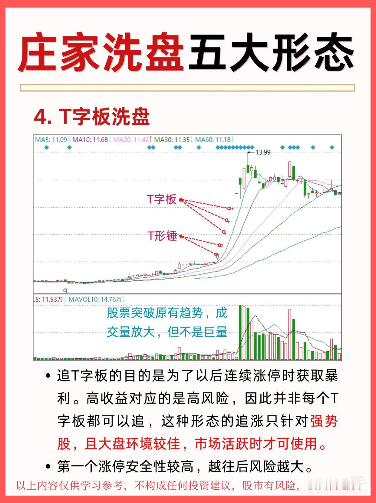 围绕“庄家洗盘五大形态”展开股票知识讲解,具体内容如下: 1. 打压式洗盘:试盘结束后股价迅速回调,出现四连阴走势但未有效放量,看似破坏原有趋势,后续连阳反攻叠加长阳突破压力线,实为强烈洗盘。图中标注“买点”“四连阴无放量”“均线黏合转向多头发散”等信息,提示底部内容仅供参考。 2. 横盘筑平台洗盘:最大特征是“长时间”,大盘绩优股的中级洗盘通常耗时3-6个月,有“横有多长,竖有多高”的说法,多适用于大盘绩优白马类个股。图中K线显示均线扩散、多头向上且支撑强烈,标注“无量大阴震荡强洗特征明显”及“买点”。 3. 边拉边洗式洗盘(两张图内容一致):洗盘过程中成交量呈“初期放大—中间因浮码洗净、惜售萎缩—后期庄家补仓拉抬、价格上移时再放大”的变化规律。K线多呈小阴、十字形,部分区域洗盘启动时股价在10日均线上并远离。操作上建议散户分批建仓和持股待涨。 4. T字板洗盘:K线呈现T字板或T形锤形态,突破原有趋势时成交量放大但非巨量。追T字板目的是为后续连续涨停获利,不过高收益伴随高风险,仅适用于强势股且市场活跃时;需注意第一个涨停安全性较高,越往后风险越大。 5. 冲高回落式洗盘:庄家建仓后筹码不足时,先拉升股价突破关键位置(如10.25),再主动回调洗盘,核心是促使低位获利散户套现离场。洗盘周期短,一般5-7天,最长不超13天,后续仍延续原上涨趋势。买点为股价在短期均线上且短期均线大于长期均线,常伴随大阳线与成交量放大。 所有内容均明确提示“仅供学习参考,不构成任何投资建议,股市有风险,投资需谨慎”。