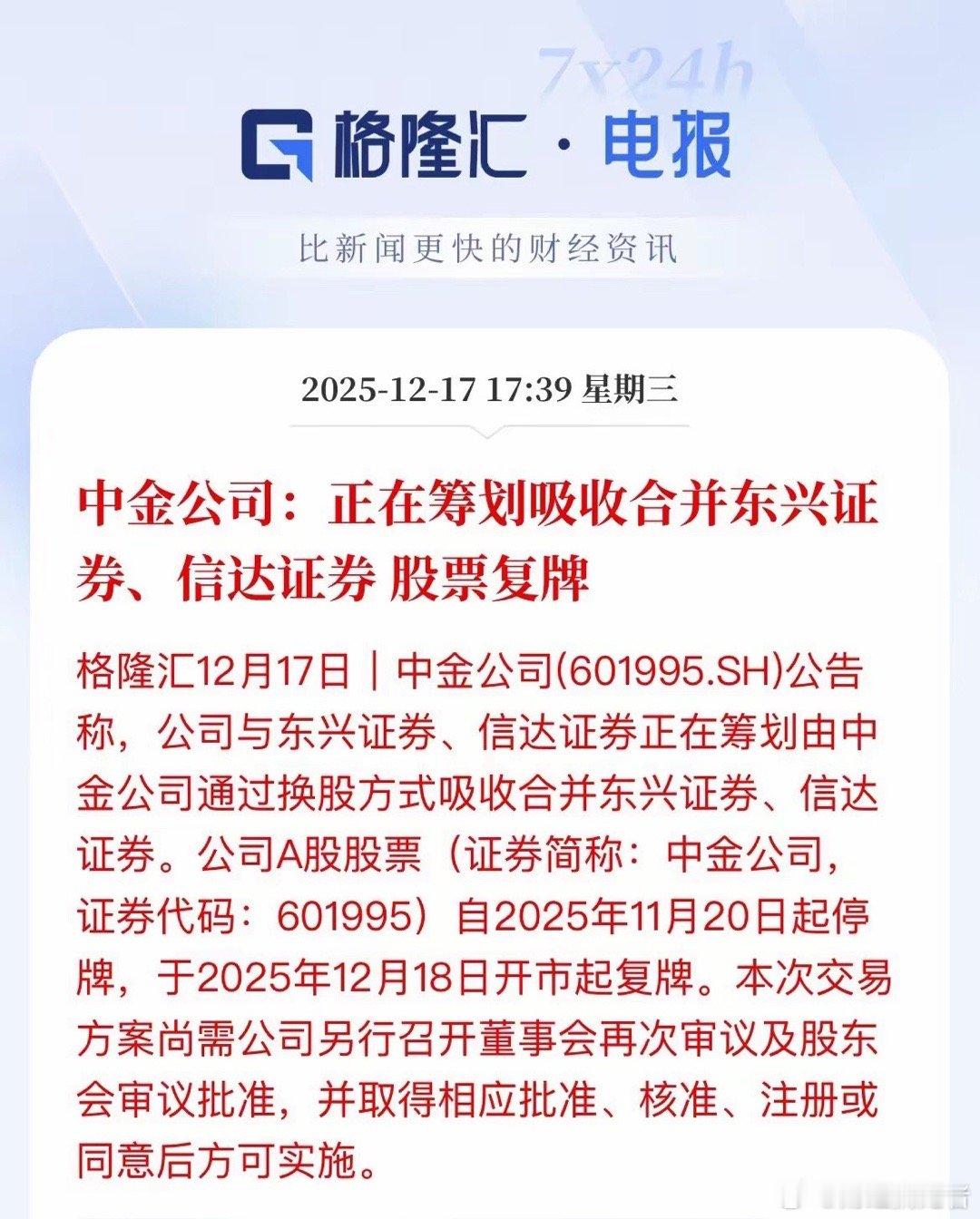 利好落地引爆市场情绪,证券板块午后直线拉升,核心逻辑正是中金公司吸收合并东兴证券、信达证券的换股方案正式落地,三家券商明日同步复牌的重磅催化。这份敲定的方案不仅明确了1股东兴证券A股可换0.4373股中金A股、1股信达证券A股可换0.5188股中金A股的核心对价,更标志着这场汇金系内部的券商整合从筹划阶段迈入实质落地期,市场期待已久的“万亿投行”蓝图即将照进现实。换股定价背后藏着清晰的价值逻辑:中金以定价基准日前20个交易日均价36.91元/股为基础,为东兴证券给出26%的换股溢价,最终确定16.14元/股的换股价格,而信达证券则以19.15元/股的交易均价直接作为换股对价,既体现了对两家标的资产的认可,也为市场提供了明确的估值锚点。更关键的是,此次合并绝非简单的规模叠加,而是一场精准的功能互补型整合——中金在跨境业务、高端投行、财富管理的领先优势,将与东兴证券在福建区域的网点深度、信达证券在特殊资产处置领域的专长形成共振,合并后营业网点将跃升至436家、零售客户突破1400万户,总资产正式站上万亿台阶,跻身行业第四梯队。历史经验早已印证此类重磅重组的市场号召力:从申万宏源合并后的276%超额收益,到国信收购万和证券期间的70%涨幅,券商行业重大并购节点往往伴随个股与板块的双重共振。而此次整合更契合监管层培育国际一流投行的政策导向,是金融供给侧改革的关键落子,不仅将夯实中金的资本实力、打开业务扩张空间,更有望引发券商板块的价值重估潮。随着明日三家公司复牌,这场承载着“中国版高盛”期许的整合,将正式开启A股券商行业从规模扩张向质量提升的新周期,午后的板块拉升正是市场对这份长期价值的提前投票。今日看盘上证指数a股