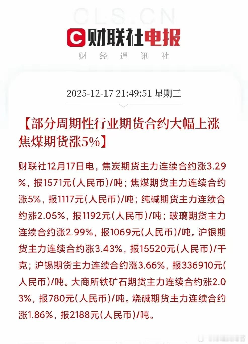 深夜突发!周期商品期货全线暴涨 焦煤领涨5% A股这些方向明日或迎风口国内商品期货夜盘迎来全面爆发,周期品种集体飙升,焦煤主力合约大涨5%,焦炭、玻璃、沪银、沪锡等品种涨幅均超3%,大宗商品市场吹响反攻号角。核心品种涨幅一览• 黑色系:焦煤+5%、焦炭+3.29%、铁矿石+2.03%• 建材系:玻璃+2.99%、纯碱+2.05%• 有色金属:沪锡+3.66%、沪银+3.43%• 基础化工:烧碱+1.86%三大驱动逻辑引爆行情1. 政策预期升温:年末重要会议定调稳增长,市场对明年基建投资加码、制造业复苏的预期持续强化,拉动黑色、建材等基础原材料需求预期。2. 供给端收紧预期:部分产区受安全生产、环保政策约束,相关品种供给端存在收缩预期,进一步助推市场看涨情绪。3. 资金回流布局:股市板块轮动加快,资金开始回流至调整充分、价格弹性高的周期领域,提前进行左侧布局。A股受益链条全梳理1. 煤炭板块:焦煤领涨直接利好龙头企业,动力煤标的同步受益于板块情绪。◦ 焦煤龙头:山西焦煤、平煤股份◦ 动力煤龙头:中国神华、陕西煤业、兖矿能源2. 钢铁冶金板块:焦炭、铁矿石涨价支撑钢企成本端,具备成本优势的龙头及特钢企业更具弹性。◦ 龙头钢企:宝钢股份、华菱钢铁◦ 特钢标的:中信特钢、久立特材3. 建材玻璃板块:玻璃大涨印证地产竣工端需求回暖预期,玻璃-纯碱产业链直接受益。◦ 玻璃龙头:旗滨集团、南玻A◦ 纯碱标的:山东海化、远兴能源4. 有色贵金属板块:沪锡、沪银大涨叠加全球制造业复苏与避险需求,相关标的迎来催化。◦ 工业金属:锡业股份◦ 贵金属:山东黄金、中金黄金商品期货作为现货价格的先行指标,其集体大涨释放出宏观经济预期改善与市场风险偏好切换的强烈信号。当前周期板块估值处于低位,资金布局迹象明显,明日A股煤炭、钢铁、建材等周期方向有望接棒成为领涨主线,值得重点关注。今日看盘上证指数a股
