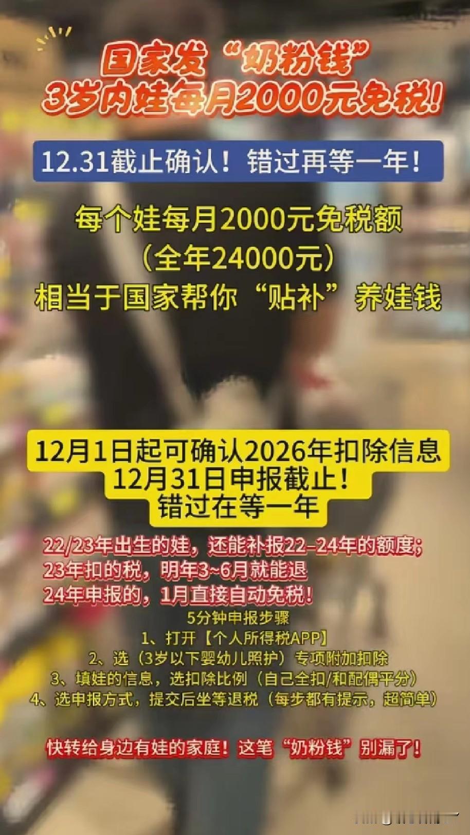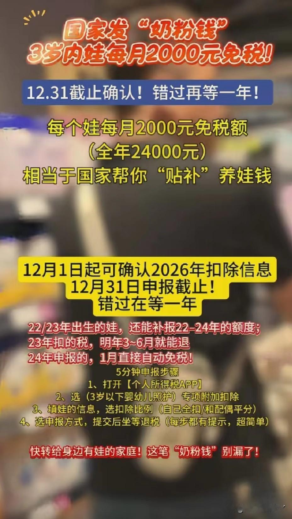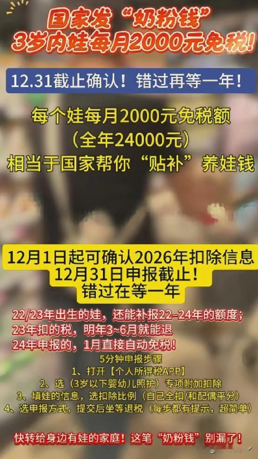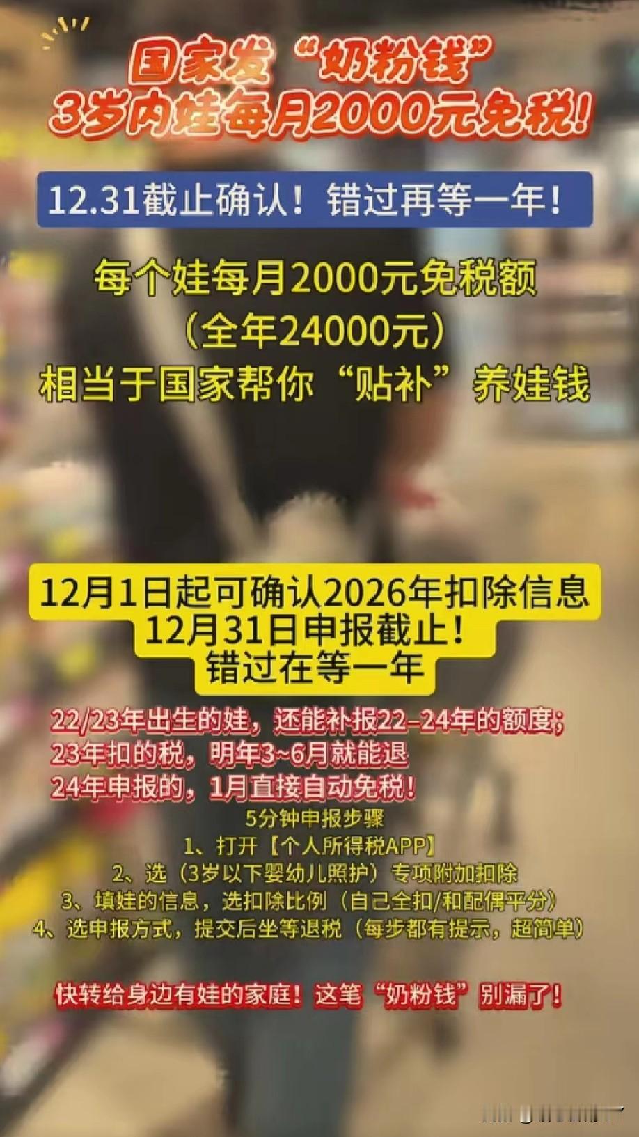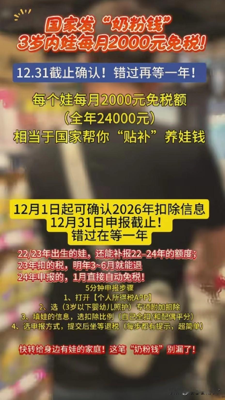 国家发放“奶粉钱”,养孩子再添实在福利! 三岁以内孩子每月可享2000元免税额度,全年共计24,000元,这相当于国家助力分担养孩子开销! 展望2026年,相关扣除信息需在2025年12月1日至12月31日期间确认,错过得需再等一年。 更为贴心的是:2022至2023年出生的孩子,还能补报2022年至2024年的额度;2023年扣的税,2024年3到6月即可退税;2024年申报的,2025年1月将直接自动免税! 申报步骤简单,打开个税APP几步即可完成观车。就搞定了。 这项政策太暖心,让养孩子家庭减轻经济,也让有生育意愿的家庭更有信心,愿给了想生孩子的家庭更多底气,愿每个孩子都能在温暖中茁壮成长!
