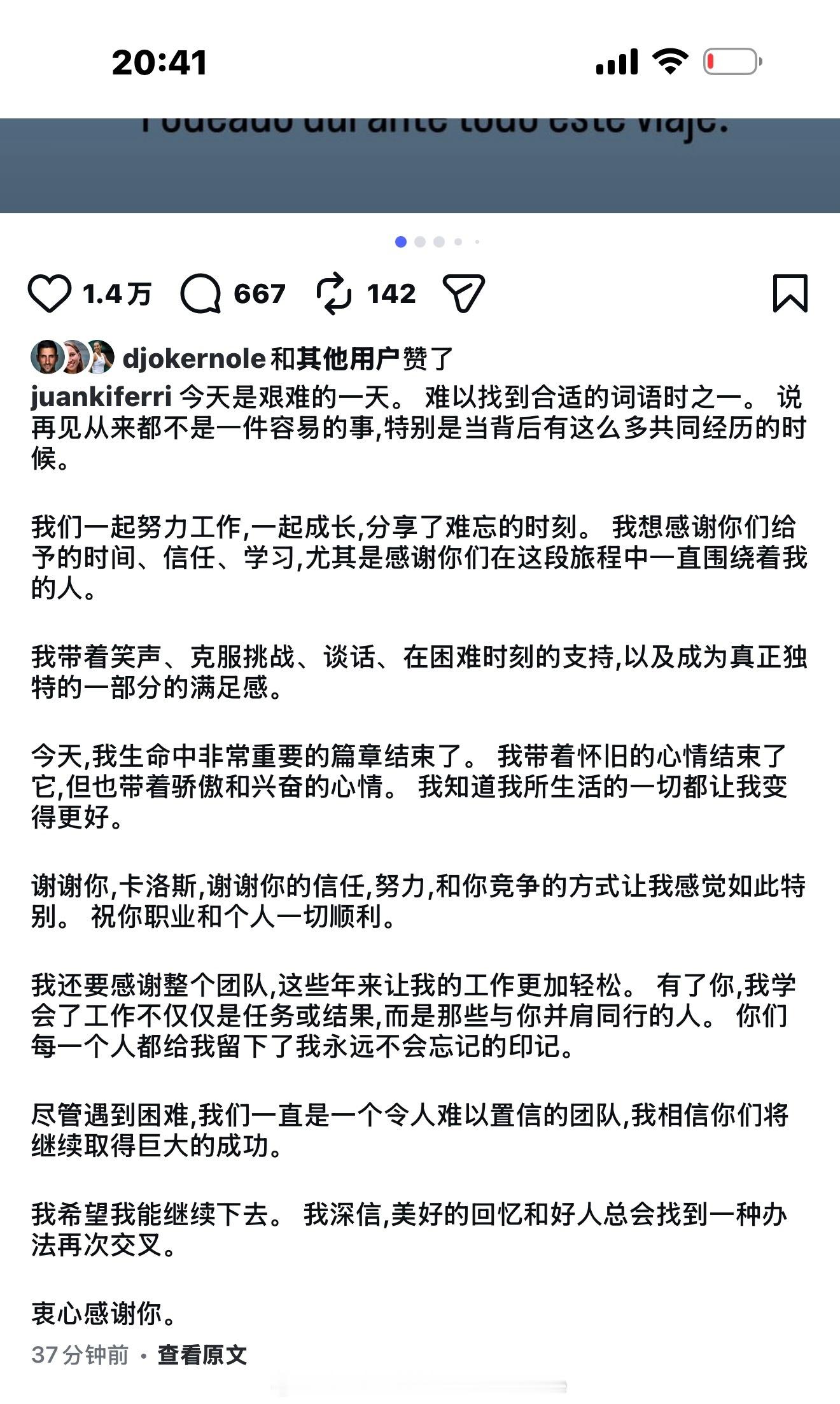 阿尔卡拉斯费雷罗结束合作⚠️⚠️警告OMG,阿尔卡拉斯和费雷罗结束合作。完全没有想到的一件事 “写下这条信息对我来说非常艰难……在共同走过七年多之后,胡安基和我决定结束我们作为教练和球员的共同旅程。感谢你将儿时的梦想变成了现实。这段旅程始于我还是个孩子的时候,这么多年来,无论场上场下,你都陪伴我走过了一段不可思议的旅程。我珍惜我们共同经历的每一步。我们登上了顶峰,我觉得如果我们的运动生涯注定要分道扬镳,那也只能从这里开始。从我们一直努力奋斗、一直向往的地方开始。太多回忆涌上心头,只选一个实在不公平。你帮助我成长为一名运动员,更重要的是,你帮助我成长为一个更好的人。我最珍视的一点是:我享受这段旅程的每一步。我会永远铭记我们共同走过的这段路。我们俩都将迎来新的变革时期,新的冒险和新的项目。但我确信,我们会像以往一样,全力以赴,以正确的方式应对这一切。永远向前。衷心祝愿你未来一切顺利。想到我们毫无保留,为彼此付出了一切,我就感到心安。谢谢你,Juanki!