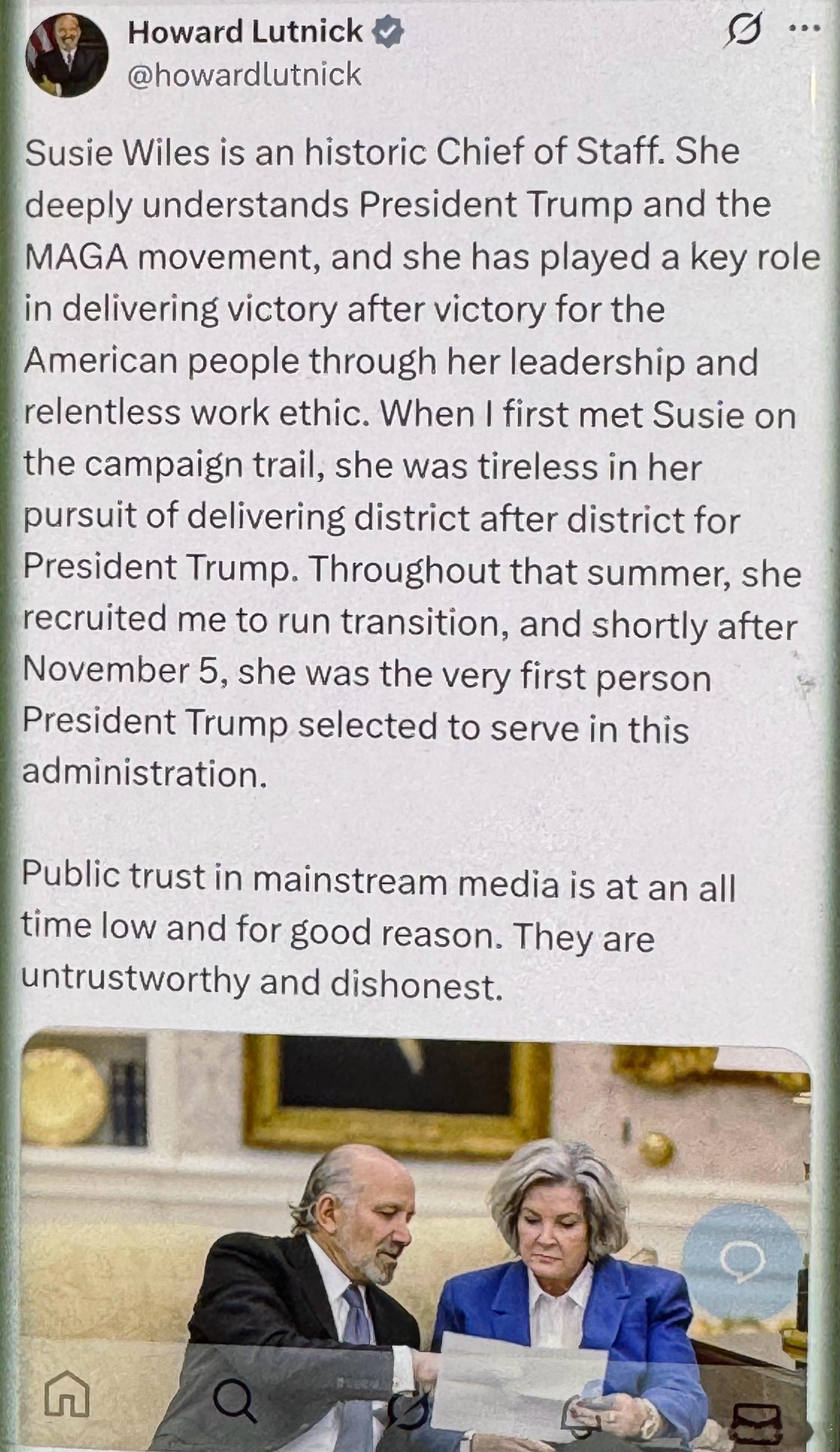 美国商务部部长霍华德卢特尼克:苏西·怀尔斯是一位具有历史意义的白宫办公厅主任。她深谙特朗普总统的理念与“让美国再次伟大”运动的精髓,凭借自身的领导能力与持之以恒的职业操守,为美国民众接连赢得胜利,发挥了关键作用。我最初是在竞选活动期间结识苏西的,彼时她为助力特朗普总统拿下一个又一个选区,始终不辞辛劳、全力以赴。那年夏天,正是她动员我投身总统过渡团队的筹备工作;而在11月5日之后不久,她便成为特朗普总统新一届政府的首位任命人选。主流媒体的公众信任度正处于历史最低点,这绝非空穴来风——他们本就缺乏公信力,且惯于弄虚作假。