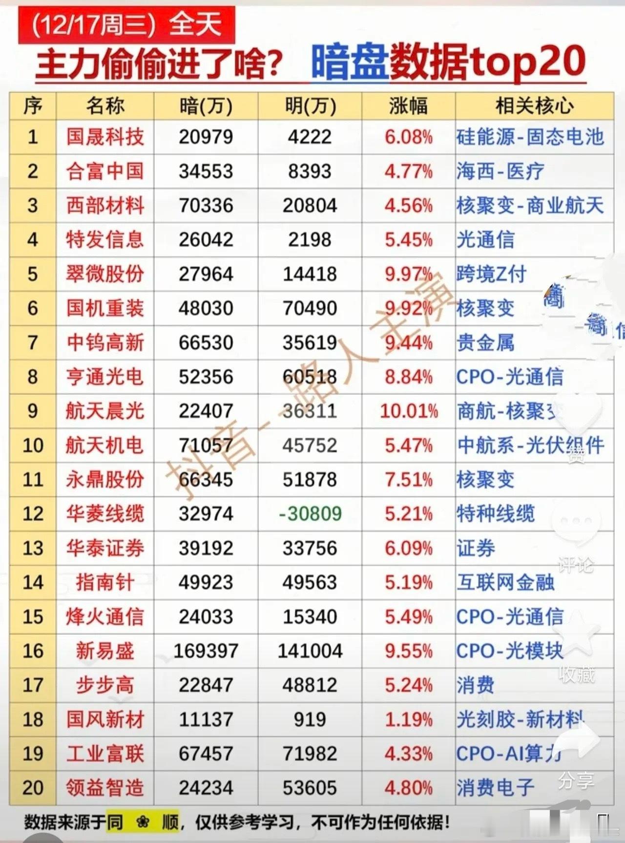 12月17日主力暗盘数据梳理分析今天主力暗盘交易TOP20统计,涵盖暗盘、明盘资金额、涨幅及核心题材四大维度。资金布局聚焦光通信、核聚变、固态电池等赛道,新易盛暗盘资金超16亿居首;部分个股暗盘与明盘资金同步流入,华菱线缆明盘却净流出;航天晨光等标的涨停,题材与资金共振效应显著,消费、证券等板块也有标的获资金布局。个股梳理分析1. 国晟科技:暗盘20979万、明盘4222万,涨幅6.08%,核心为硅能源-固态电池。暗盘资金大幅高于明盘,体现主力通过暗盘潜伏固态电池赛道,对该题材的成长预期进行提前布局。2. 合富中国:暗盘34553万、明盘8393万,涨幅4.77%,核心是海西-医疗。暗盘资金占比高,主力借暗盘布局医疗板块海西题材,明盘资金跟进有限,资金布局偏隐蔽性。3. 西部材料:暗盘70336万、明盘20804万,涨幅4.56%,核心为核聚变-商业航天。暗盘大额资金流入,核聚变与商业航天的双重题材,成为主力暗盘布局的核心逻辑。4. 特发信息:暗盘26042万、明盘2198万,涨幅5.45%,核心是光通信。暗盘资金远胜明盘,主力低调布局光通信赛道,标的在光通信细分领域的业务布局获资金认可。5. 翠微股份:暗盘27964万、明盘14418万,涨幅9.97%涨停,核心为跨境支付。暗盘与明盘资金同步流入,跨境支付题材催化下股价涨停,资金与题材形成强势共振。6. 国机重装:暗盘48030万、明盘70490万,涨幅9.92%,核心是核聚变。明盘资金反超暗盘,核聚变题材获主力明盘大举加仓,股价接近涨停,资金做多态度鲜明。7. 中钨高新:暗盘66530万、明盘35619万,涨幅9.44%,核心是贵金属。暗盘资金占优,贵金属板块的资源属性吸引主力暗盘布局,股价大幅上涨体现资金布局效果。8. 亨通光电:暗盘52356万、明盘60518万,涨幅8.84%,核心为CPO-光通信。明盘资金略超暗盘,CPO与光通信的热门题材,让标的获主力明暗盘同步加仓。9. 航天晨光:暗盘22407万、明盘36311万,涨幅10.01%涨停,核心是商航-核聚变。明盘资金更活跃,商航与核聚变题材叠加,推动股价涨停,资金做多意愿强烈。10. 航天机电:暗盘71057万、明盘45752万,涨幅5.47%,核心是中航系-光伏组件。暗盘资金占优,中航系背景叠加光伏组件题材,成为主力暗盘布局的重要标的。11. 永鼎股份:暗盘66345万、明盘51878万,涨幅7.51%,核心是核聚变。明暗盘资金均大额流入,核聚变题材的持续热度,让标的获主力重点布局。12. 华菱线缆:暗盘32974万、明盘-30809万,涨幅5.21%,核心是特种线缆。暗盘流入但明盘净流出,主力通过暗盘潜伏,明盘却进行资金兑现,资金操作存在分歧。13. 华泰证券:暗盘39192万、明盘33756万,涨幅6.09%,核心是证券。暗盘资金稍多,证券板块的估值修复预期,吸引主力暗盘布局,股价随资金流入上涨。14. 指南针:暗盘49923万、明盘49563万,涨幅5.19%,核心是互联网金融。明暗盘资金几乎持平,互联网金融题材获主力均衡布局,股价稳步上涨。15. 烽火通信:暗盘24033万、明盘15340万,涨幅5.49%,核心为CPO-光通信。暗盘资金占优,CPO-光通信题材的热度,让标的获主力暗盘低调加仓。16. 新易盛:暗盘169397万、明盘141004万,涨幅9.55%,核心为CPO-光模块。暗盘资金居榜单首位,CPO-光模块的核心标的属性,让其获主力明暗盘巨额加仓。17. 步步高:暗盘22847万、明盘48812万,涨幅5.24%,核心是消费。明盘资金远超暗盘,消费板块的复苏预期,吸引主力明盘布局,推动股价上涨。18. 国风新材:暗盘11137万、明盘919万,涨幅1.19%,核心是光刻胶-新材料。暗盘资金主导,光刻胶新材料题材获主力暗盘潜伏,但股价涨幅有限,题材炒作暂未兑现。19. 工业富联:暗盘67457万、明盘71982万,涨幅4.33%,核心为CPO-AI算力。明盘资金略高,CPO与AI算力的双重热门题材,让科技巨头获主力持续加仓。20. 领益智造:暗盘24234万、明盘53605万,涨幅4.80%,核心是消费电子。明盘资金大幅反超,消费电子板块的复苏逻辑,让标的获主力明盘大举布局。总结12月17日主力暗盘资金重点布局光通信、核聚变等热门赛道,新易盛成暗盘资金布局的核心标的;部分个股明暗盘资金同步流入形成共振,推动股价大涨甚至涨停,华菱线缆则出现暗盘流入、明盘流出的资金分歧;消费、证券等板块也获资金局部布局,整体资金布局围绕热门题材展开,明暗盘操作的差异体现了主力不同的布局策略。本文涉及资讯、数据等内容来自网络,仅供参考不构成投资建议!