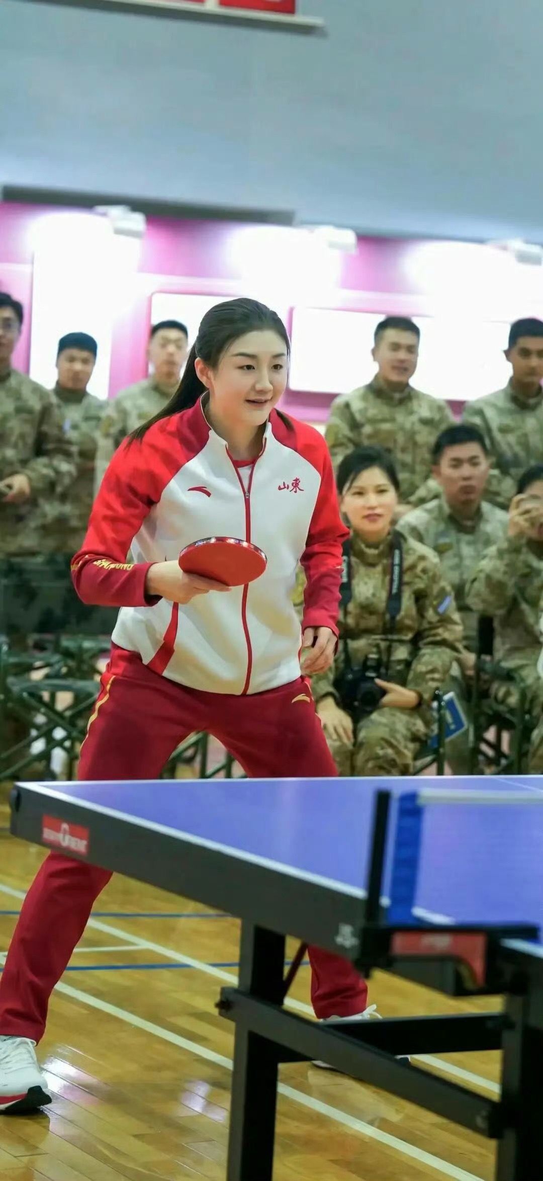 奥运冠军陈梦穿国家队队服走进军营,球台前攻防间尽显专业水准 —— 灵动走位、精准扣杀,连常年训练的官兵都忍不住叫好。她不光陪练过招,还亲手递上签名球拍,没半点冠军架子。