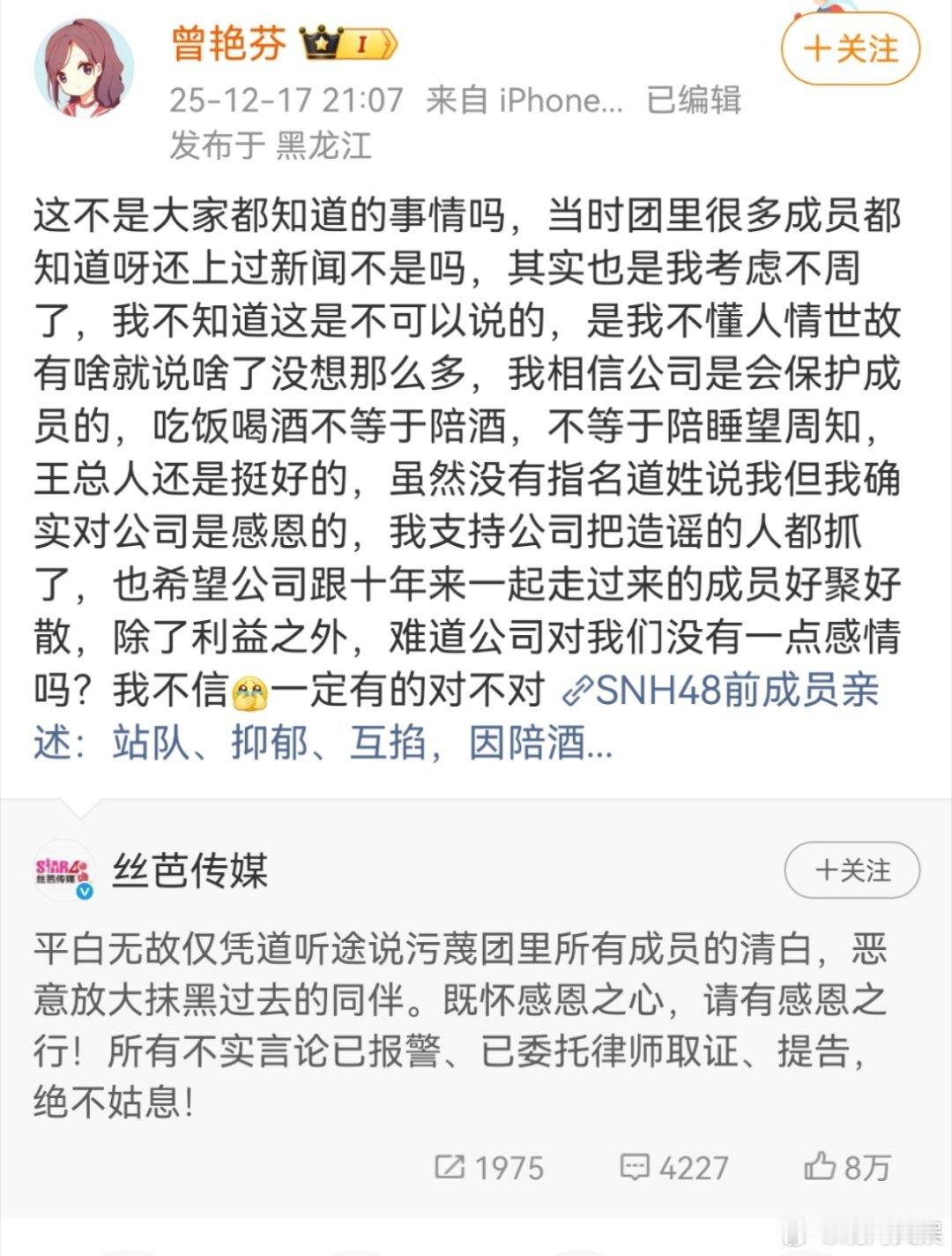 曾艳芬回应丝芭报警17日晚,发文:平白无故仅凭道听途说污蔑团里所有成员的清白,恶意放大抹黑过去的同伴。既怀感恩之心,请有感恩之行!所有不实言论已报警、已委托律师取证、提告,绝不姑息! 丝芭传媒报警则转发回应称:这不是大家都知道的事情吗,当时团里很多成员都知道呀还上过新闻不是吗,其实也是我考虑不周了,我不知道这是不可以说的,是我不懂人情世故有啥就说啥了没想那么多,我相信公司是会保护成员的,吃饭喝酒不等于陪酒,不等于陪睡望周知,王总人还是挺好的,虽然没有指名道姓说我但我确实对公司是感恩的,我支持公司把造谣的人都抓了,也希望公司跟十年来一起走过来的成员好聚好散,除了利益之外,难道公司对我们没有一点感情吗?我不信一定有的对不对 今日稍早,曾艳芬曾透露丝芭会挑选安排艺人去酒桌应酬,陪老板喝酒。