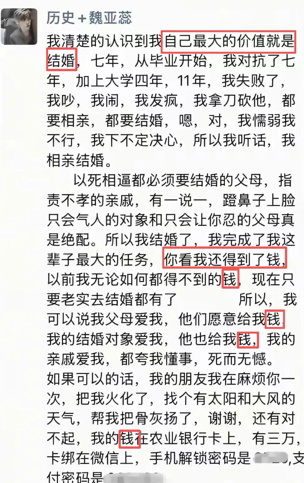 父母不肯退还27万彩礼,是压死新娘的最后一根稻草。新娘给过所有人机会,唯独委屈了自己。 她在婚礼举行的前一天就发了取消婚礼,退还礼金的消息,可她的父母不同意,到手的27万彩礼怎么舍得拿出来。 新娘家除她外还有一哥一弟,她是家里的老二,农村父母大多偏爱男丁,哥哥已经结婚生子,但弟弟还没有成家。 从她的遗书中知道,她讨厌父母催婚,但是为了孝道,她接受了父母的安排结婚,可与男方的相处过程中发现男方喜欢斤斤计较,不够宽容用新娘的话来说喜欢蹬鼻子上脸。 她也和父母说了男方的问题,可父母只会说你忍一下就好了。新娘觉得父母和对象都是粗人。 因为她遗书中谈了五次钱,父母爱她是给她钱花,对象爱她是愿意花钱娶她,她得到了以前得不到的钱。可她要的是自由。