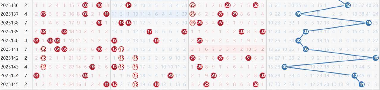 红球的重号热号势头似乎仍没停止:15连开4期实属意外,再加上12隔期重号、25和32的斜连号,上期其实仍是仿照近期整体势头出号,而蓝球则大不相同,13 14都是冷号振幅也迅速缩小,尤其14遗漏长达45期还是第一大冷号回补,红蓝对比冷热鲜明啊!