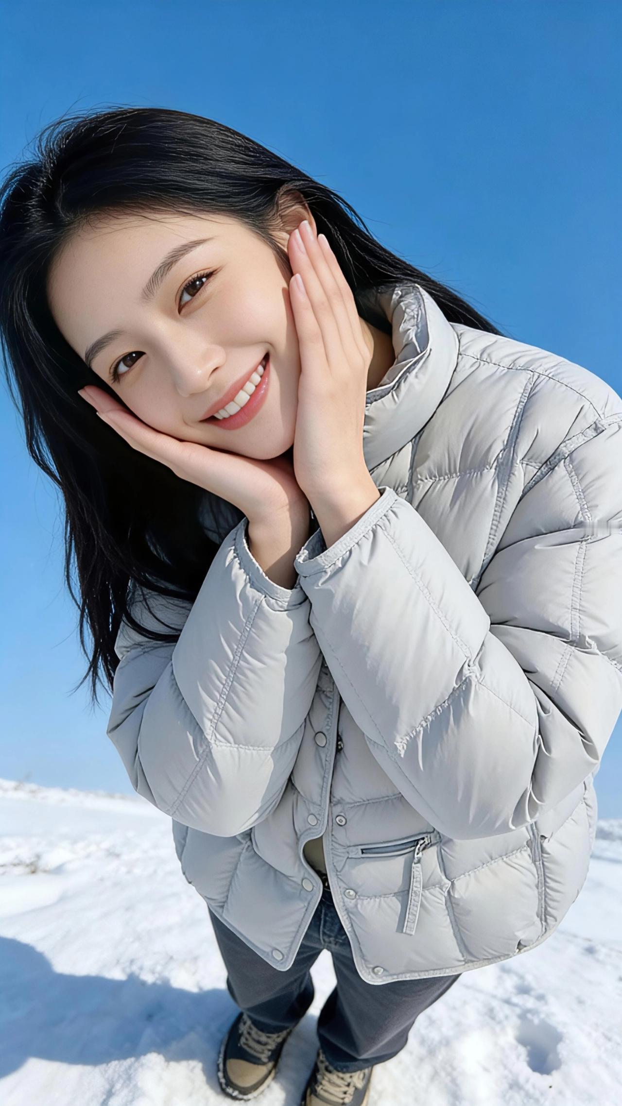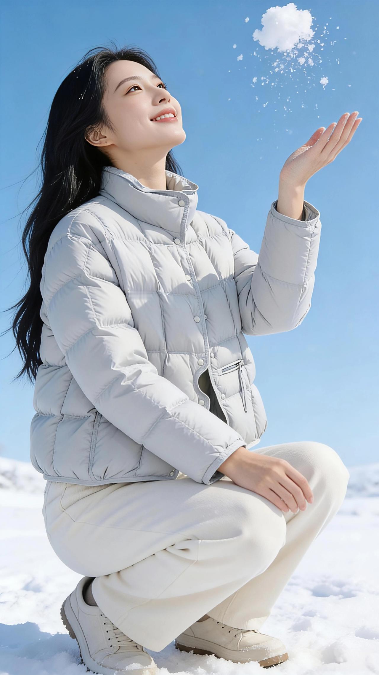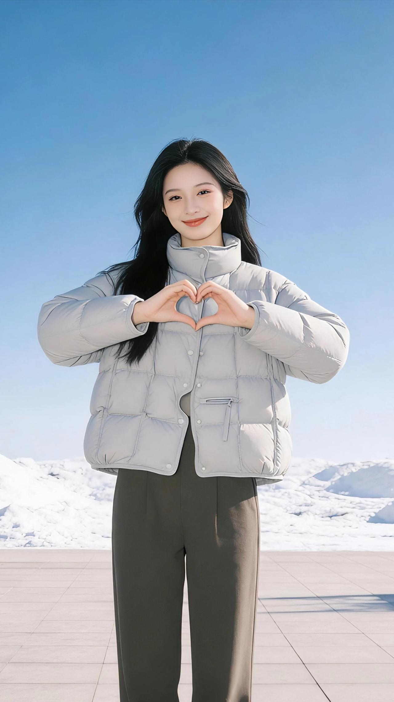 雪色里的温柔序章 冬日的风裹着碎雪掠过旷野,澄澈的蓝天像一块被洗练过的蓝宝石,铺展在天地尽头。她立在雪色里,浅灰色的羽绒服蓬松得像云朵,把凛冽的寒意都温柔地隔在身外。 脚步轻踩过厚雪,发出簌簌的微响,像是冬日独有的絮语。抬手挥手时,袖口的蓬松边漾起浅浅的弧度,与空中飘落的雪粒相映;蹲下身轻扬手掌,一团雪沫便在阳光下散开,晶亮的碎屑沾在她的发梢,像缀了星星。手插在衣兜时,唇角弯起的笑意揉碎了冬日的清冷,而比出心型的那一刻,连寒风都似化作绕指的温柔。 她托着腮望向镜头的模样,更像雪地里开出的一朵暖花,眉眼间的明媚撞开了冬日的沉寂。这片纯白的天地里,她的身影是最鲜活的笔触,把冬日的冷冽,写成了温柔的诗高级感穿搭 豪不费力的打工人体面穿搭 穿出你的时尚你的感觉