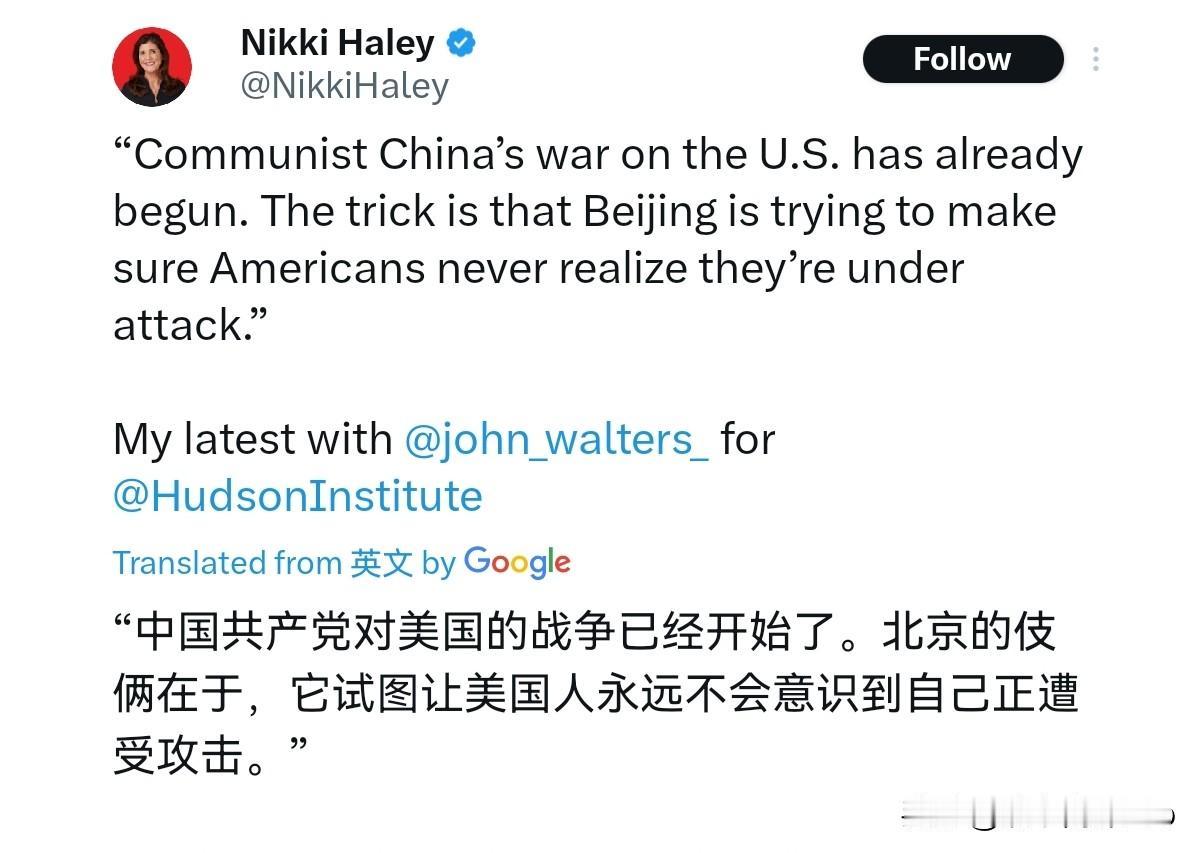 美国前驻联合国大使黑莉声称,中国对美国的战争已经开始。诀窍在于,北京试图确保美国