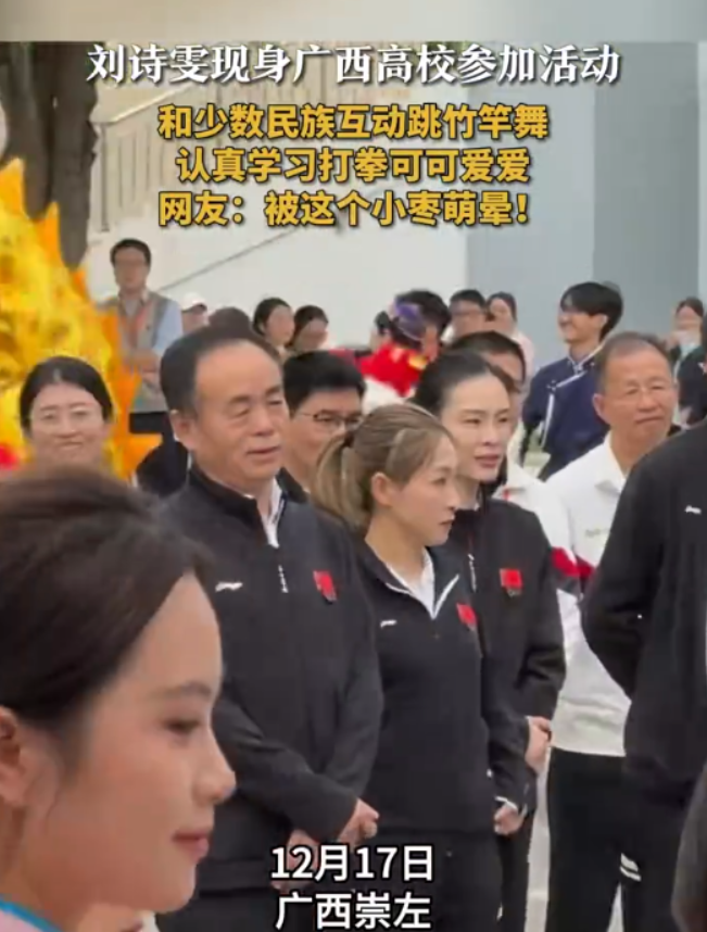 12月17日,刘诗雯、吴敏霞等奥运冠军现身广西民族师范学院参加活动,受到热烈欢迎。刘诗雯被当地少数民族邀请一起跳竹竿舞,并认真学习打拳,十分可爱。网友:被这个小枣萌晕!