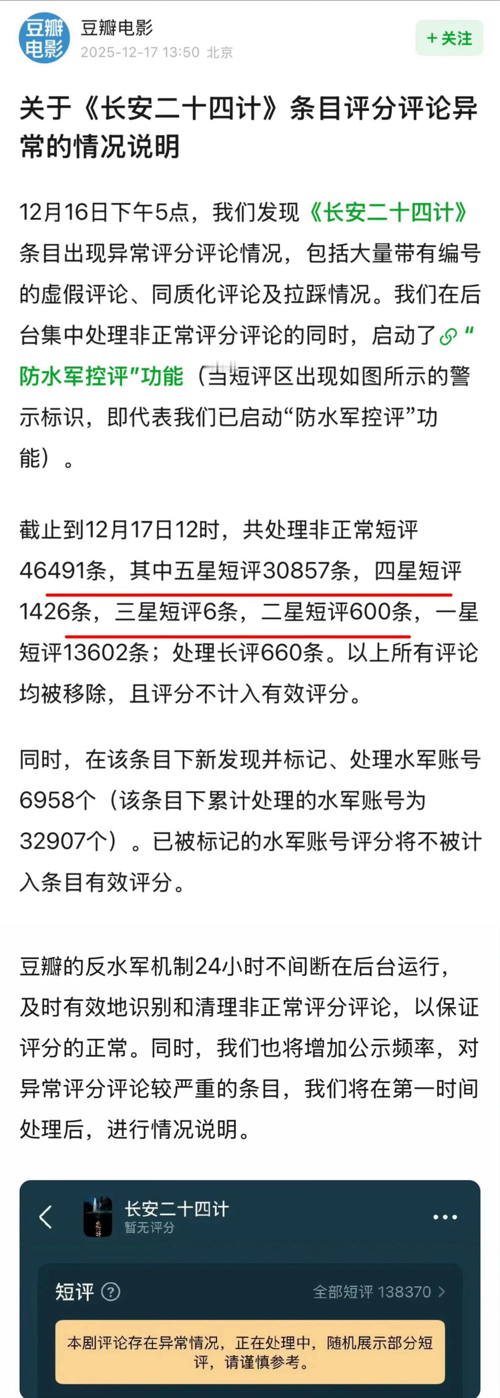 《长安二十四计》这是挂机器刷好评吧……豆瓣官方称处理了3万多条5星短评,是一星二星总和的两倍多,太夸张了,此前网友也截图到还有许多四星水评,但是看处理掉的数量,感觉还有水分存在。 长安二十四计 长安二十四计豆瓣异常五星3万多条
