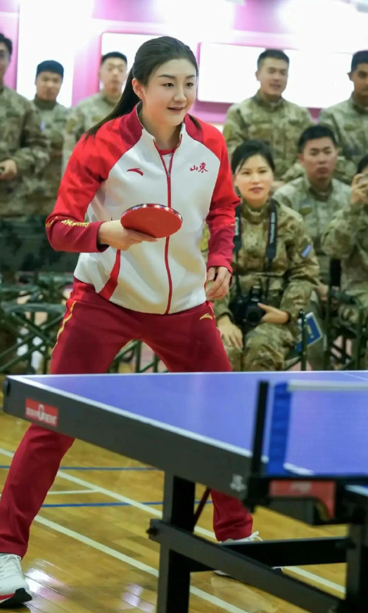 近日以交流嘉宾身份,和山东队下部队参加“奋斗者”交流会,其间陈梦不仅与部队官兵互动合影,还赠送了签名球拍,并且还与官兵进行了乒乓球切磋。