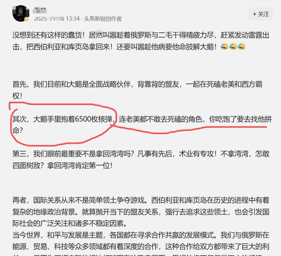幼稚可笑 把“背靠背”当成免死金牌,本身就挺讽刺。好像只要现在合作,就能一键清空历史账单,还得感恩戴德、闭嘴不谈。问题是,历史不是情绪按钮,说关就能关。过去三百年,沙俄和前苏联从中国身上拿走的土地,以“万平方公里”为单位计算,这是事实,不是情绪宣泄。你一提历史就扣“愤青”帽子,这逻辑本身就很偷懒。 再说核弹。动不动就搬出“对方有6500枚核弹”,听起来挺唬人,其实更像自我催眠。那我们没有吗?核威慑存在的意义,本来就是“谁也别真动手”,而不是用来吓唬自己、替别人壮胆的。真要按“谁核弹多谁有理”这套世界观,那国际秩序早就不存在了。 更滑稽的是,有些人一边高喊“战略理性”,一边自动替对方洗白,把现实利益包装成道德高地。国家间合作是阶段性的,是算账算出来的,不是结拜兄弟。今天能合作,不代表你就要自动失忆,更不代表讨论历史、警惕风险就是“脑残狂吠”。 真正危险的,从来不是讨论问题的人,而是那种一遇到复杂问题就立刻跪下喊“别惹事”的思维。理性不是装聋作哑,战略也不是自我阉割。把清醒当极端,把警惕当挑衅,这才是真正的幼稚。