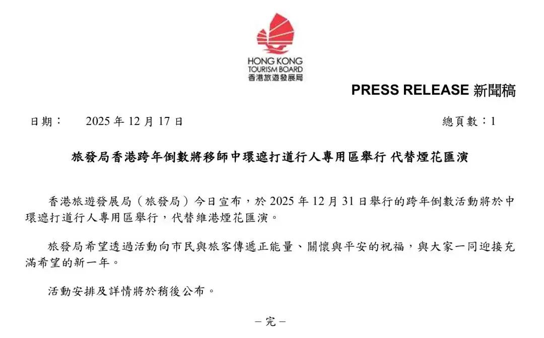 香港取消维港跨年烟花汇演 改以倒数活动迎新年** 香港旅游发展局宣布,为应对当前的实际情况,原定于2025年12月31日在维港举行的跨年烟花汇演将取消,改由盛大的跨年倒数活动取代。 旅发局表示,此次改动旨在通过充满正能量的倒数庆典,向市民与旅客传递关怀与平安的祝福,共同迎接充满希望的新一年。活动现场将安排丰富多彩的庆祝环节,让大家在欢快的氛围中迎接新年的到来。 尽管没有烟花点缀,但香港依然希望用温馨的方式,传递团结与希望的精神,展现城市坚韧向前的信心与力量。