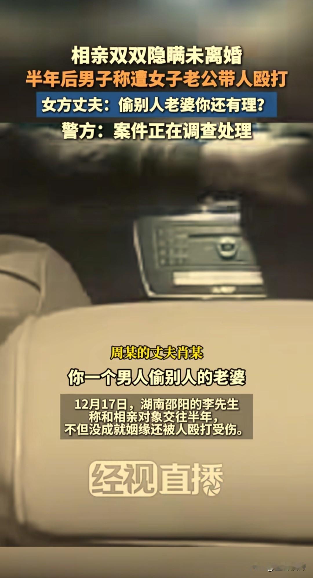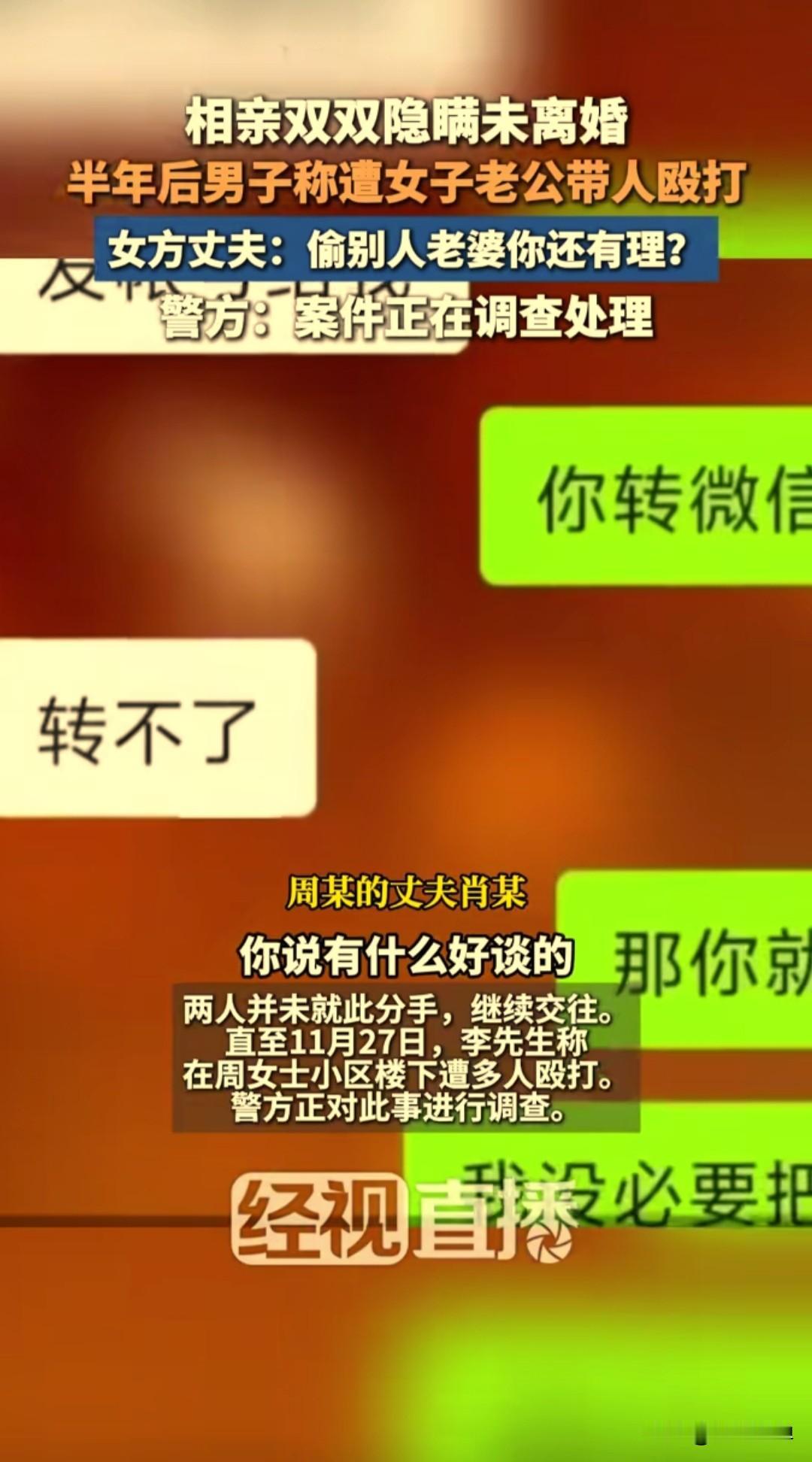 湖南邵阳的李先生在今年5月份去婚介所找对象,认识了一名自称已经离婚的周女士,两人很快确立了恋爱关系。 没想到两人交往了半年,李先生被周女士丈夫带人殴打了一顿,周女士丈夫质问说,你一个男人偷别人的老婆,还这么的有道理。 原来这两人认识了交往中发现,彼此都隐瞒了关键信息,李先生有家庭没有离婚,周女士也是和丈夫因为琐事闹离婚状态,实际也没有办理离婚手续。 两人都知道了真相,也没有分手,一直在交往,在11月27日这天,李先生去找周女士,在周女士住的楼下被周女士的丈夫王某及多人殴打致伤目前警方已对此事介入调查。