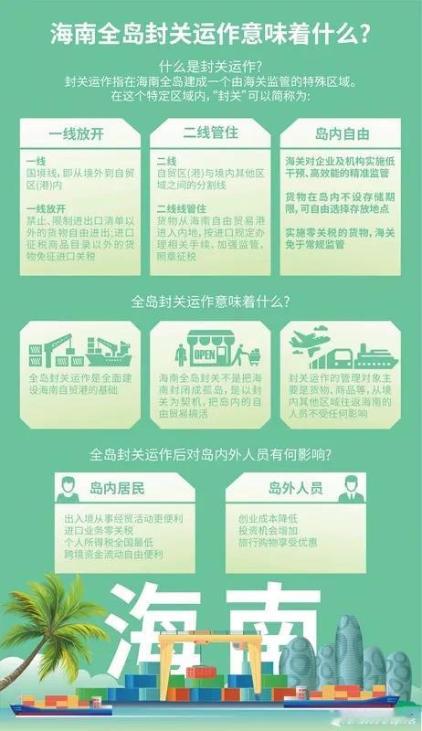 海南自贸港正式启动全岛封关 2025年12月18日,海南自由贸易港正式启动全岛封关,这是我国扩大开放的标志性举措。封关并非“封岛”,而是实施“一线放开、二线管住、岛内自由”政策。 “一线”方面,海南与境外的货物、人员、资金跨境流动更高效;“二线”则对“一线”放开内容精准管理。岛内要素可自由流通,企业能低成本开展生产等活动。此外,封关后“零关税”商品税目从1900个增至6600个,管理方式由正面清单转为负面清单。 这标志着海南自贸港建设进入新阶段,未来将持续扩大开放,打造对外开放重要门户。 海南封关 海南自贸区封关 海南封关创业 海南自贸港政策 海南跨境自贸港