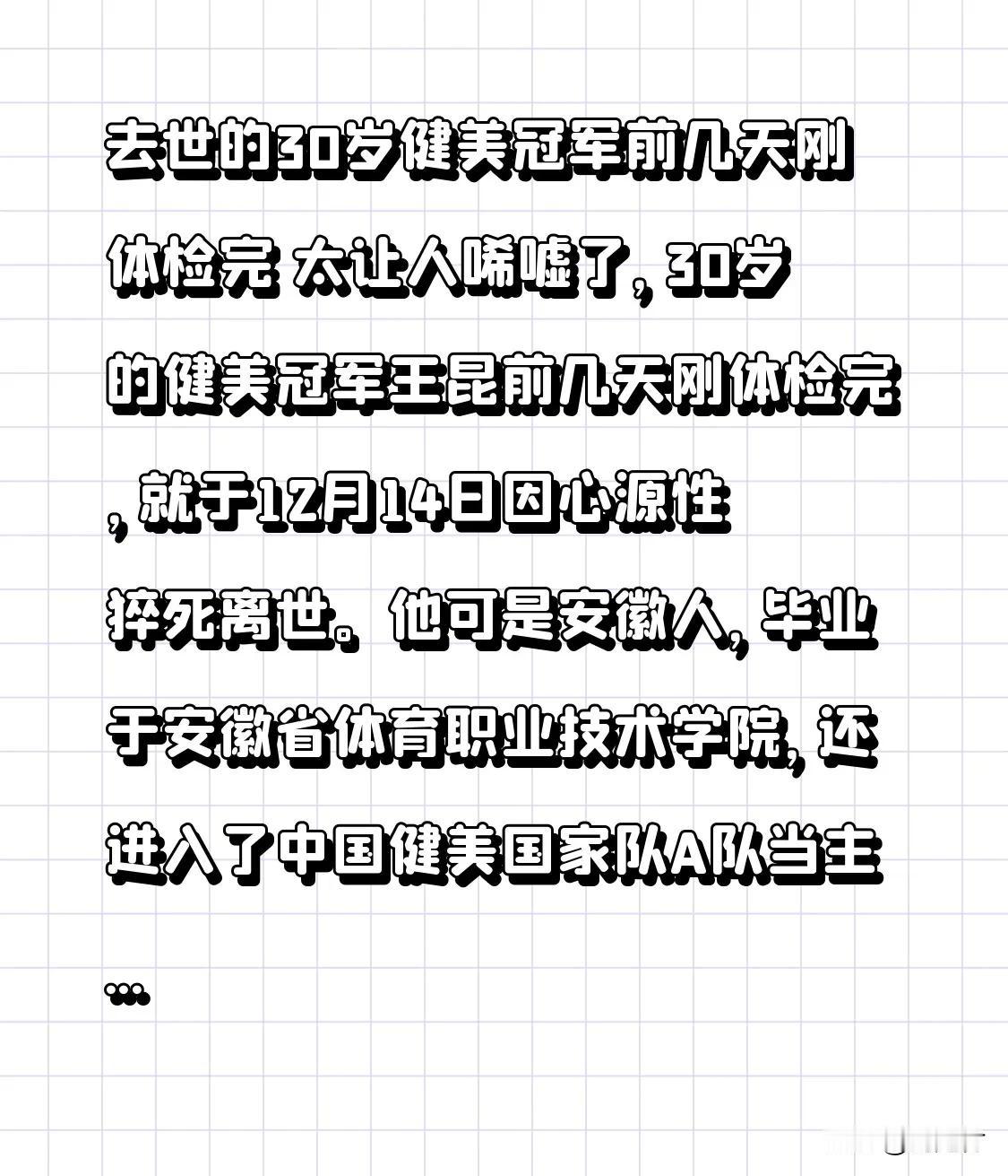 去世的30岁健美冠军前几天刚体检完 前几天刚体检完的30岁健美冠军离世,实在令人唏嘘。30岁的安徽健美冠军王昆,毕业于安徽省体育职业技术学院,入选中国健美国家队A队成为主力,斩获诸多赛事冠军,如CBBA全国健美精英职业联赛八连冠,2022年还在泰国职业卡资格赛表现出色。他于12月14日因心源性猝死离世。 王昆坚持十年“苦行僧”式健身,过年也只吃水煮鸡胸肉。有人认为他的离世或与类固醇有关,长期依赖蛋白粉、过度挑战身体极限所致。如此年轻且成就斐然的人离去,着实让人惋惜。这也提醒大家思考健身与健康的平衡。 小伙去世 健身后死亡