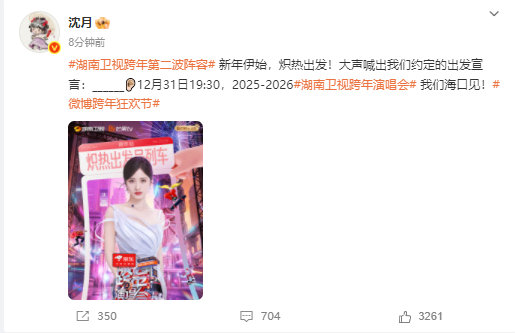 沈月官宣湖南卫视跨年沈月湖南卫视跨年官宣哇哦!!!沈月官宣湖南卫视跨年啦~咱就