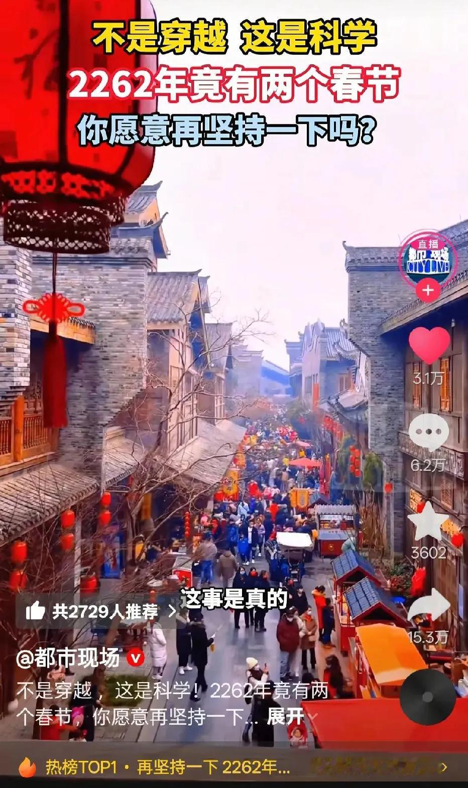 2262年,竟然会有2个春节!2个春节啊!这是个好消息,那时候一定很热闹吧!想想都开心!可是,等等……2262年,减去今年,是隔了多少年来着?拿出计算器算了一下,中间隔了237年! 这……还能等到吗,努力努力,坚持坚持等吧…… 看新闻里说了,上一次出现这种罕见的现象是374年前,这也是隔了几百年。。我想想,374年前,那是在哪个朝代呢? 真的感慨万千,时间带走了一切,希望时光慢点,大家都好好的,相遇就是缘分,你说呢?