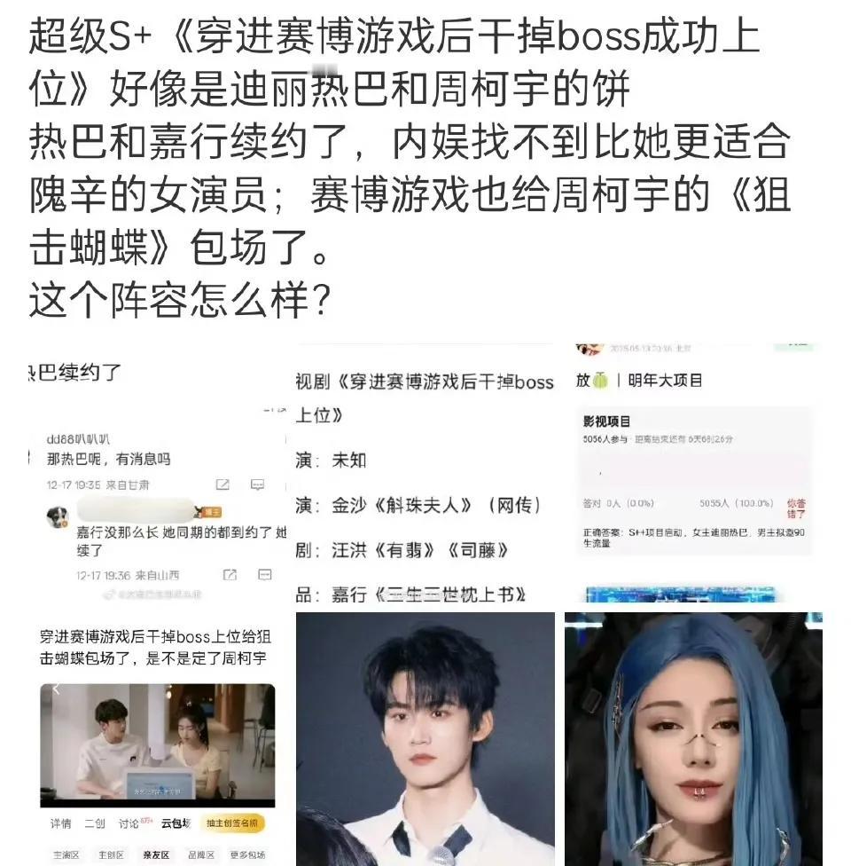 周柯宇资源上升明显,网传将搭档迪丽热巴出演嘉行自制剧《穿进赛博游戏后干掉boss成功上位》。该剧由嘉行持有版权,特效占比高、剧情节奏快,改编难度极大,稍有不慎便易口碑扑街。迪丽热巴在剧中自带姐感,二人的CP组合引发不少关注。 网友评论: 周柯宇这资源飞升得也太快了吧,直接搭迪丽热巴,这步棋走得够稳的。 嘉行自制剧给热巴主演很正常,就是这剧的名字也太长了,光念一遍都费劲。 赛博题材+大量特效,改编难度真的不小,拍好了是爆款,拍砸了就是大型扑街现场。 热巴的姐感太贴这种强强设定了,姐弟CP好嗑是好嗑,就怕剧情跟不上颜值。 周柯宇的演技能不能接住热巴的戏啊?别到时候两人同框,只靠颜值撑场面。