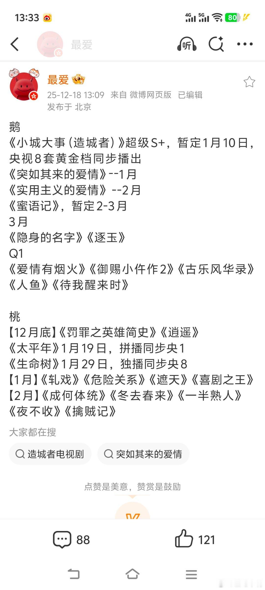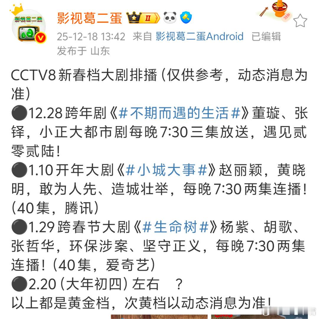 生命树排播有变!《生命树》或去央八黄金档!央一:1月中旬《太平年》2月下旬《好好的时代》3月下旬《我的山与海》央八:1228《不期而遇的生活》0110《小城大事》0130《生命树》 0219《冬去春来》