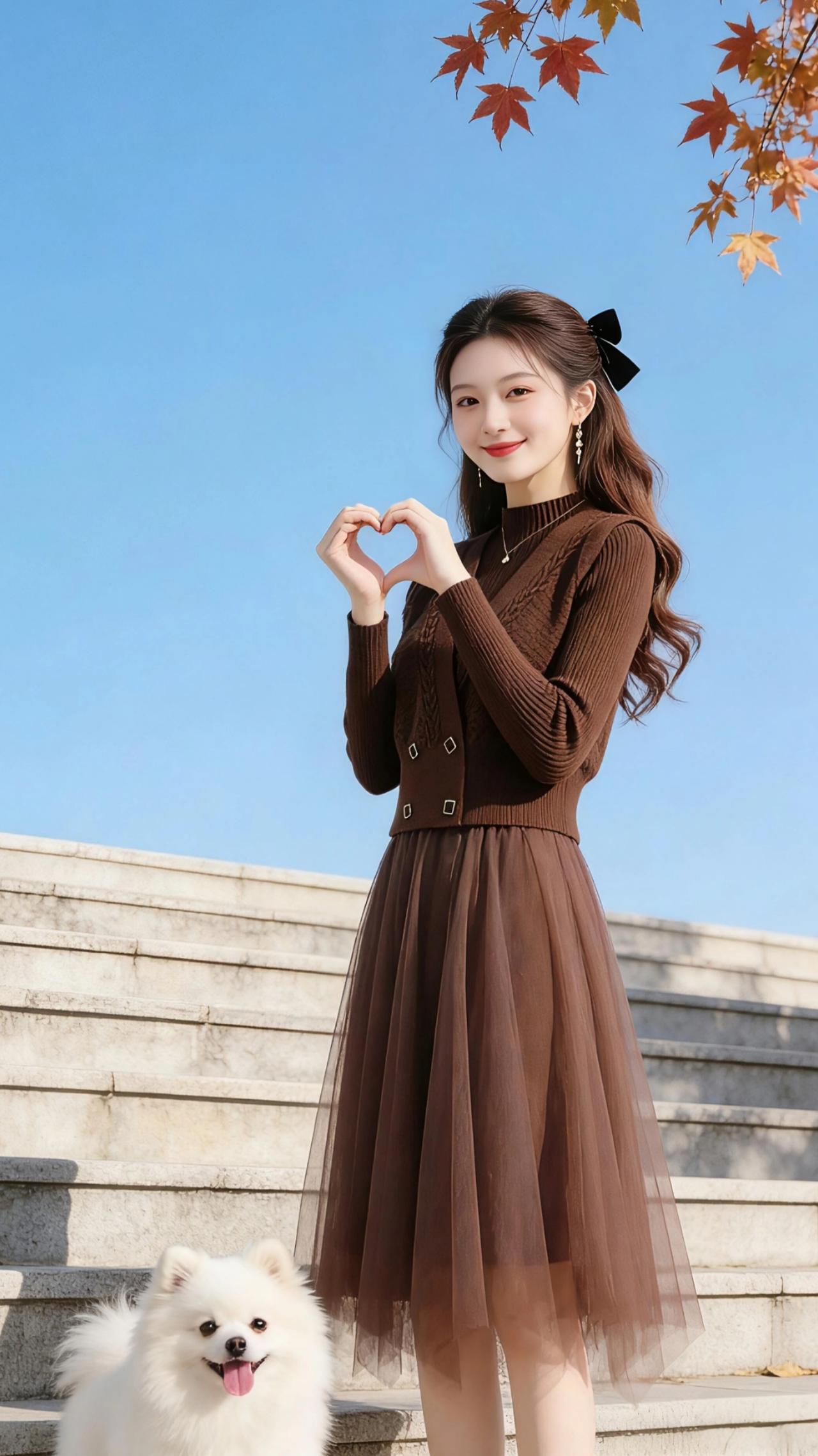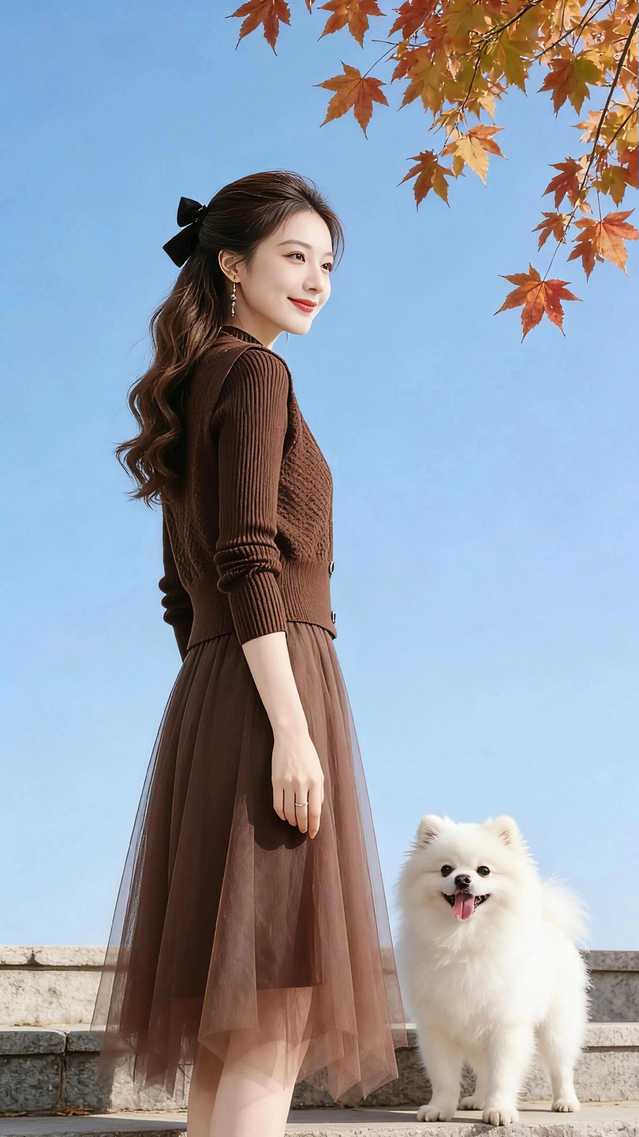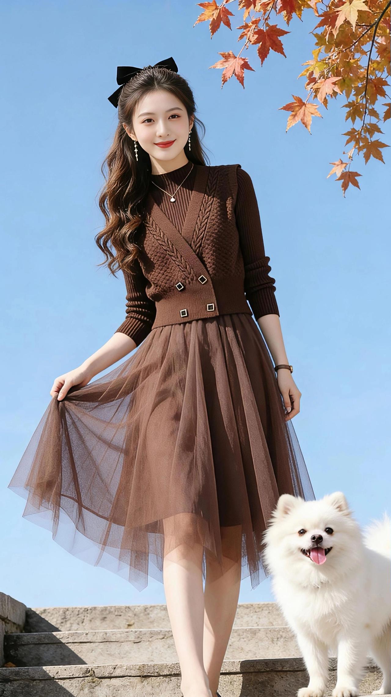 秋与暖 秋日的风掠过枝头,将枫叶揉成焦糖色的诗笺,悬在澄澈如洗的蓝天上。我踩着石阶的微凉,裹着一身棕咖色的温柔,与蓬松的白博美并肩站在这方秋景里。 针织的纹路摩挲着肌肤,像接住了秋日里最软的一缕阳光,纱裙的褶皱随微风轻扬,与飘落的枫叶缠成温柔的絮语。小狗吐着舌头,白绒绒的身子在身侧晃悠,鼻尖蹭过裙摆时,带起一阵暖融融的欢喜。 我抬手拢了拢发间的黑蝴蝶结,指尖触到耳坠的微凉,转头时,小狗正仰头望着我,眼里盛着整片蓝天的澄澈。原来秋从不是寂寥的,它是焦糖色的针织衫裹住的暖,是纱裙与枫叶共舞的柔,是身边小生命摇着尾巴,把寻常的秋日时光,酿成了甜甜的蜜糖。高级感穿搭 冬季穿搭 针织衫