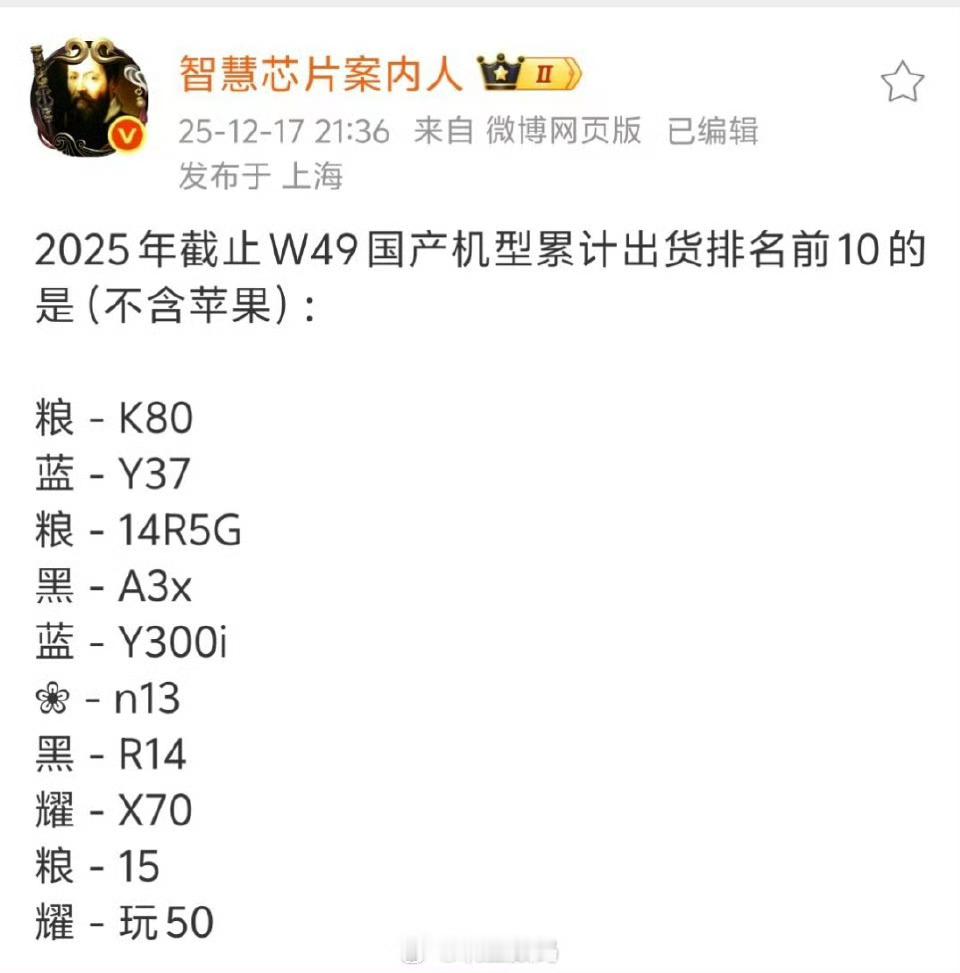 截止W49国产机型累计出货排名TOP10,REDMIK80小米15入榜,且