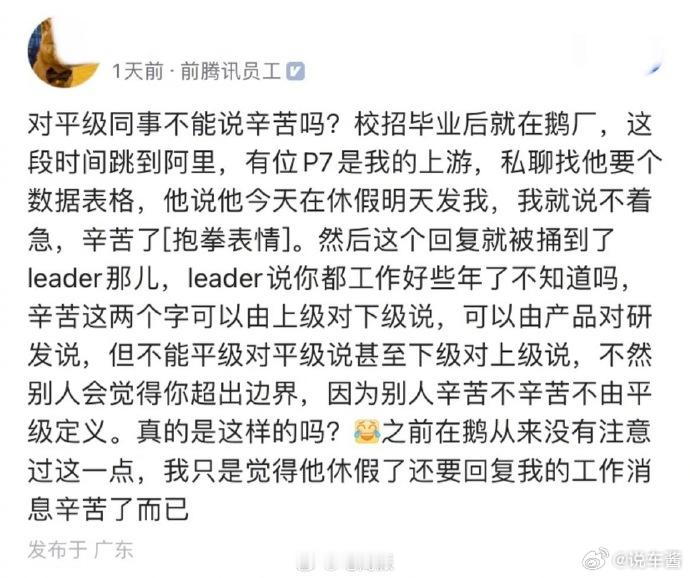 只能上级对下级说辛苦,平级不准说?阿里这么病态的吗?