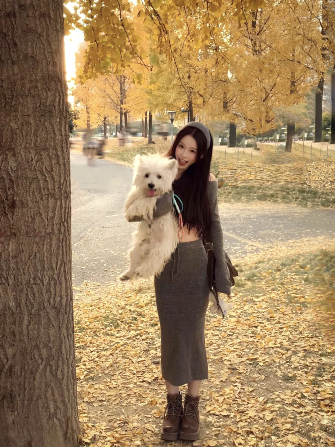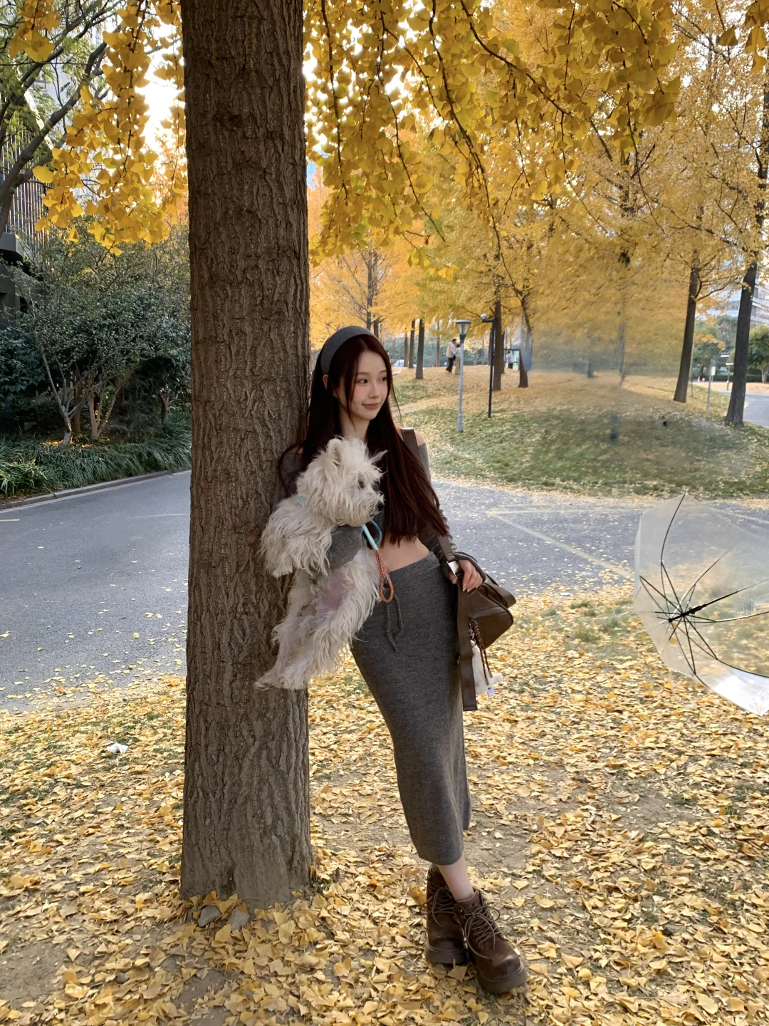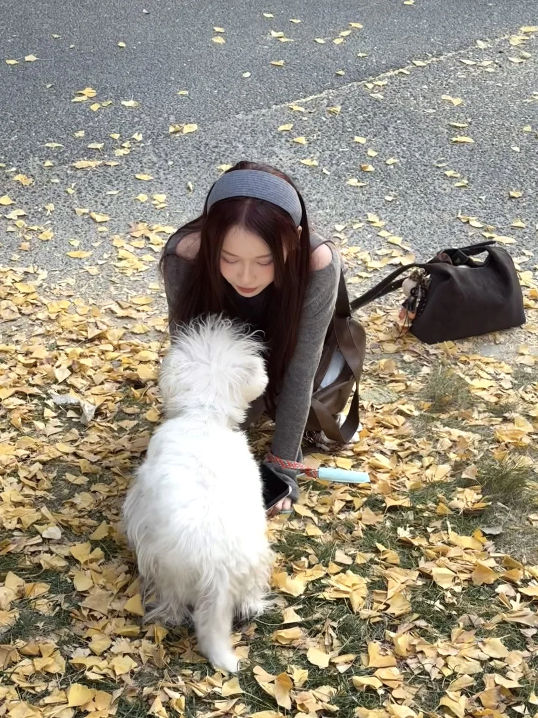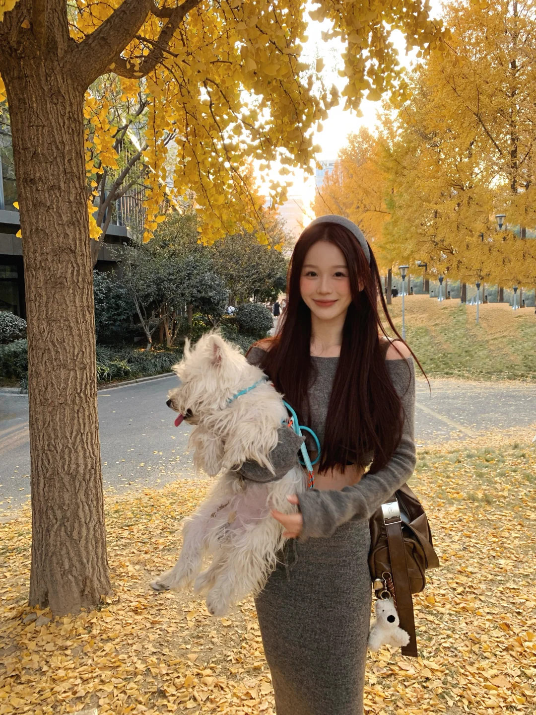 去拍银杏啦 在秋天和小狗🐩的记忆又多了一段 ootd有点姐感? “是吧 小狗”