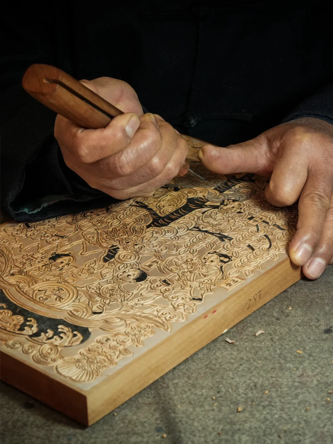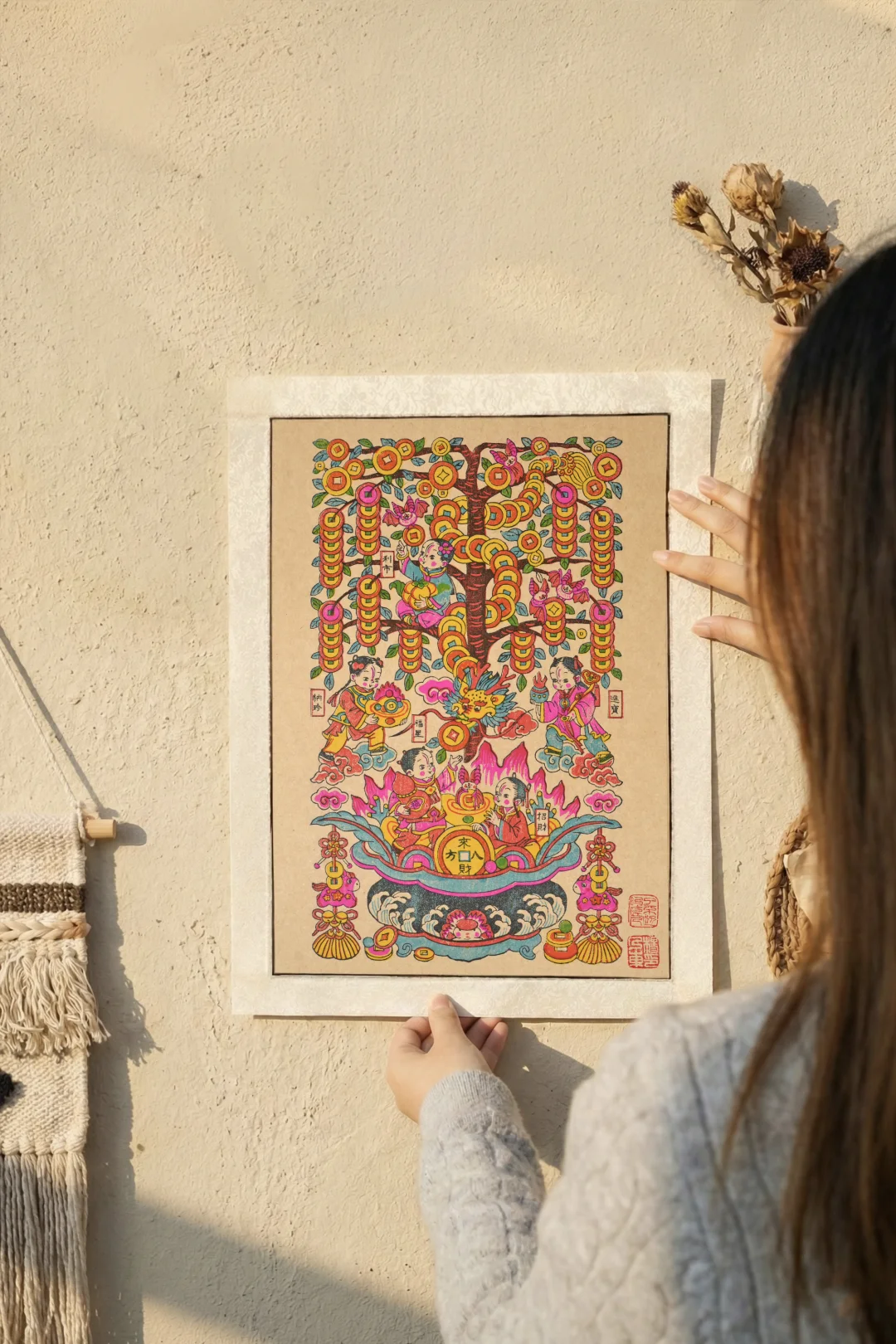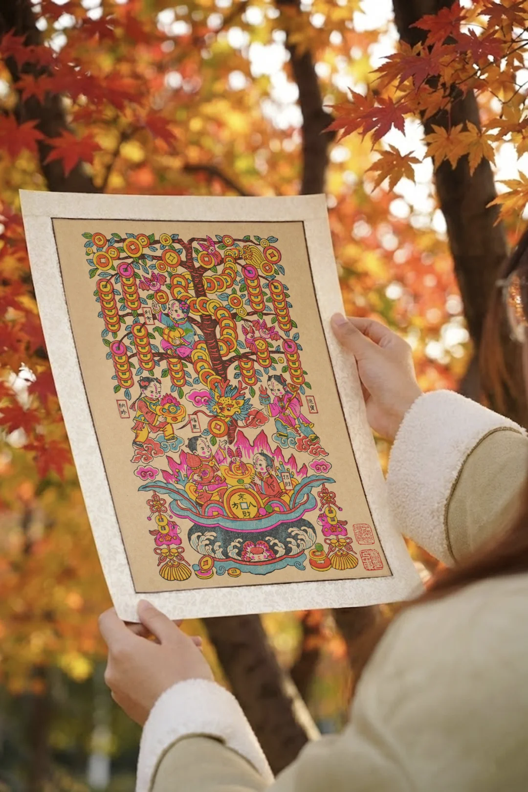 第一批200张已经全部售罄 看来快到2026 大家已经提前在准备新年礼物啦! 每一张年画的制作 要经过五张模板的印制 这便是传统的雕版印刷技艺 每一张都有着原作的色彩 今年的「五福摇钱树」 经过我们半年的改造 重新构图、雕版、 画面更饱满 也更加适合日常家居 第二批开始啦 记得点击下方链接 开启好运连连的2026!!