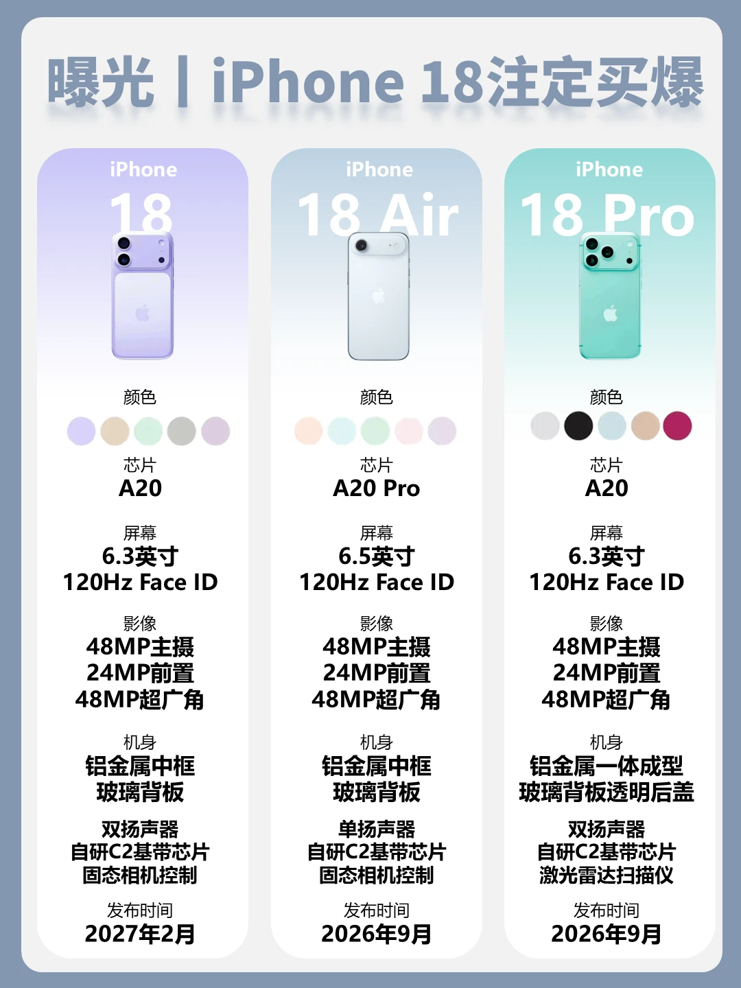 [自拍R]宝子们,iPhone 18 的全系列配色基本已经明牌了,这代苹果明显在做一件事:👉 用颜色区分人群,而不是配置!!! 1️⃣iPhone 18(数字版) 整体思路:柔、浅、偏日常 低饱和紫 / 米白 / 薄荷绿 / 深灰 ✔ 优点: • 不挑人、不挑性别 • 裸机也不显廉价 • 长期使用不容易审美疲劳 2️⃣iPhone 18 Air 关键词只有一个:轻 白 / 奶油色 / 极浅色系 这代 Air 的颜色明显是给: 📌 女性用户 📌 极简审美 📌 轻度使用人群 ✔ 好看是真的 3️⃣iPhone 18 Pro 这一代 Pro 的变化最激进。 紫 / 粉 / 蓝 / 绿色 + 经典银灰 明显在干一件事: 👉 把“Pro 不等于商务黑”写在脸上 ✔ 超大爆点: • 彩色 Pro 正式常态化 • 透明后盖 + 一体金属观感很强 🔥千万记得:一句话选色建议(收藏用) • 怕翻车:米白 / 浅灰 • 想显年轻:浅紫 / 薄荷绿 • 数码感拉满:Pro 蓝 / Pro 绿 • 审美激进:Pro 粉(但真不适合所有人) [自拍R]这代 iPhone 18 的颜色逻辑已经很清楚了: 📌 数字版负责安全 📌 Air 负责好看 📌 Pro 负责表达个性 那宝子们你会为了颜色,第一次选非 Pro 吗?👇 大家快来聊聊我想看看真实选择。[doge][doge]