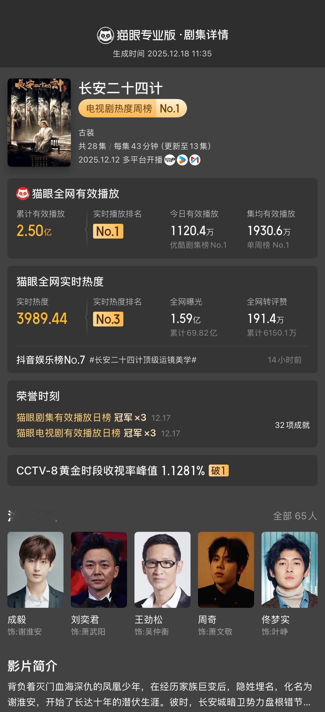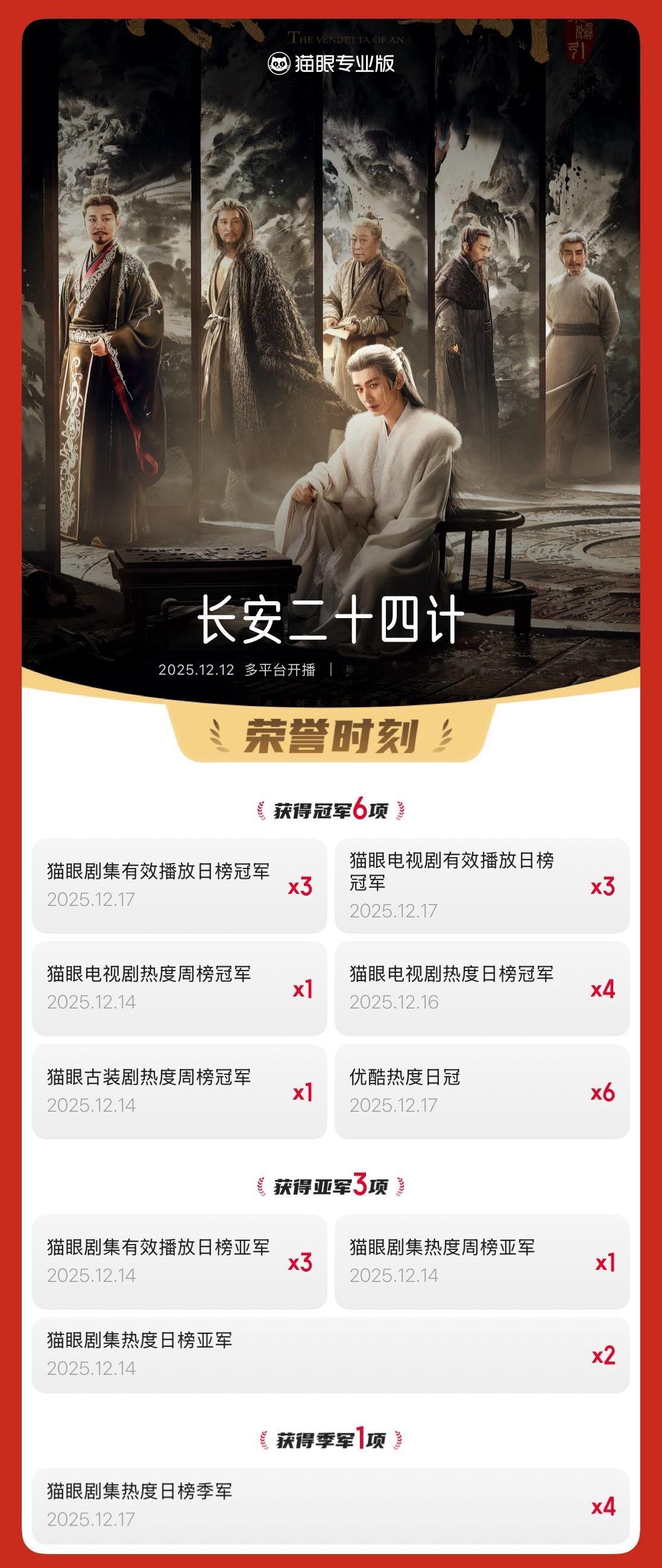 长安二十四计长安二十四计连续3天登顶剧集有效播放榜 据猫眼专业版数据,领衔主演电视剧《长安二十四计》热播中,连续3天登顶猫眼剧集有效播放榜!截至当前全网有效播放量已超2.5亿。