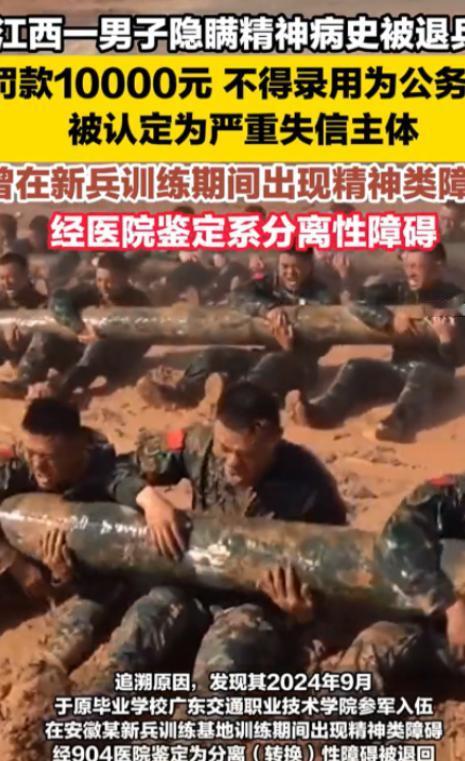 江西九江,一男子自愿报名参军,体检、政审和役前教育都顺利过关,成功进入部队。可就在部队为他办理军人保障卡时,系统却显示无法注册。一查才发现,这人原来是有“前科”的,这才知道他此前就因病被退回,而这一次就不止退回那么简单了,还被罚1万。 事情的主人公刘某(化名),是九江当地一名适龄青年。多年前,他曾怀揣着朴素的军旅梦想报名参军,并顺利入伍。 起初,一切看起来与其他新兵并无二致,但在随后的服役过程中,刘某逐渐出现了一些异常行为。 据知情人士透露,当时刘某在高强度训练和封闭管理环境下,先后出现情绪突然失控、短暂失语、身体僵硬甚至意识模糊等症状,情况一度较为严重。 部队立即按规定将其送往军队指定医院接受系统检查。经精神科专家多轮评估,最终诊断其患有“分离转换性障碍”,又称转换症,属于精神心理功能失常的一种。 军医在鉴定意见中明确指出,该病症在高压力、强纪律环境中存在复发和加重风险,可能对本人健康和部队安全造成影响。 按照相关规定,刘某被认定为不适合继续服役人员,随后办理退役手续,退回原籍,相关医学结论和退役原因也被录入军人信息系统。 几年后,征兵季再次来临。刘某始终放不下“当兵”的念头,在明知自己曾因医学原因被退役的情况下,仍再次前往当地兵役机关报名参军。 在填写应征信息和承诺书时,他选择了隐瞒既往服役史和精神医学鉴定事实,并作出“身体和心理条件符合服役要求”的书面承诺。 令人意外的是,在体检、政审和役前教育等环节中,刘某均顺利过关,并最终被批准入伍,进入部队开始新兵训练。 这一过程,也让不少网友在事后质疑:为何“有前科”的人还能再次通过层层审查?对此,兵役部门回应称,征兵审查依赖个人申报与多部门信息比对,隐瞒行为具有一定迷惑性。 真正的转折发生在部队为新兵统一办理军人保障卡时。 工作人员在系统中多次尝试注册刘某信息,均提示“无法登记”,并显示其存在历史异常服役记录。经进一步核查,刘某曾服役并因精神医学原因被退役的事实逐渐浮出水面。 部队迅速启动调查程序,并将情况通报地方兵役机关。面对确凿证据,刘某最终承认,自己抱着“再试一次”“不说就没人知道”的心理,刻意隐瞒了真实情况。 调查结果明确后,相关部门依法依规作出处理决定:刘某被立即退回原籍,不再具备服役资格。 同时,因其存在故意隐瞒重要事实、骗取参军资格的行为,构成严重失信,依法被纳入国家国防失信人员名单。 处罚结果一经公布,迅速在网络上引发热议。 根据处理决定,刘某除被处以1万元罚款外,还面临多项联合惩戒措施:两年内不得被录用为公务员。 不得进入国有企业或事业单位工作;限制出境旅游或境外就业;在惩戒期内不得复学或升学。 消息传出后,舆论迅速分化。有网友表示惋惜,认为刘某“一心想当兵”,主观动机并非恶意,“只是太执着了”。 也有人直言处罚合理,“参军不是儿戏,隐瞒病史一旦在部队出事,后果不堪设想”。还有心理学从业者借机呼吁,社会应更加正视心理疾病,既不要歧视,也不能忽视其风险。 兵役机关相关负责人在接受采访时表示,国家征兵制度对身体和心理条件都有严格要求,目的并非“卡人”,而是保障个人安全和部队整体战斗力。 “不适合服役,并不代表一个人没有价值。但隐瞒事实、突破制度底线,是对法律和集体安全的不负责任。” 该事件也成为当地征兵宣传中的典型案例。 兵役部门提醒广大适龄青年,应如实申报个人健康和经历,理性看待参军条件,把守法和诚信作为第一前提。军旅梦想值得尊重,但前提是遵守规则、尊重专业判断。 目前,刘某已返回原籍,相关处罚正在执行中。这起事件也给社会敲响了一记警钟:在制度面前,任何侥幸心理都可能付出沉重代价。