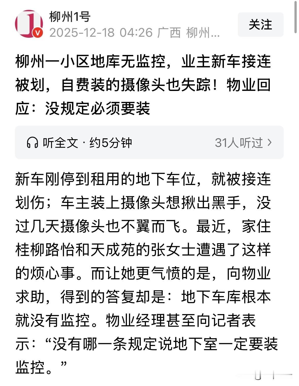 广西柳州,女子把新车停在租来的车位上,却接二连三被人恶意划花,由于物业没给地库装监控,她3次报警也没能抓到搞鬼的人,女子只好自掏腰包在车上装了个摄像头,可没过几天,连摄像头都离奇消失了,所有损失加起来5000块。她去要说法,却被物业经理怼了回来,说哪条法律规定了地库非得装监控? 7月份,张女士家添置了一辆新能源车,并自家小区地下负一楼租了个固定车位。 然而,车还没宝贝几个月,就遭到了人为的恶意破坏。 10月27号这天,张女士在外面办事,无意间发现爱车的右后侧,赫然多了两道又深又长的划痕,一看就是被人故意刮的。 张女士心疼不已,立刻报了警,查了外面的“天网”监控,可惜没找到线索。 民警分析,这划痕多半是在地库或者其他没监控的地方弄的。张女士当即就怀疑是自家小区地库出的事。 没想到,一波未平,一波又起。 第二天一大清早,张女士去车库取车,只见左后车门上,竟然又添了一道将近一米长的崭新大划痕。 张女士这次可以肯定,这绝对不是意外,肯定是有人故意干的。 看着爱车伤痕累累,张女士心头的火蹭蹭往上冒。她立马冲到小区物业,要求调取监控录像,找出那个使坏的家伙。 然而,物业工作人员却说,地下车库没装监控,我们这儿没录像可查,你还是报警吧! 张女士气上加气,车位是租的,管理费一分不少地交着,出了事连个查证的办法都没有? 她强压着火气,再次拨打了110。民警来了,跟着去了监控室,结果更让人无语,好几个监控屏幕都是黑的。 民警提出看看车位附近有没有能用探头,工作人员还是那句话:没有,没装! 车子莫名其妙被划了两次,物业除了让报警,再没给个像样的说法。张女士心里已经够堵了,可这事儿竟然还没完。 到了12月2号,更离谱的事情发生了。张女士的车尾箱盖子上,又添了两道崭新的划痕! 这还有完没完?停个车都提心吊胆,报警也报了,物业也找了,事情却一点进展都没有。 愤怒之下,张女士决定自己掏钱破案!她自费买了个小巧的无线吸附式摄像头,安装在了自己车位正上方的电缆桥架上。 都做到这份上了,她就不信揪不出这个搞破坏的。 本以为她很快就能揪出幕后黑手了,谁知这个摄像头仅仅工作了几天,就在12月12日晚上8点21分,信号突然中断了。 张女士查看后发现,摄像头彻底失联了。她猜八成是被人直接拿走,当场就弄坏了。 摄像头装在那么高的地方,谁会专门去弄它?肯定就是划车的人干的! 张女士百思不得其解,自己平时跟邻居相处都挺好,没啥矛盾,车位租金管理费都按时交。 唯一能想到的可能,就是这个车位位置有点特殊。正好挨着单元电梯出入口。 以前经常有人图方便,把电动车停在这里堵路,物业似乎也没管到位。 张女士估计,是有人乱停车,觉得她占了位置碍事?或者她阻止过他们乱停,被人记恨上了?停车的时候顺手就用钥匙刮了?可那里明明划定了专门的电动车停放区域啊! 事情真像张女士猜测的那样吗?为了弄清真相,记者在12月16号专门跑了一趟张女士所在小区。 记者找到了小区物业服务中心。物业经理郭先生承认地下车库确实没有安装监控摄像头。 他解释说,这个小区是2013年建成的,他们物业是今年9月才刚刚接手的新管家。 开发商当初移交的时候,地下车库就没监控系统,他们新来的物业公司,也不可能凭空去装这个设备。配合调查我们肯定配合,但没监控,他们真没办法查。 当记者追问为什么物业不主动加装监控时,郭经理硬气回答:没有哪一条法律条文硬性规定说地下室必须装监控。 我们物业也没这个权力和经费去增加设备,除非全体业主都同意,大家凑钱来装这个监控。 张女士自己初步算了笔账,爱车前后被划了好几道,加上那个被人弄的几百块钱的摄像头,损失加起来已经超过5000块了。 目前,她又一次报了警。 但相比抓人,张女士现在更希望的是物业公司能真正负起责任来。 第一,她希望物业公司能尽快在地下车库加装监控,保障业主最起码的财产和人身安全!这么大个地下车库黑灯瞎火的,连个监控都没有,出了事找谁去? 第二,因为物业在管理上存在疏忽,监管不到位,才导致她的财产受到损失,她认为他们理应进行赔偿! 那么,从法律角度,怎么看待这件事? 《民法典》第942条规定:物业服务人应当按照约定和物业的使用性质,维护物业服务区域内的基本秩序,采取合理措施保护业主的人身、财产安全。对物业服务区域内违反有关治安、环保、消防等法律法规的行为,物业服务人应当及时采取合理措施制止、向有关行政主管部门报告并协助处理。 根据规定,物业有义务对地下车库进行管理,通过安装监控、加强巡逻保障业主财产安全。 张女士可依据《民法典》第713条要求物业承担未履行管理义务的赔偿责任,同时可联合业主大会要求物业加装监控设施。 对于这件事,你怎么看? 欢迎关注@一案一论