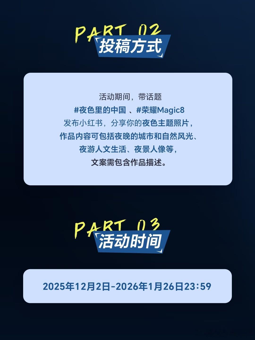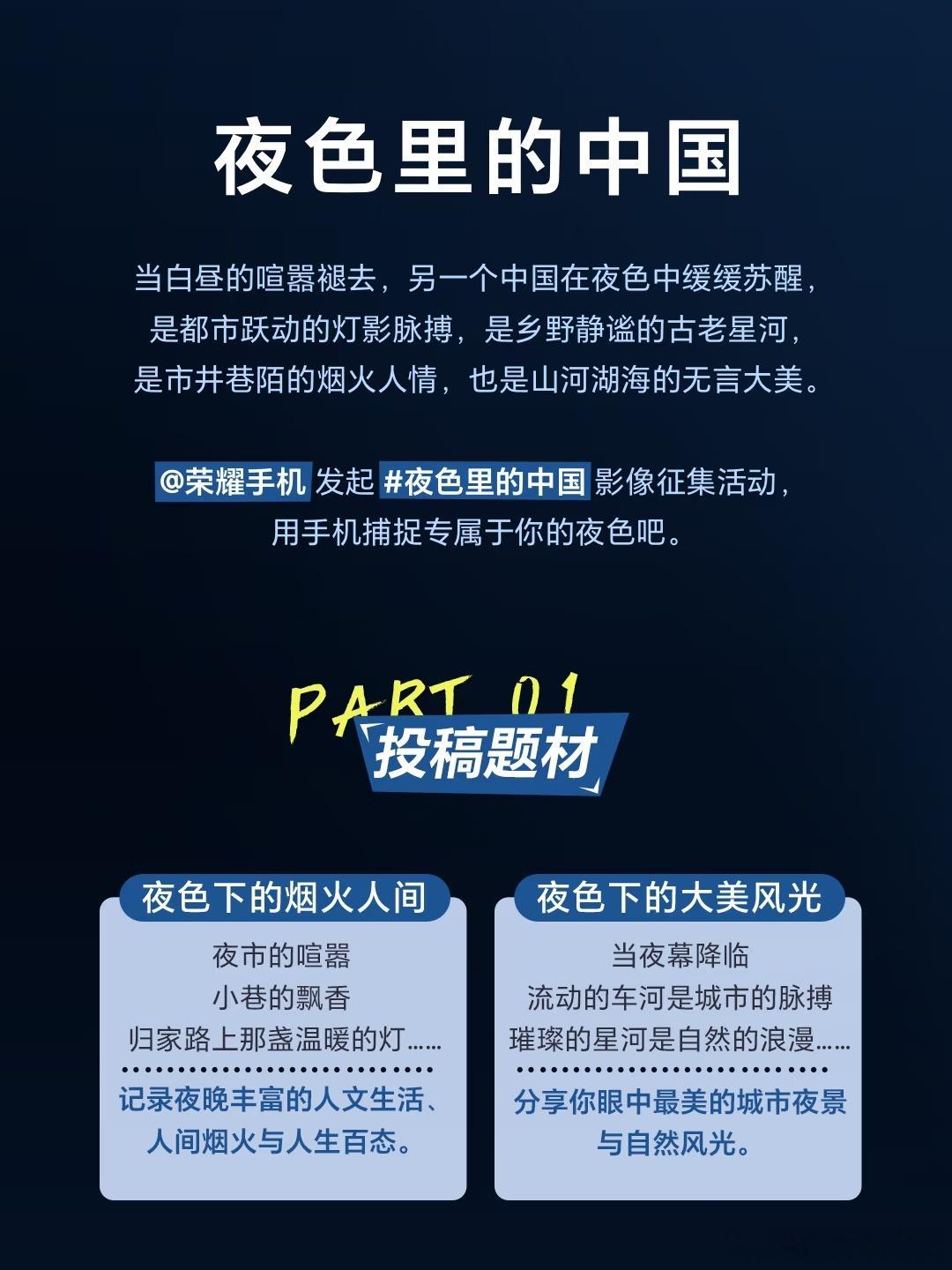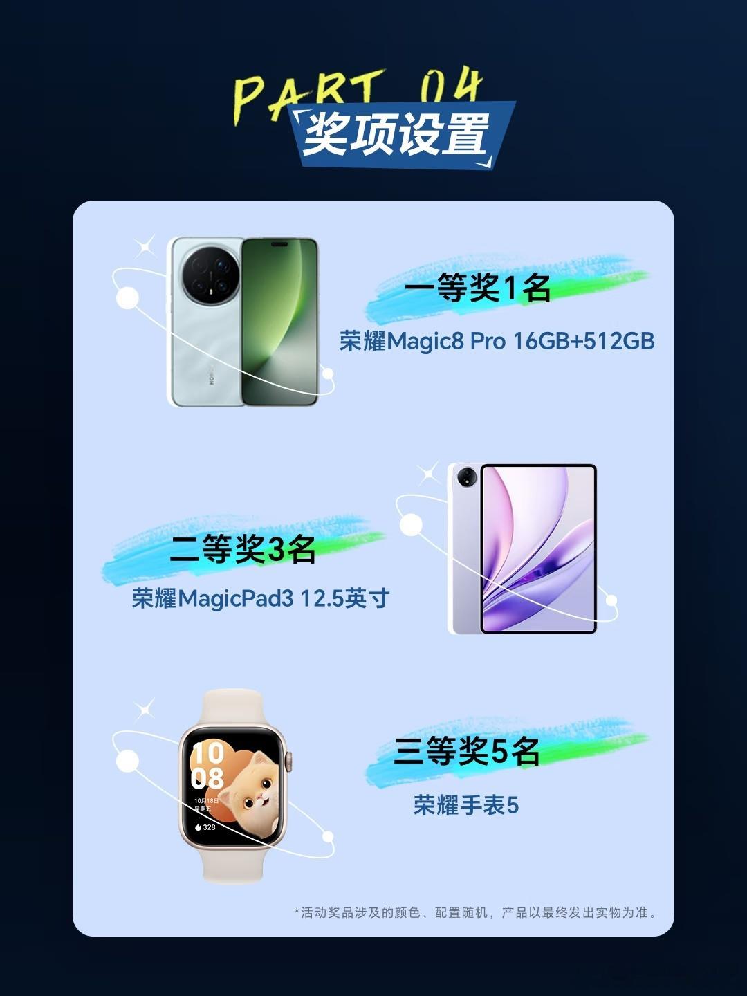 有荣耀magic8 系列手机的看过来!拍下你眼中的中国夜色,在社交平台上带话题分享出来,就有机会拿到奖品,手机、平板、手表,这不是白送嘛,快拍起来~