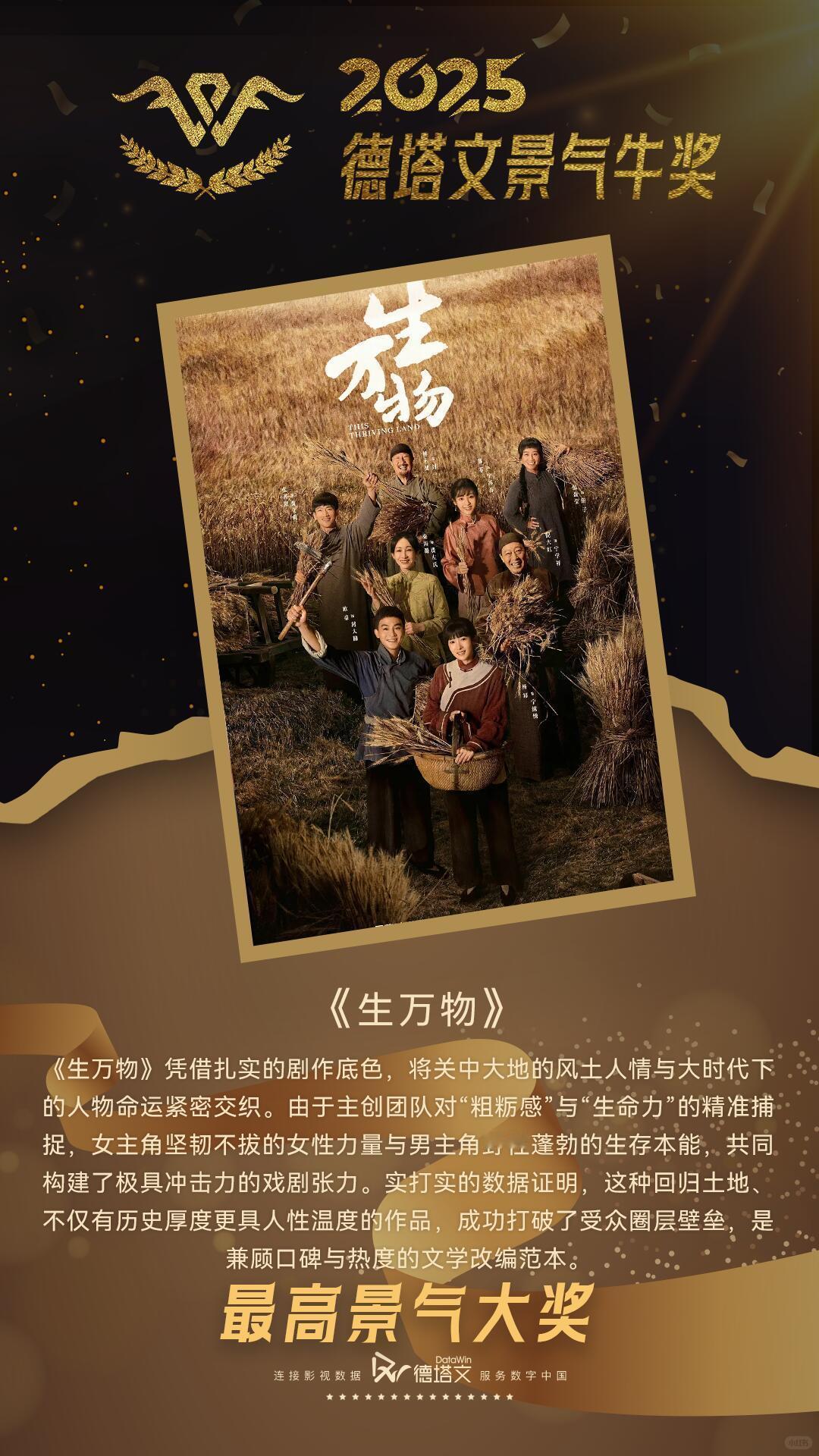 《生万物》获得2025年度德塔文最高景气大奖👏《生万物》凭借扎实的剧作底色,将关中大地的风土人情与大时代下的人物命运紧密交织。由于主创团队对“粗粝感”与“生命力”的精准捕捉,女主角坚韧不拔的女性力量与男主角野性蓬勃的生存本能,共同构建了极具冲击力的戏剧张力。实打实的数据证明,这种回归土地、不仅有历史厚度更具人性温度的作品,成功打破了受众圈层壁垒,是兼顾口碑与热度的文学改编范本。太牛了!!最高奖!杨幂生万物杨幂宁绣绣
