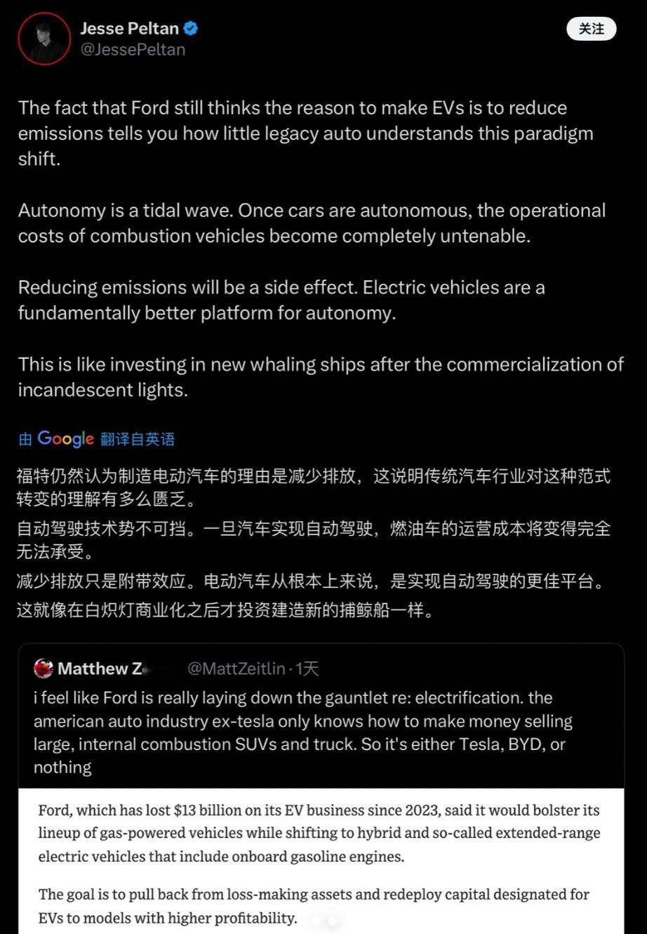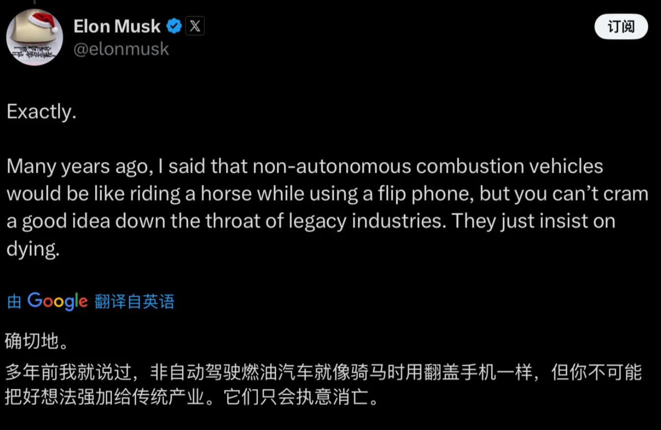 福特前脚收缩电动车战线,回头押注混动和增程。后脚马斯克 就在 X 上开嘲:非自动驾驶的燃油车,就像骑着马还在用翻盖手机。好点子救不了传统车企,他们只会一意孤行地走向衰亡。说到底,这不是谁嘴硬谁的问题,而是路线已经分叉了。一个在为当下止损,一个在为几年后清场,如果按马斯克的逻辑往前推,未来的分水岭其实不在油和电,而在“车还要不要人开”。一旦自动驾驶成熟,车辆会更高频使用、更像计算平台,成本结构和用车方式都会被重写。到那时,燃油车也好、混动也好,可能都只是过渡方案。