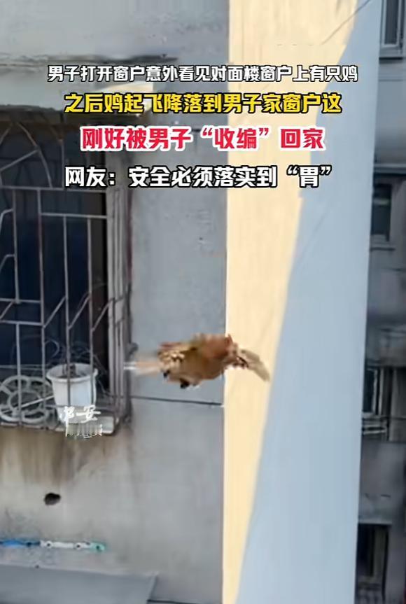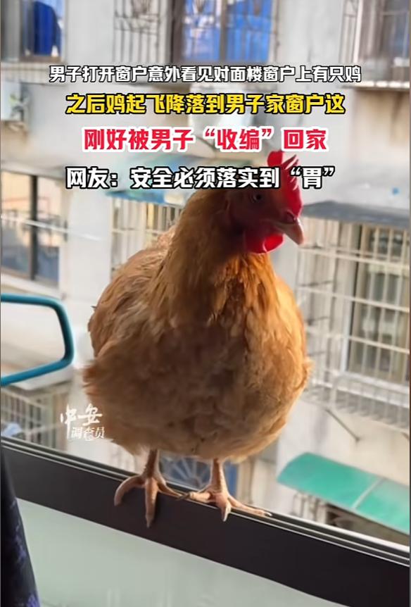 “缘分到了挡都挡不住!”12月14日,广西,一男子开窗透气,发现对面楼窗沿上有只鸡,还没等他反应过来,这只鸡突然挥动翅膀,径直落到了男子家的窗台上,面对这大自然的馈赠,男子只能将它“收编回家”。网友:安全必须落实到“胃”! 小区楼房的钢筋森林里,绿萝沿着防盗网爬成绿帘,月季在阳台开得热烈,可活鸡站在十二层楼的窗沿上——这画面比窗台摆着老南瓜还让人意外。 男子那天刚拖完地,客厅窗户留了道缝散潮气。 一抬头,对面三楼窗沿蹲着团棕黄色影子。 不是流浪猫,不是信鸽,是只鸡。 爪子在米白色瓷砖上抓出“沙沙”声,冠子随着它歪头的动作晃悠,像颗挂在细线上的红樱桃。 他下意识摸手机想拍,鸡突然扑腾了下翅膀。 对面那户的防盗网锈迹斑斑,网眼大得能塞进他的拳头,可窗沿只有五厘米宽——这鸡是怎么站稳的?总不能是从顶楼天台飞过来的吧? 风从两栋楼之间挤过来,带着楼下便利店关东煮的香味。 鸡突然伸长脖子叫了声“咯——”,尾音拖得老长,像在跟谁打招呼。 下一秒,它双脚蹬地,翅膀张得像把小扇子,竟然直直朝他这边飞过来。 距离不到两米,他甚至看清了它爪子上沾着的片枯树叶。 “咚”一声,鸡落在他家窗台,带起的风掀翻了他早上放的多肉花盆。 他愣了三秒才伸手去抓,鸡没躲,顺着他的胳膊就蹲到了地板上,还啄了口他拖鞋上的绒毛球。 笼子是从储藏室翻出来的旧兔笼,鸡站进去时,尾巴刚好扫到笼门。 男子盯着鸡看了半小时,越看越觉得蹊跷:这鸡羽毛顺滑,爪子干净,倒像是刚从鸡窝里溜达出来的——谁家的鸡能溜达进十二楼的窗沿? 业主群里有人说,七楼李奶奶上周刚买了两只土鸡,“养在阳台准备过年宰”。 也有人发照片:昨天下午看到只鸡在小区天台栏杆上散步,“还以为是哪个小孩的玩具”。 鸡在笼子里啄了口他撒的小米,突然抬头看他,眼神清亮。 网友刷到视频时,关注点早就跑偏了。 “这哪是鸡,是老天爷派来的外卖!” “建议直接白切,蘸沙姜酱——安全必须落实到胃!” 男子把手机递给鸡看,鸡歪着头啄了下屏幕。 他突然笑了:管它是谁家的,缘分这东西,有时候就藏在一阵风、一扇窗,和一只突然闯进生活的鸡里。 现在鸡正趴在阳台晒太阳,笼子门开着。 它没飞走,只是把脑袋埋进翅膀里,像在做一个关于十二楼窗沿的梦。