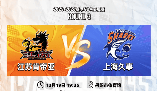 虎扑12月18日讯据江苏男篮官方发文,12月19日19:35,2025-26赛季CBA常规赛第三轮,江苏肯帝亚将坐镇主场丹阳市体育馆,迎战劲旅上海久事。