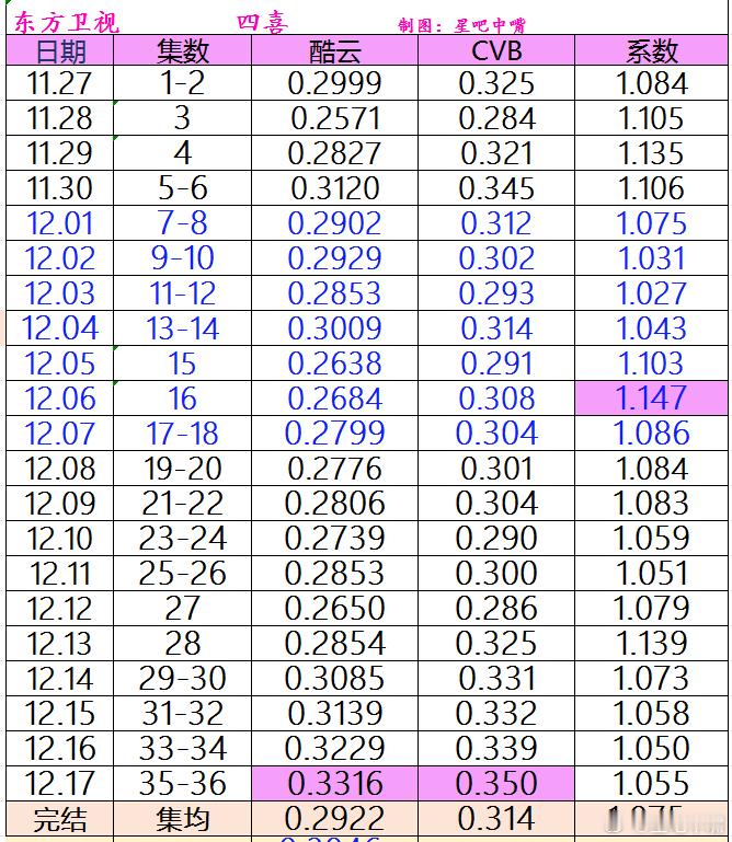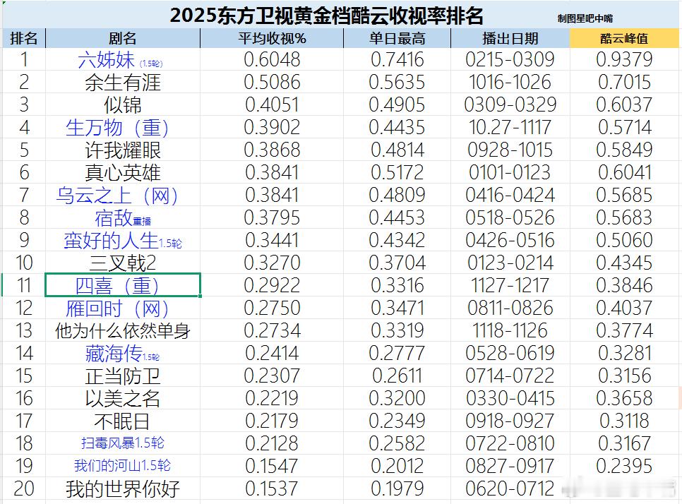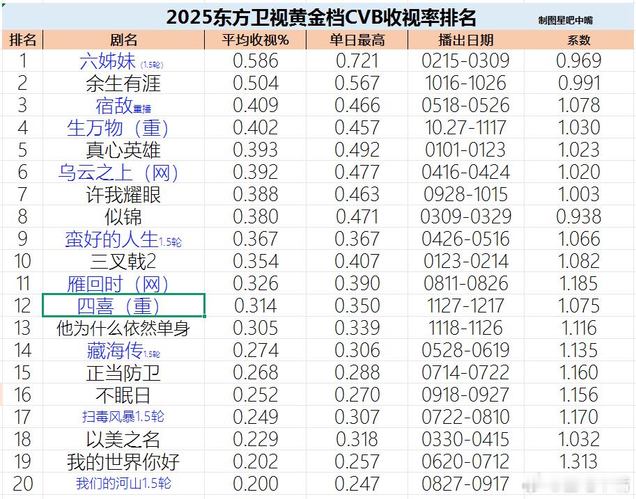 东方卫视《四喜》收官战报。至此东方卫视2025年度收视率排名尘埃落定四喜酷云集均:0.2922,暂列11/20四喜CVB集均:0.314, 暂列12/20