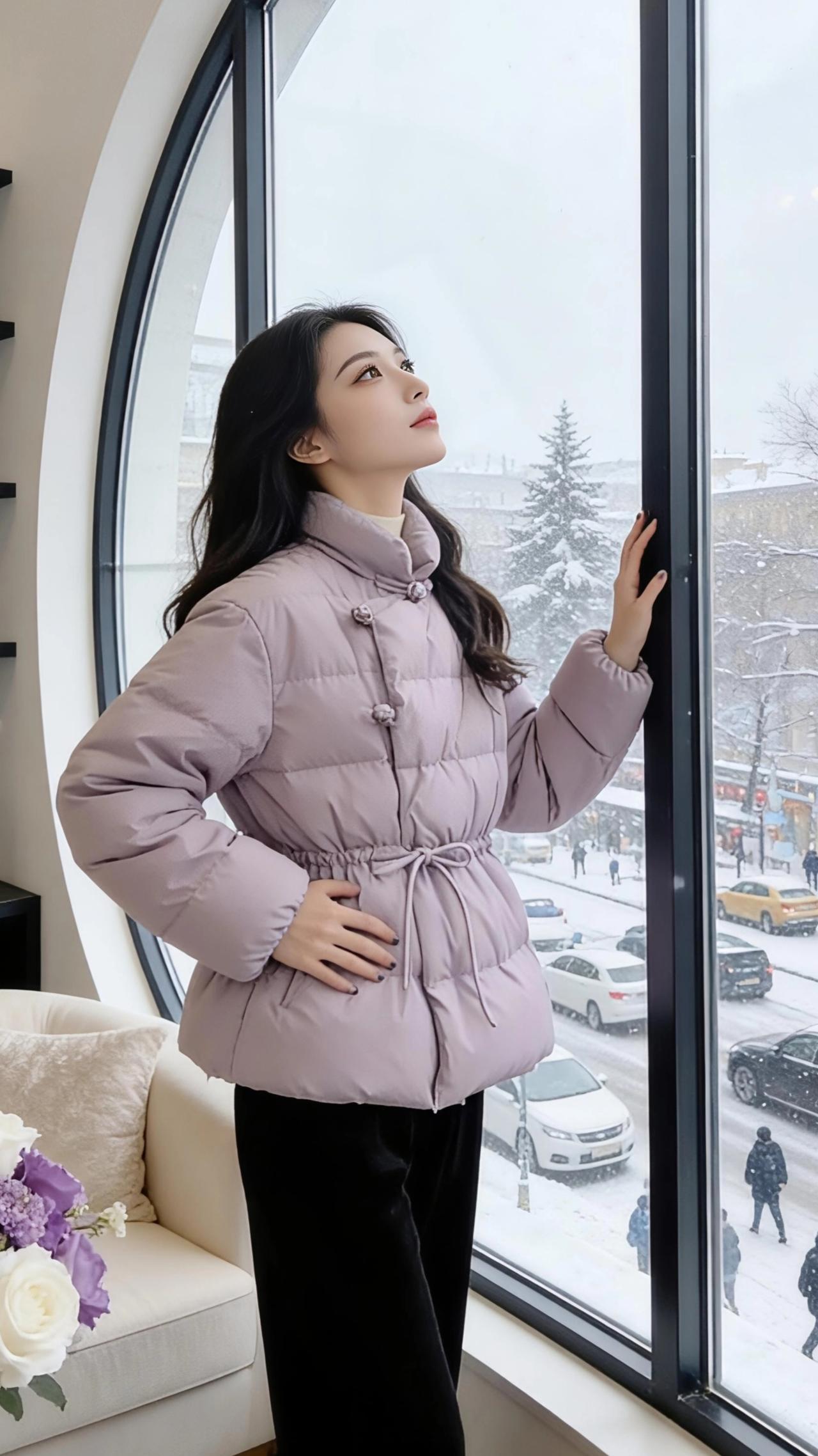 窗畔的雪意 落地窗前的紫调羽绒服,像揉碎了的淡紫晚霞,坠在冬日的风里。我倚着冰凉的窗沿,指尖触到玻璃上凝着的薄凉,目光穿过层层雪雾,落向窗外被白雪裹住的街景。 行道树的枝桠托着蓬松的雪,像缀满了白色的绒球,车辆碾过积雪的声响隔着玻璃变得模糊,行人们裹紧大衣的身影,在雪色里成了移动的墨点。这一方窗,像画框般框住了冬日的盛景,室内的暖光与窗外的寒雪撞个满怀,竟生出几分温柔的对峙。 抬手抚上窗框的黑棱,仰头时,雪花正贴着玻璃缓缓滑落,像无声的诗。忽而想伸手去接,脚踩上台阶的瞬间,裙摆扫过身旁的花束,紫玫瑰与白玫瑰的馥郁混着雪的清冽涌来,便索性张开双臂,让自己融进这冬日的浪漫里。 雪还在落,捧着两支花转身时,羽绒服的软暖裹着周身,才发觉这冬日的美好,从不是躲在暖处远离风雪,而是站在窗畔,既拥着室内的温,又看得见窗外的雪,在冷暖交织里,接住这一季的温柔。 高级感穿搭 时尚穿搭 棉服外套 冬季穿搭