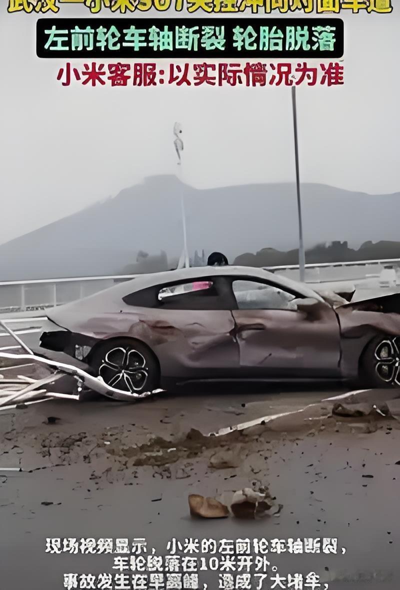 安徽小米SU7撞翻30米护栏!前轮飞掉、电机外露,网友吵翻:是车不行还是人开飘? 安徽合肥街头上演惊魂一幕!12月16日早高峰,一辆小米SU7在瑶海区皇藏裕路直接撞穿中央护栏,30多米护栏被撞得粉碎散落路面,车子前轮双双脱落、车头撞烂电机外露,现场堪比电影特效,好在没撞上对向邮政车,否则后果不堪设想! 先看现场有多惨烈: 从网友拍的视频能看到,这辆SU7前脸完全变形,保险杠、引擎盖碎成零件,原本该在车轮位置的地方空空如也,两个前轮都被撞飞,电机裸露在外看着触目惊心。被撞毁的护栏断成多截,横七竖八躺在路面,事发路段早高峰车流密集,交通一度拥堵,好在护栏维保单位和交警火速到场处理,很快恢复通行。 目击者爆料关键细节: 事故发生在早上7点左右,车上坐了两个人,其中一人下车后走路一瘸一拐,不确定是撞击导致受伤还是本身有健康问题。更让人揪心的是,有路人说车子是“前轮脱落后才勉强刹停”,差一点就撞上对向车道正常行驶的邮政车,想想都后怕!